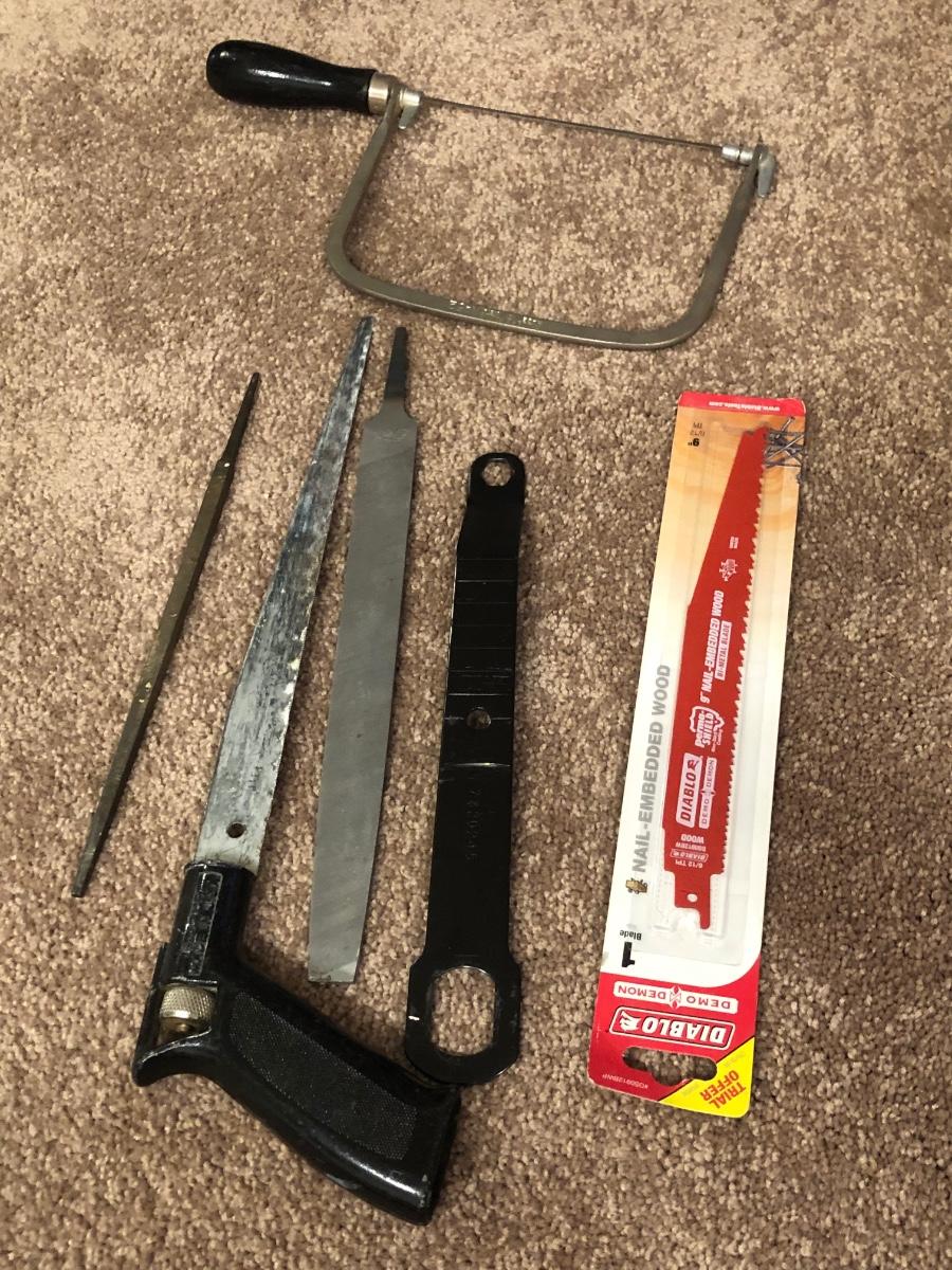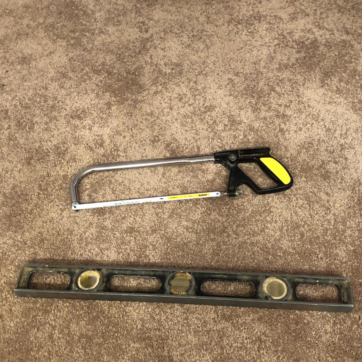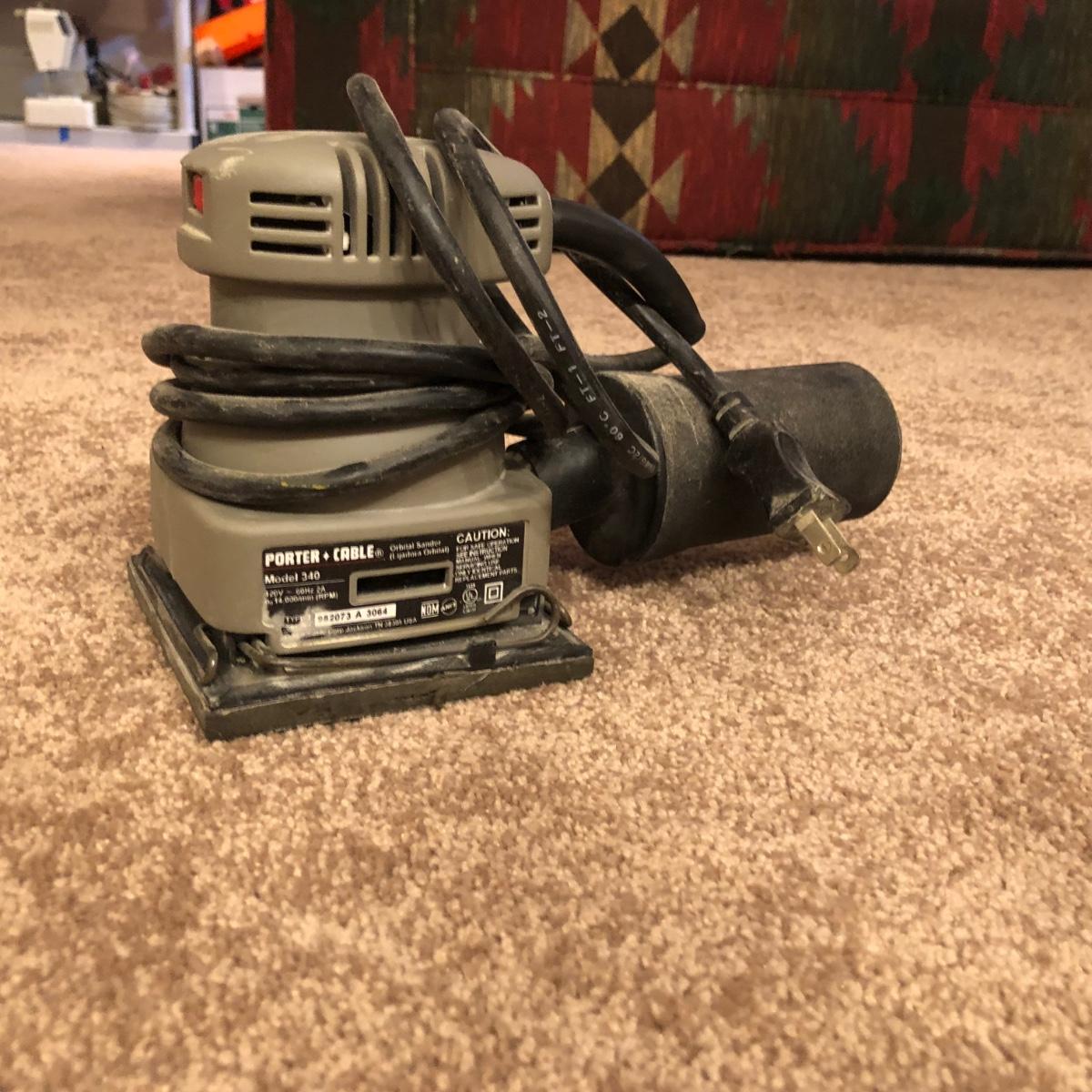 LOT 185M: Porter Cable Orbital Sander Model 340, Stanley Level, Stanley Hand Saw w/ DeWalt Blade, Sears/Craftsman Dovetail Joint Fixture in Box & More
