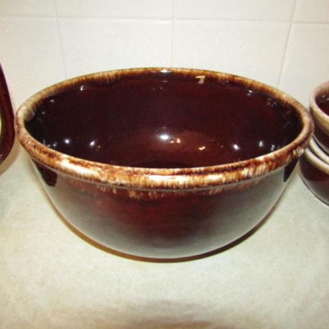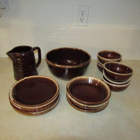 6 BOWLS, 4 SHALLOW DISHES, 6 SALAD PLATES, SERVING BOWL AND BROWN CLAY PITCHER