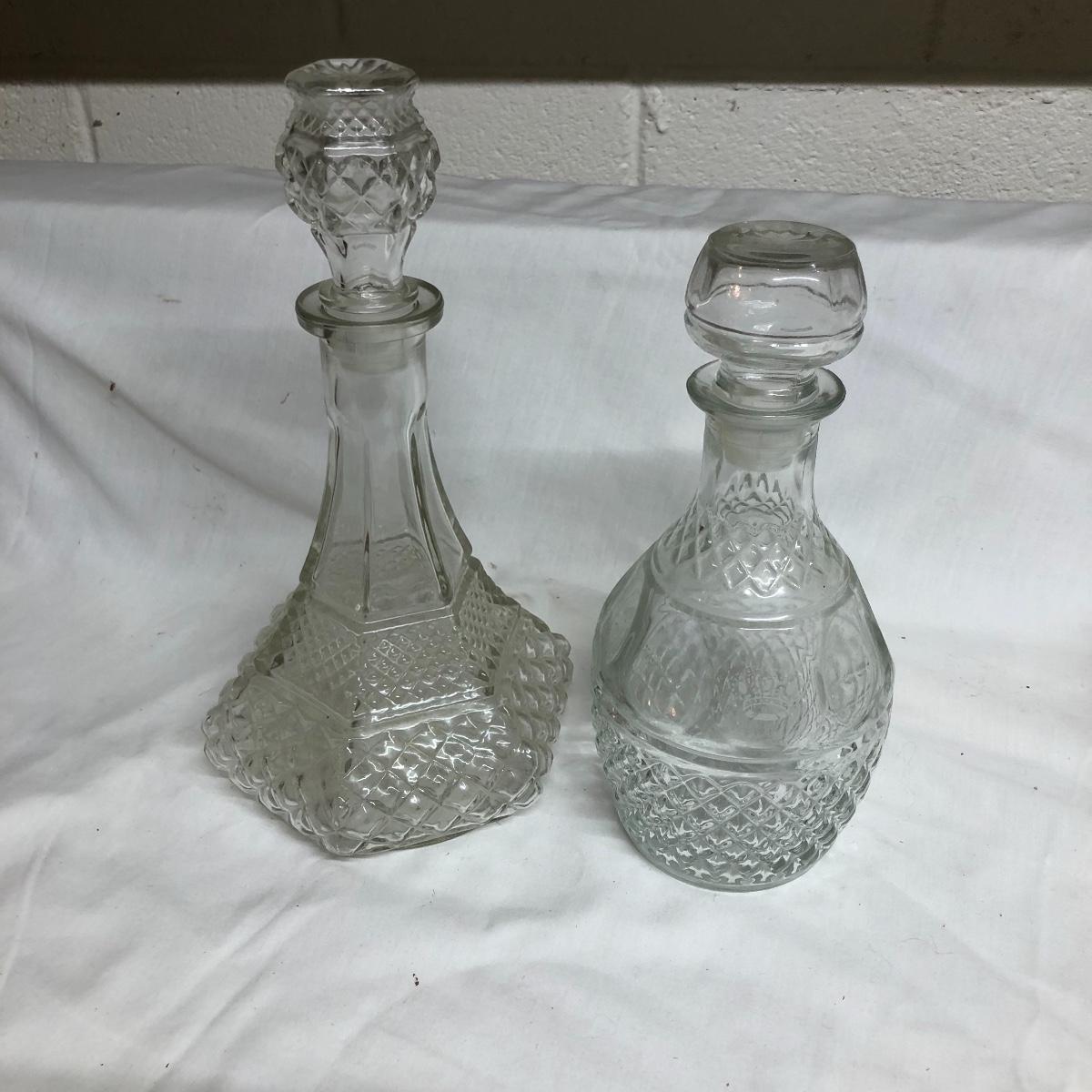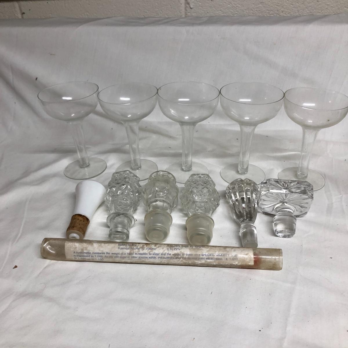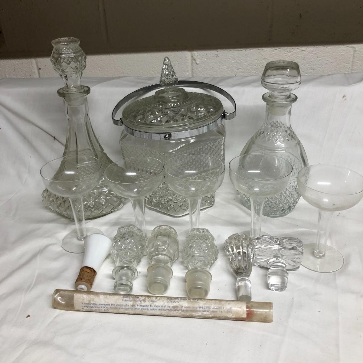 Be ready for your next get together with this array of decanters and more. Lot includes two decanters, ice bucket with tongs, five champagne glasses, six bottle stoppers and a triple scale beer and wine hydrometer. Ice bucket measures 8”D x 11” tall.