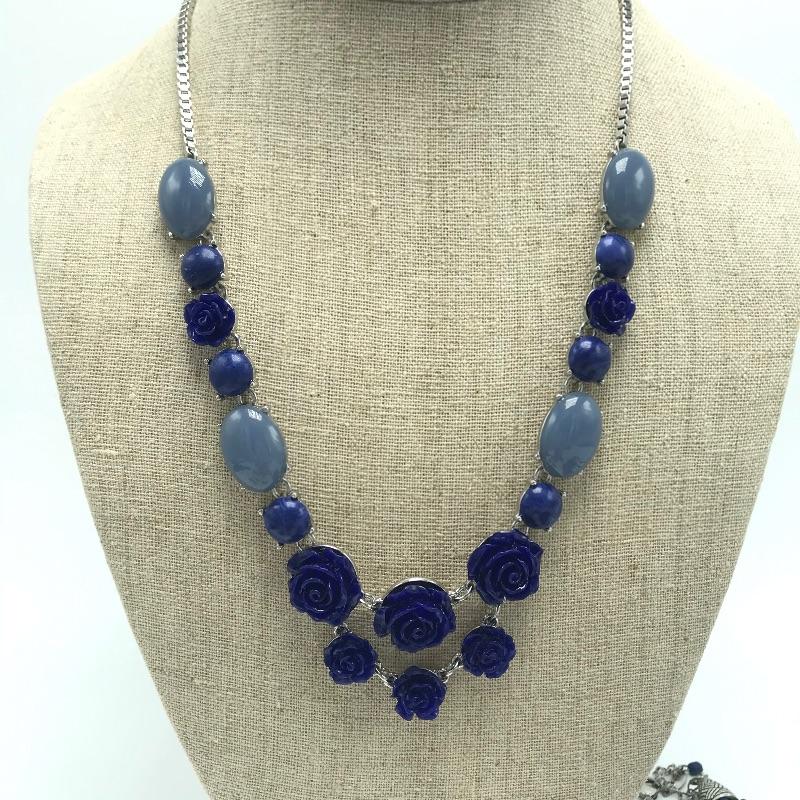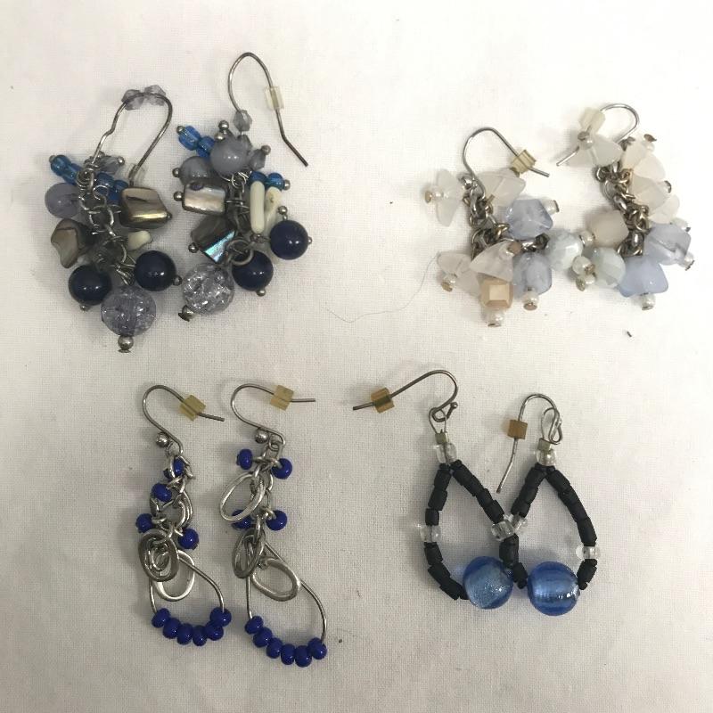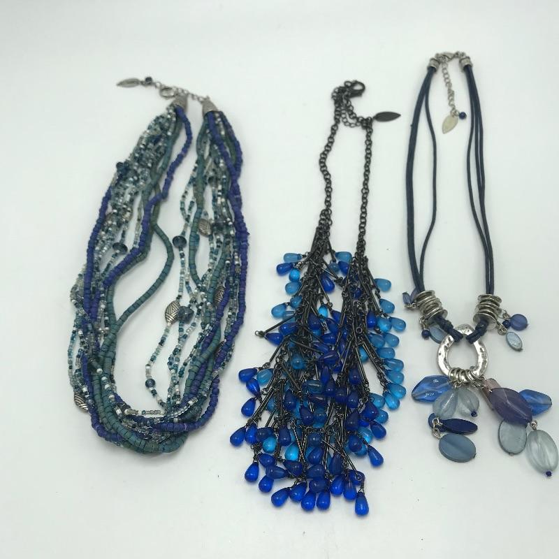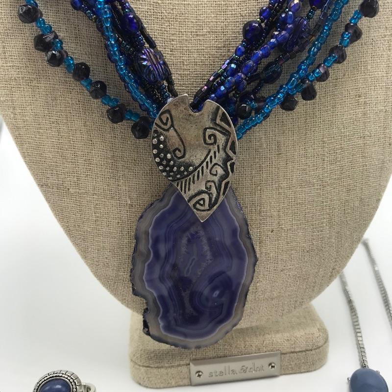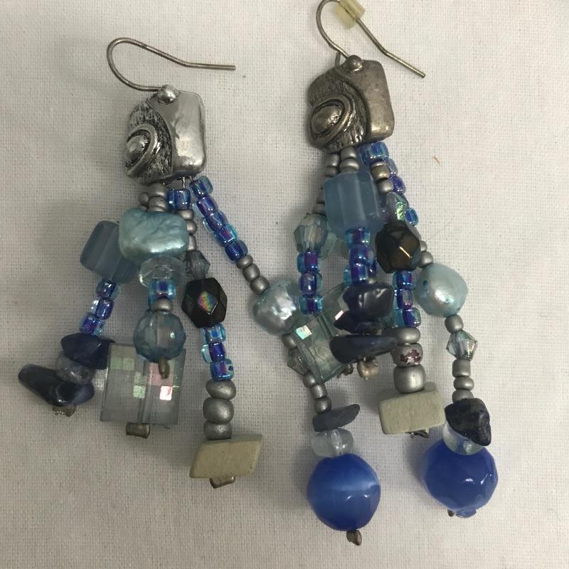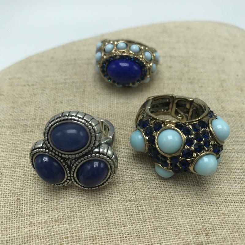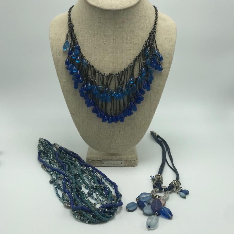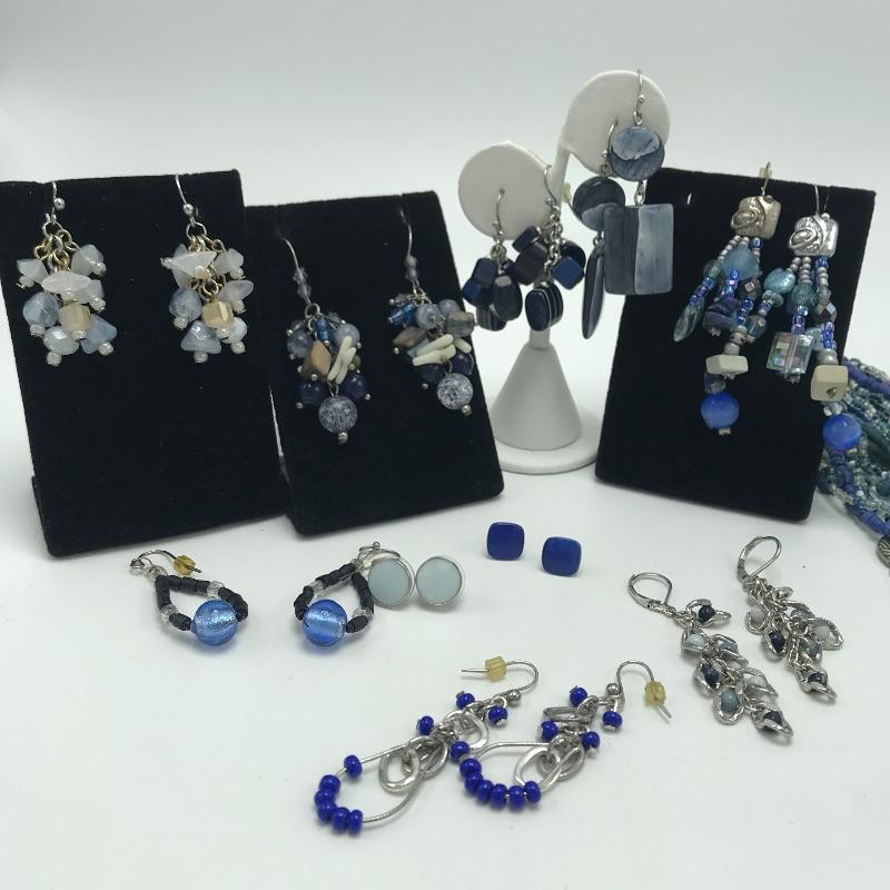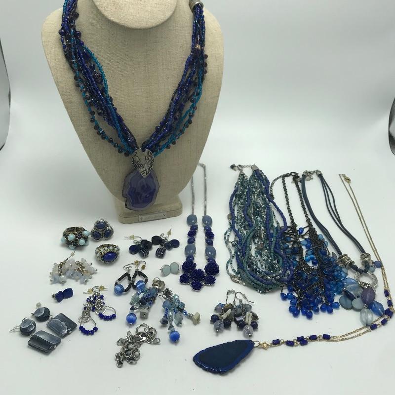 Stunning blue colors in this lot with rings, earrings for pierced ears, and necklaces. Many necklaces are beaded and three are from Coldwater Creek. Lot features three expandable rings and many dangle earrings. Stones on necklaces are faux.