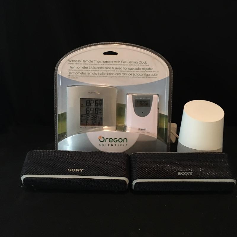 Lot includes Google home speaker, pair of Sony portable Bluetooth speakers model # SRS -XB21, wireless remote thermometer with self setting clock and a pair of Tasco binoculars. Google home speaker wire is a little worn but worked when tested, Sony speakers could not be tested as the need mini USB to charge.