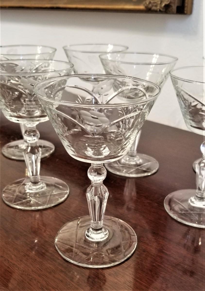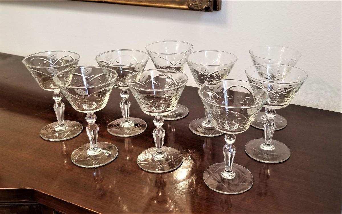 These glasses match the set in Lot #22. Vintage crystal - very pretty, great condition. 9 pieces. Each stands 5.5" tall.