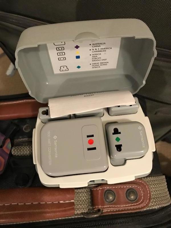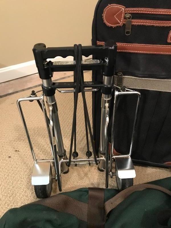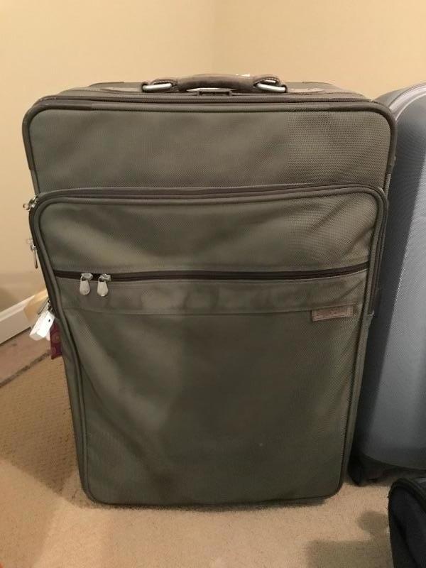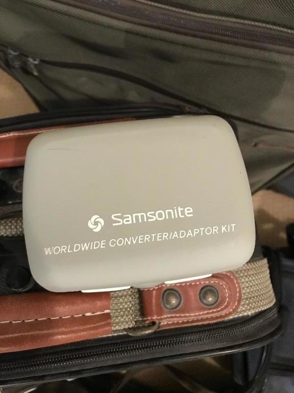 Lot of travel items. Suitcases: Samsonite, Briggs & Riley, Travelpro. Duffel bags: Cabelas, Hippo Golf bag, 2 pet carriers, luggage cart and a Samsonite worldwide converter adapter kit