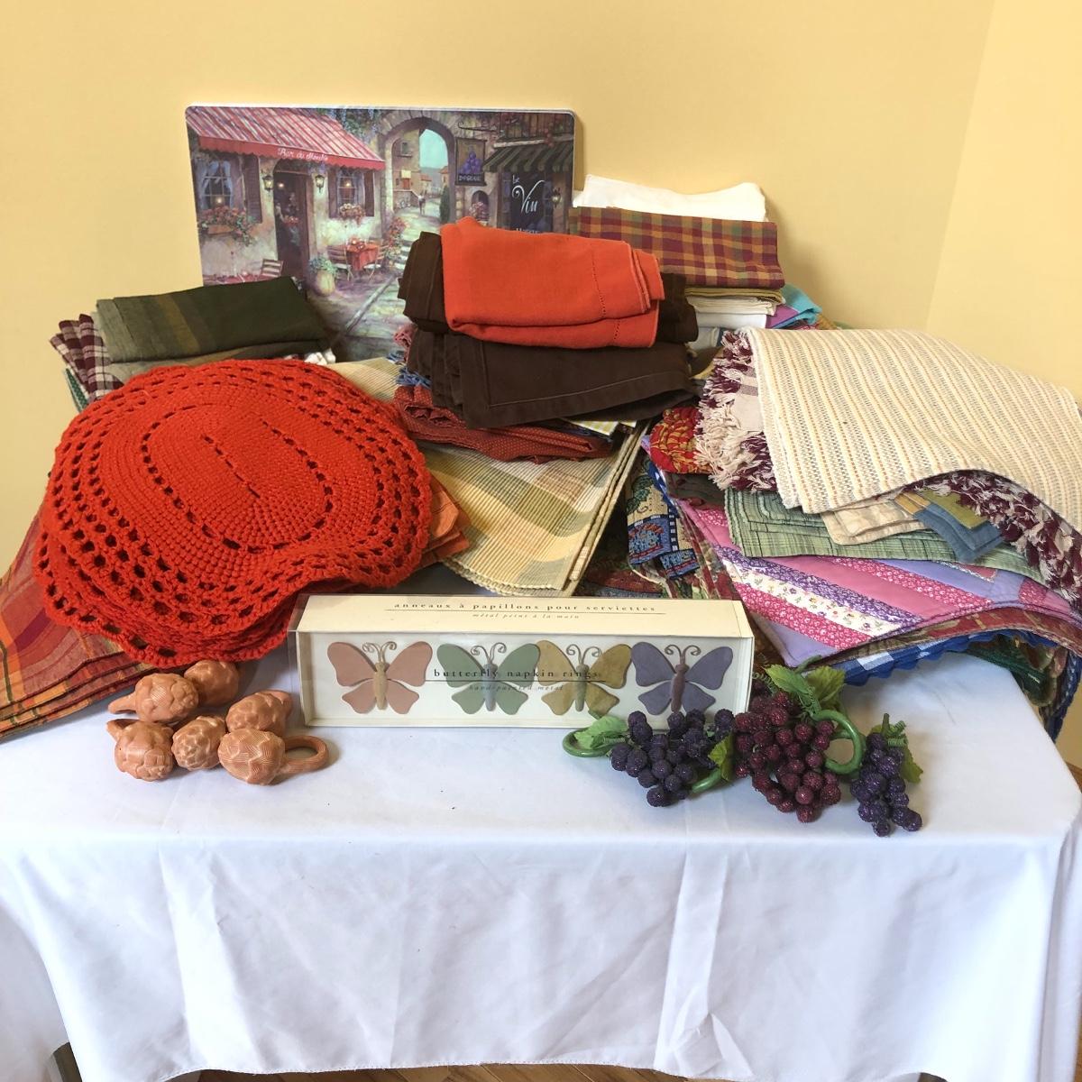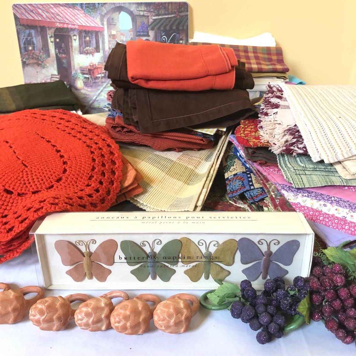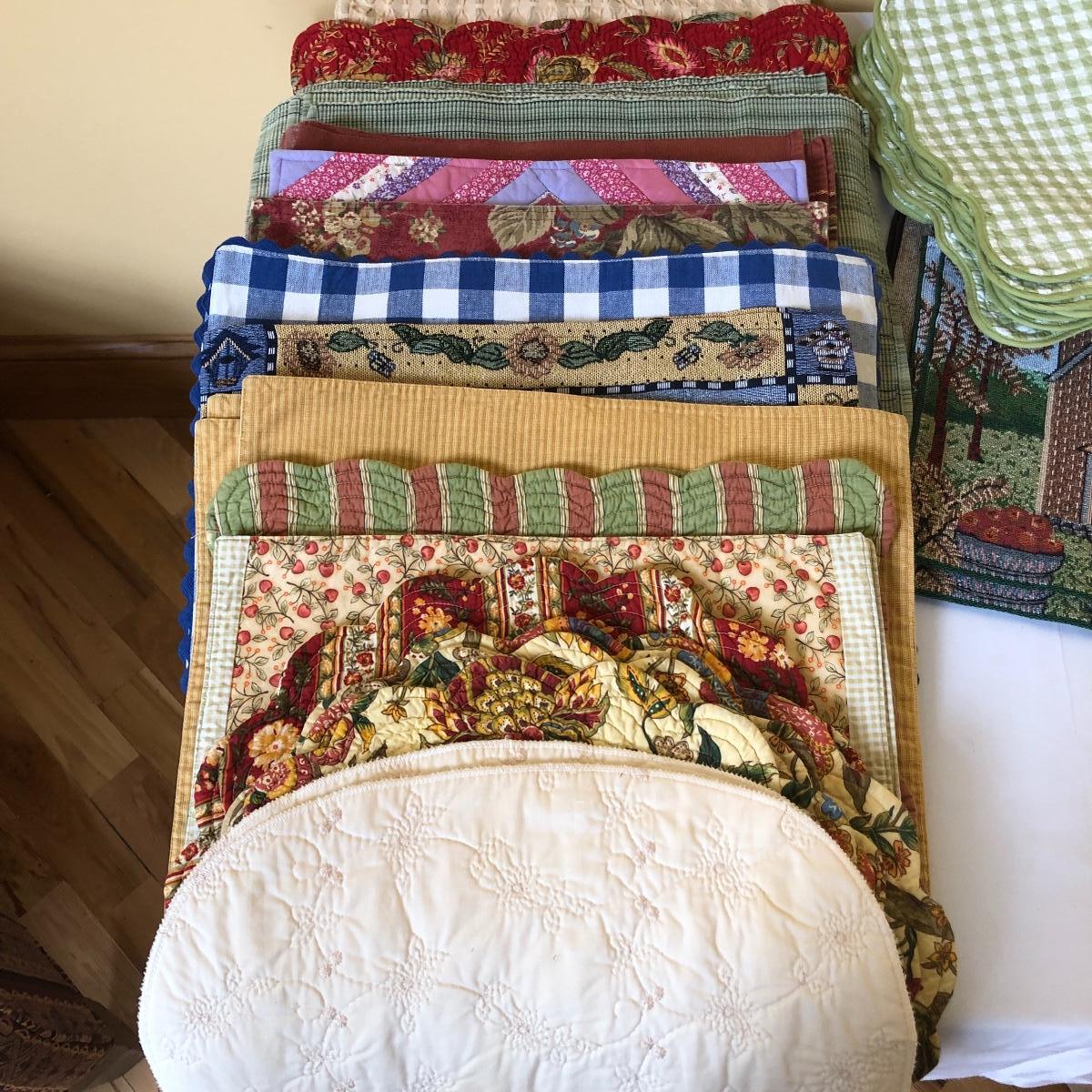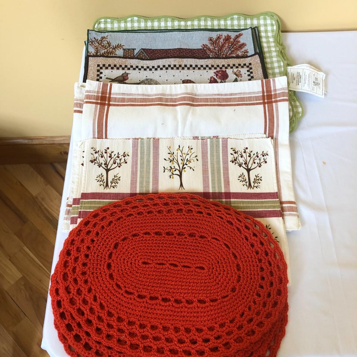 This huge assortment of placemats and napkins will satisfy every color palette; from cream to burnt orange, floral to stripes and not forgetting seasonal, this lot has it all! The majority of the placemats and napkins come in matching sets of four to six with a few with more and a few with less and are in good condition. Also included are some napkin holders; one of the three sets is new in box. The large foam placemats of a French street measure 14” x 18”.