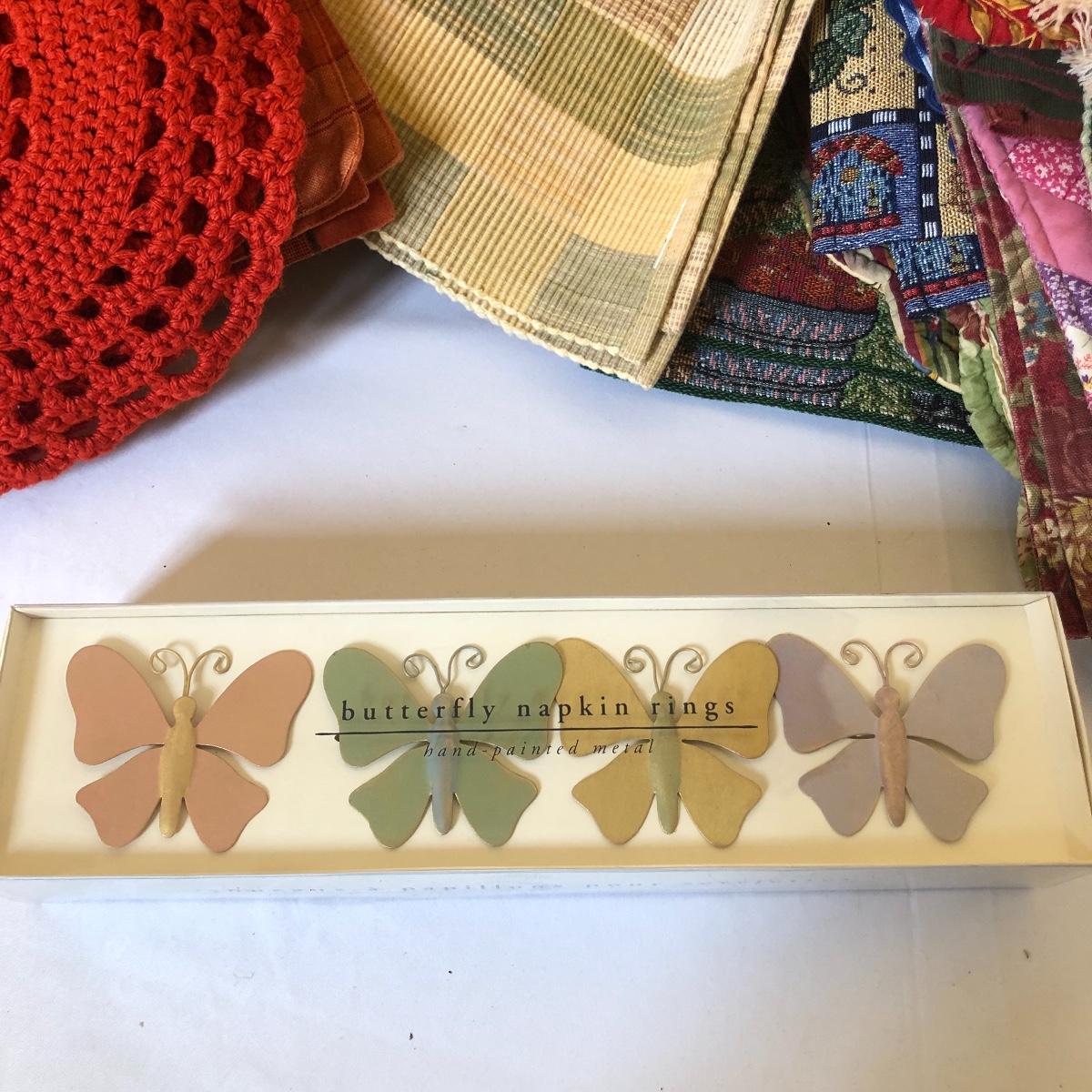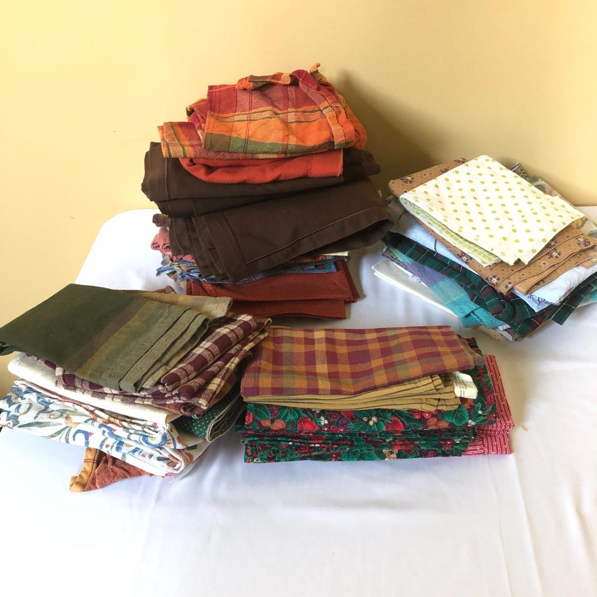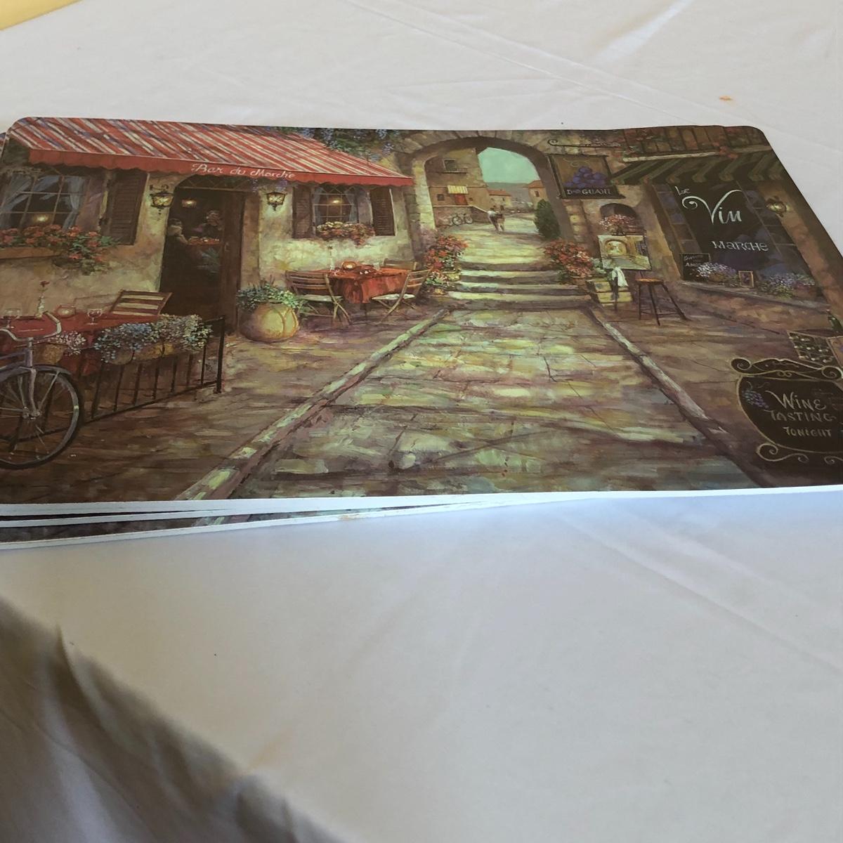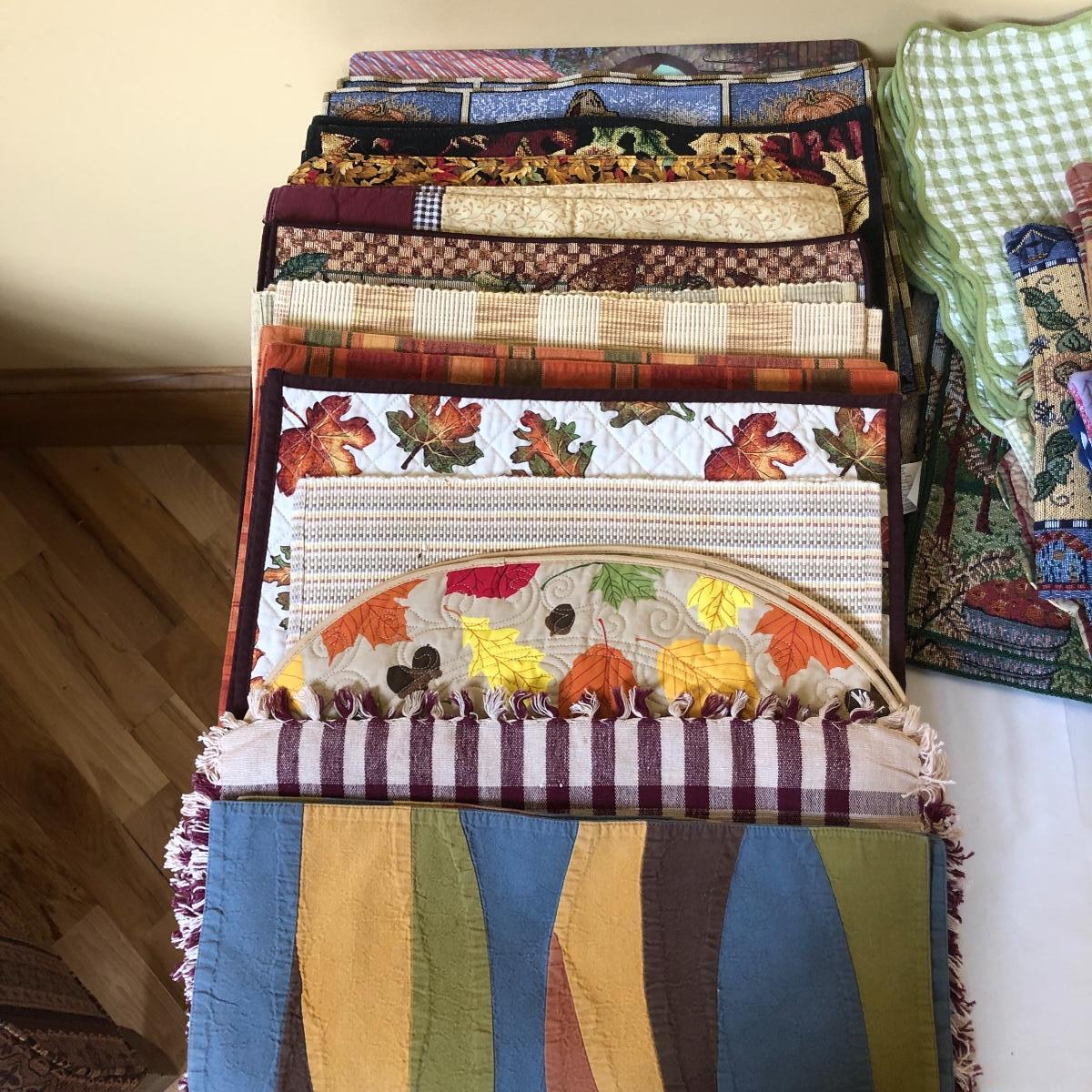 This huge assortment of placemats and napkins will satisfy every color palette; from cream to burnt orange, floral to stripes and not forgetting seasonal, this lot has it all! The majority of the placemats and napkins come in matching sets of four to six with a few with more and a few with less and are in good condition. Also included are some napkin holders; one of the three sets is new in box. The large foam placemats of a French street measure 14” x 18”.