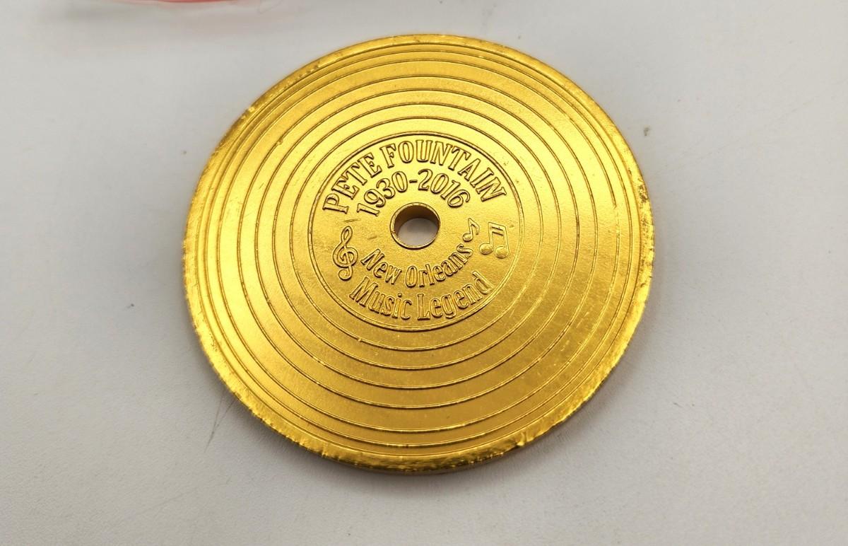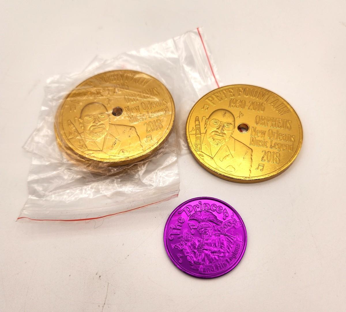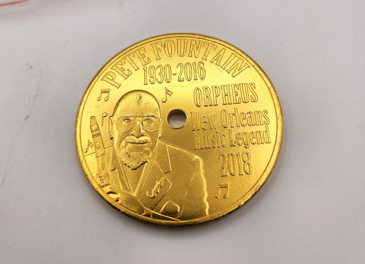 Group of 4 Metal Coasters from the Krewe of Orpheus honoring Pete along with a doubloon from Pete's Half Fast Marching Club dated 2004. The coasters are 2.5" across and unused. These were issued in 2018 and recognize Pete as a New Orleans Music Legend. Rather scarce.