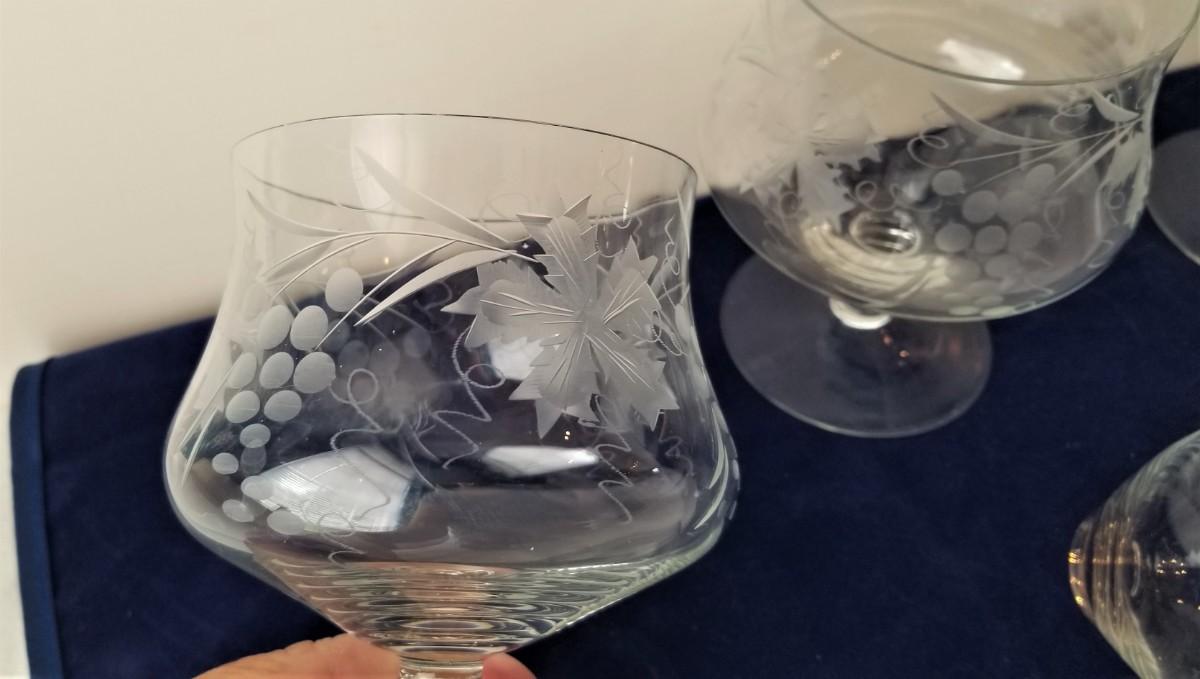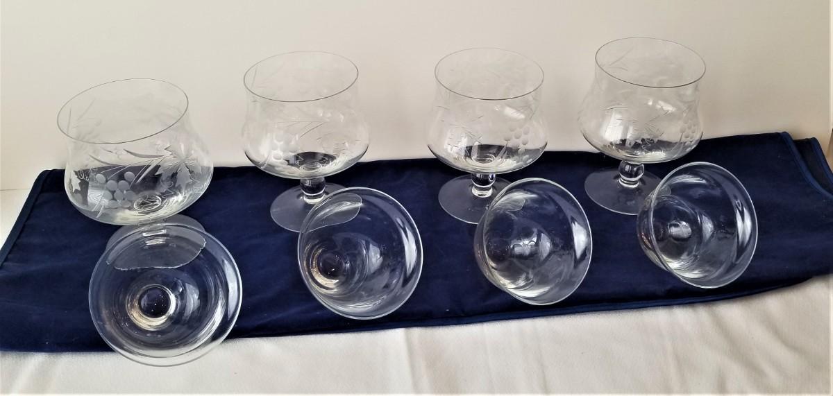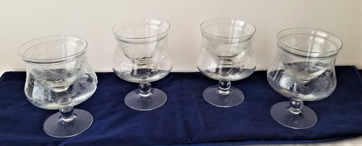 Very pretty set of 4 delicate acid-etched shrimp cocktail containers - Grape pattern - 5.5" tall, All good condition.