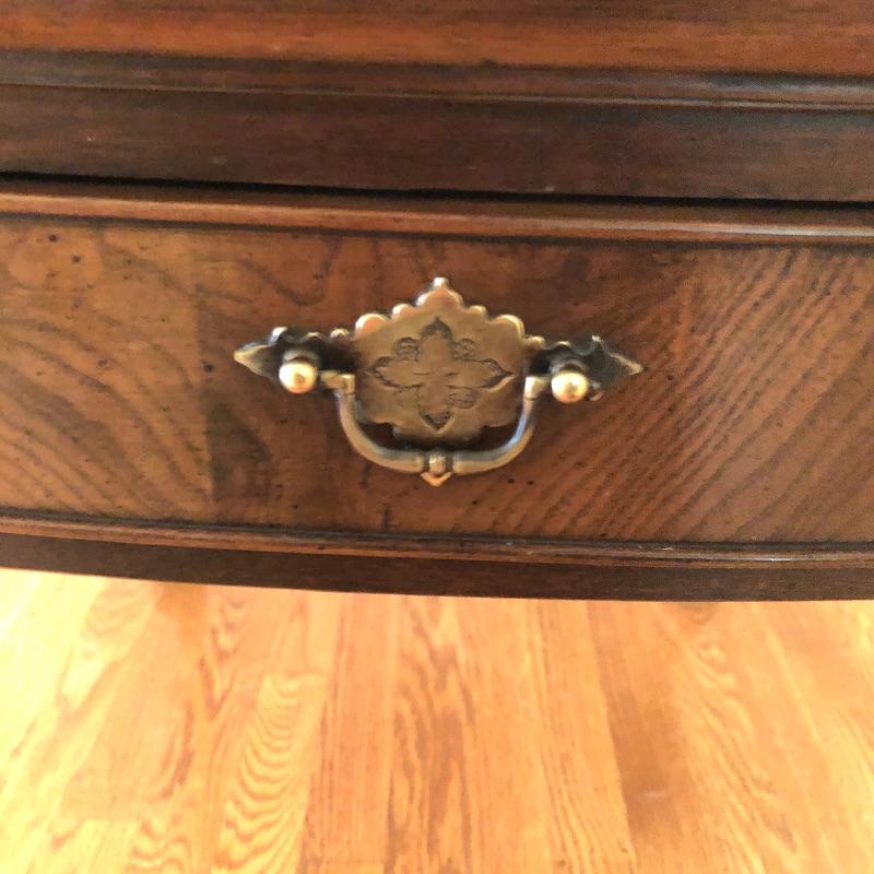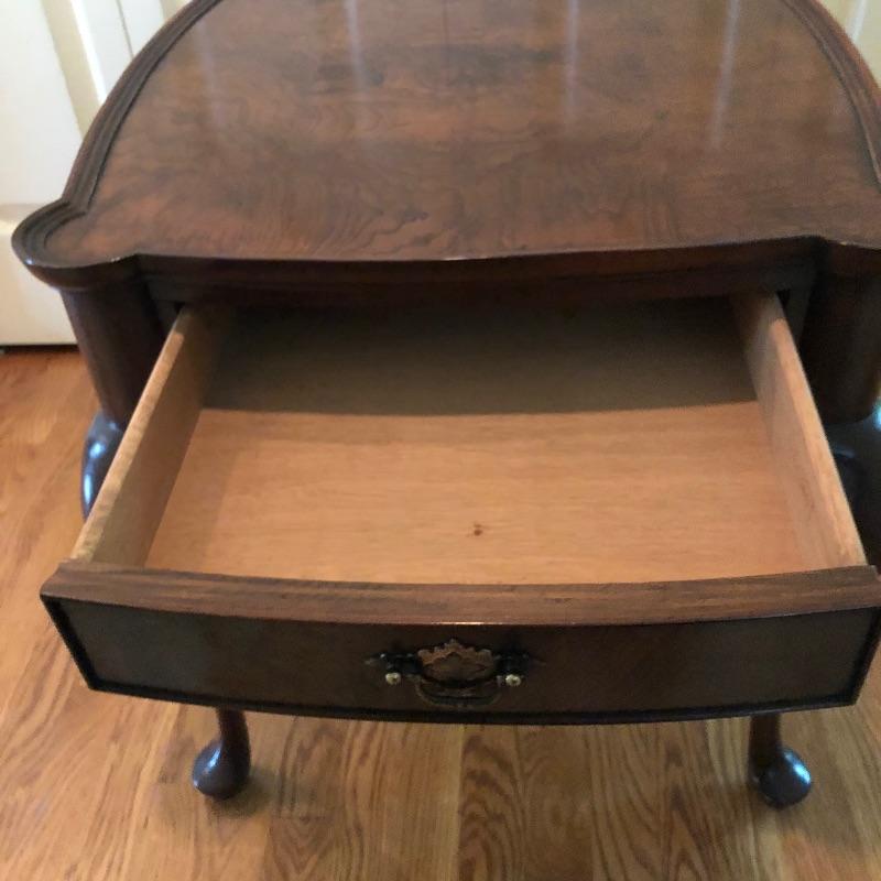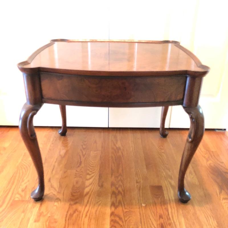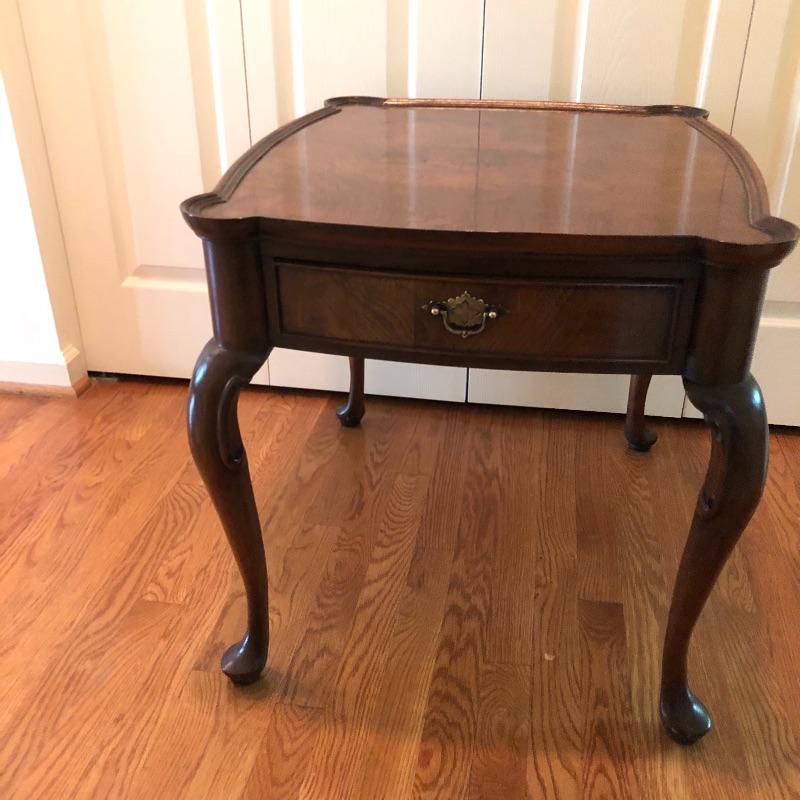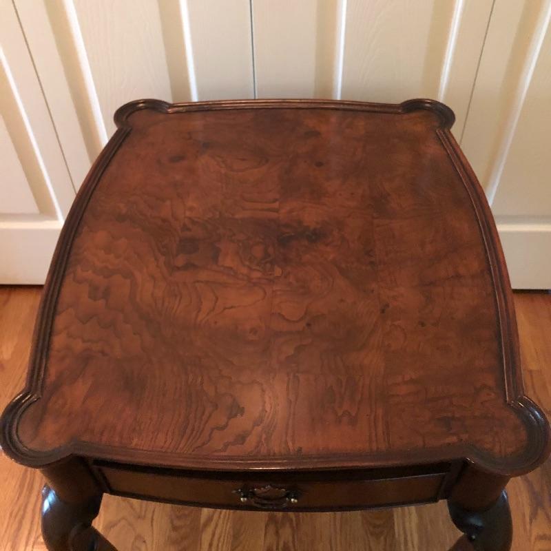 A beautiful Hekman side table will look great in your home. Table has cabriole style legs, a dovetailed drawer and has a reddish hue, see pictures. The top appears to be a collection of square pieces, see pictures.