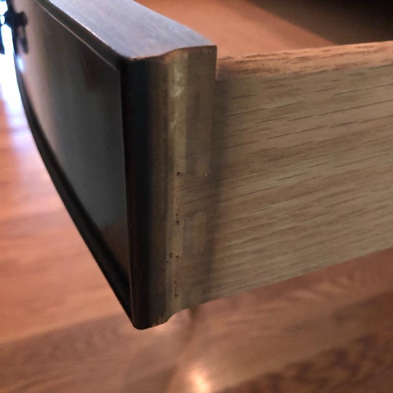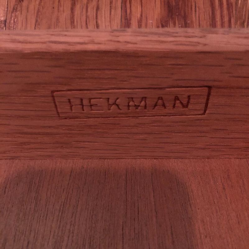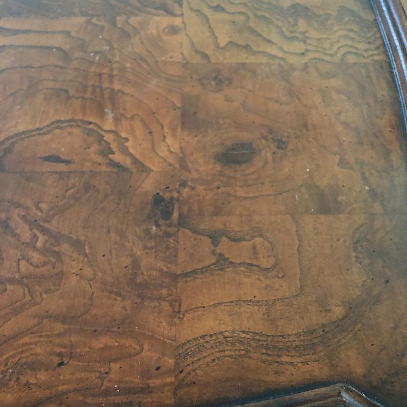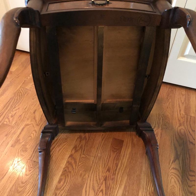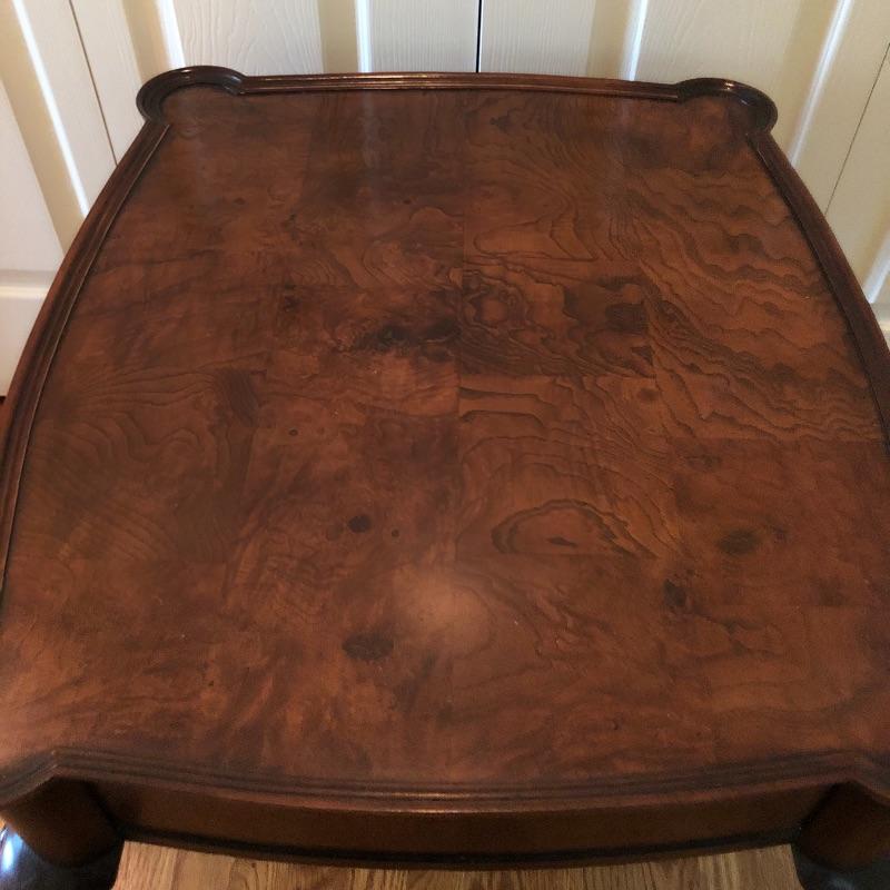 A beautiful Hekman side table will look great in your home. Table has cabriole style legs, a dovetailed drawer and has a reddish hue, see pictures. The top appears to be a collection of square pieces, see pictures.