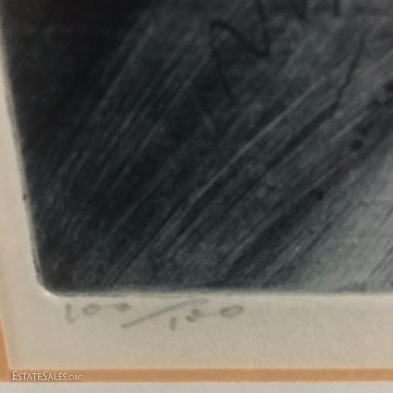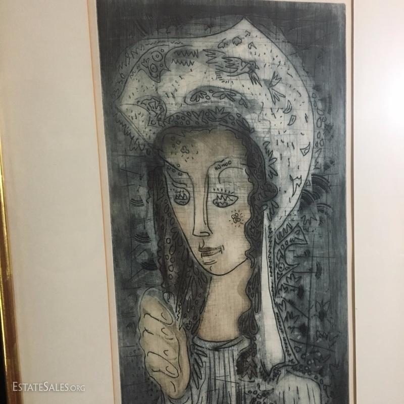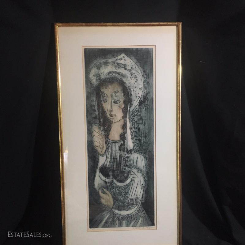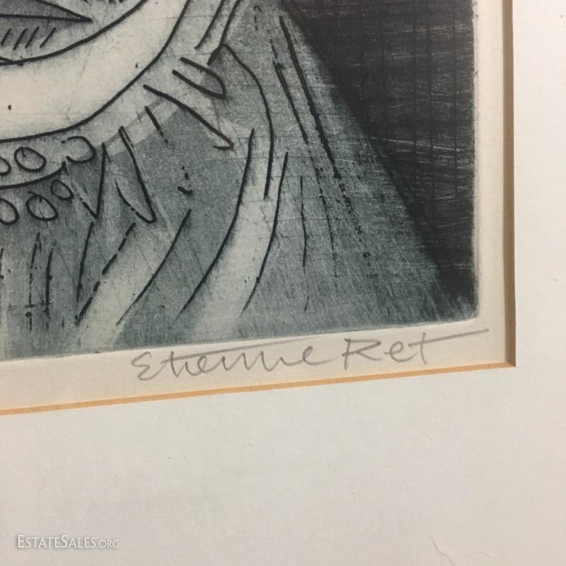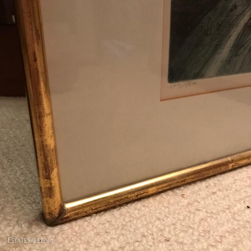 Beautiful blue tones in this signed limited edition Etienne Ret framed art. Subject is a woman with veil and nice dress. Colors may not convey in photos. Wonderful piece for your collection. Matted and framed in gold frame. 32"l x 17"w