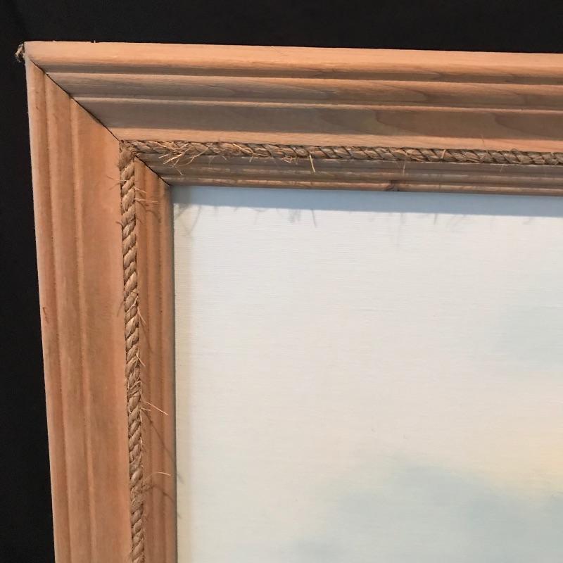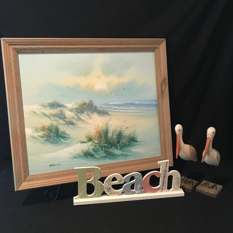 Lovely beach scene painted on canvas in a rope bordered wooden frame. Piece is signed and appears to be Antonio, see photos. Can not verify if it is an original or reproduction. Wooden frame measures 28” x 24”. Lot also brings you to the seaside with a pair of wooden pelicans and beach decor. See photos. Shipping available. Shipping art can be costly, please call UPS with dimensions at 828-252-6930 for a shipping quote prior to bidding.