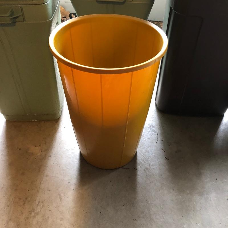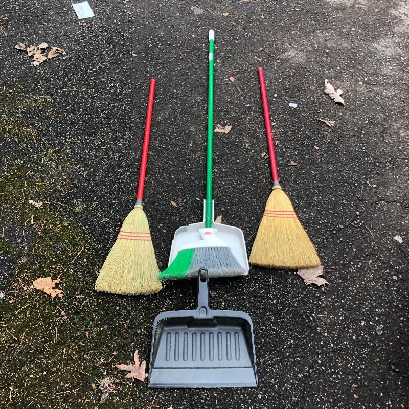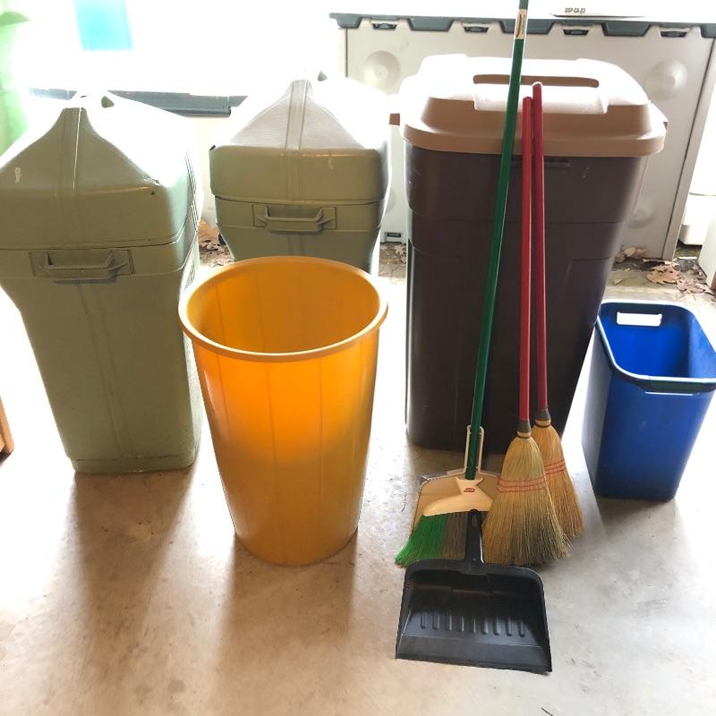 Three lidded trashcans and two smaller lidless cans are accompanied by three brooms.
