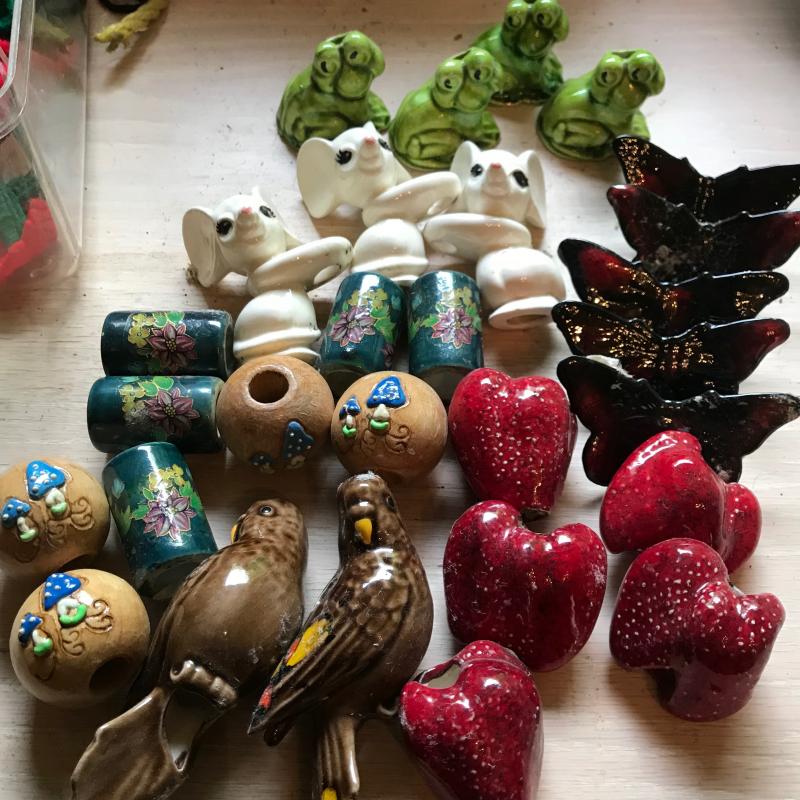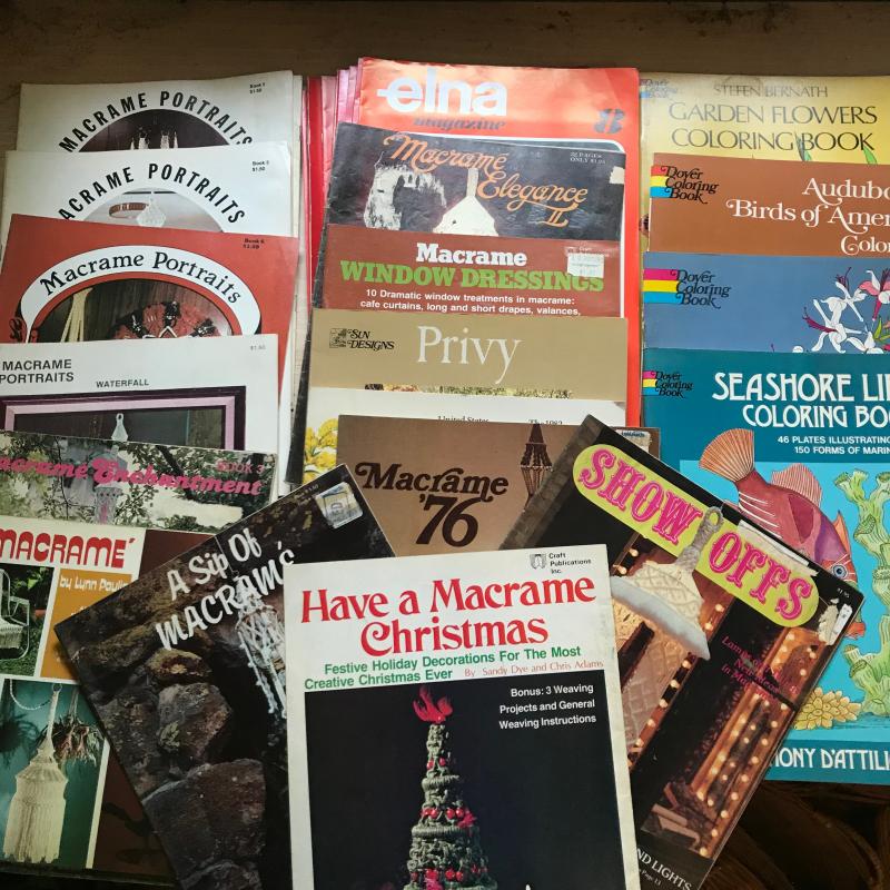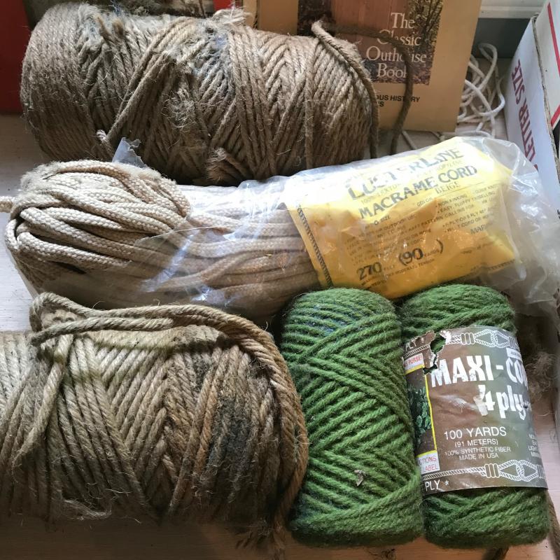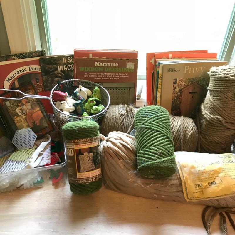 Vintage macrame materials including beads, macrame books, thick yarn (including jute), and misc. crafting materials. Shipping available or local pickup.
