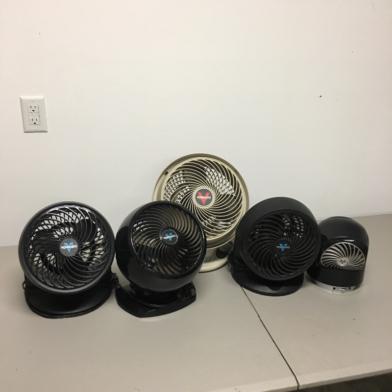 Beat this hot summer heat with these Five Vornado fans. One fan oscillates. Largest fan measures 12.5”D 13” tall.
