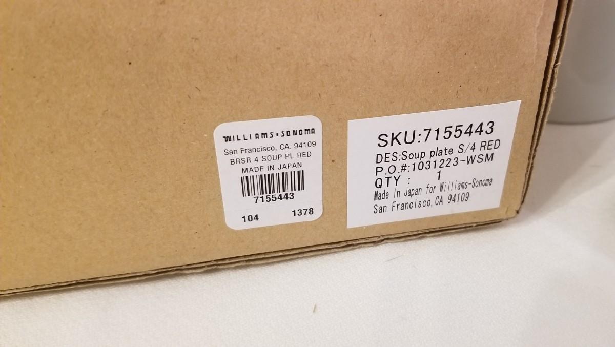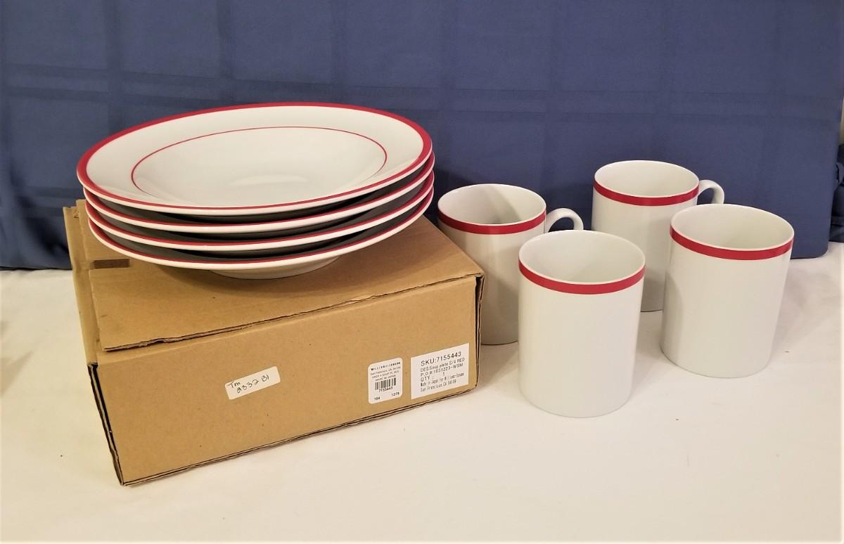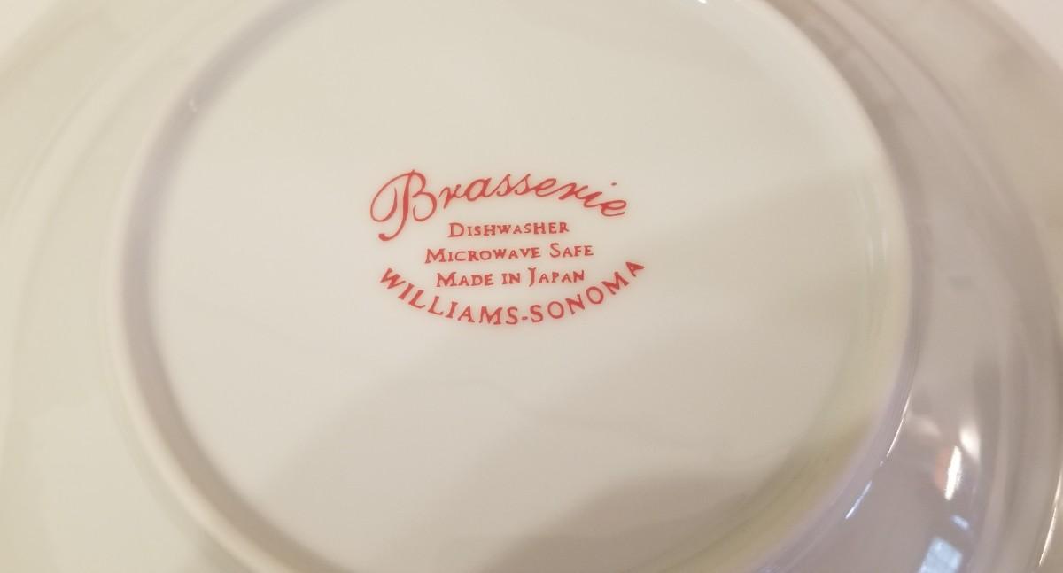 This Williams -Sonoma dinnerware set is new in box - we opened them to check for damage and get a photo. You get 8 Soup Plates and 4 mugs. They are done in the "Brasserie" pattern. 9" across