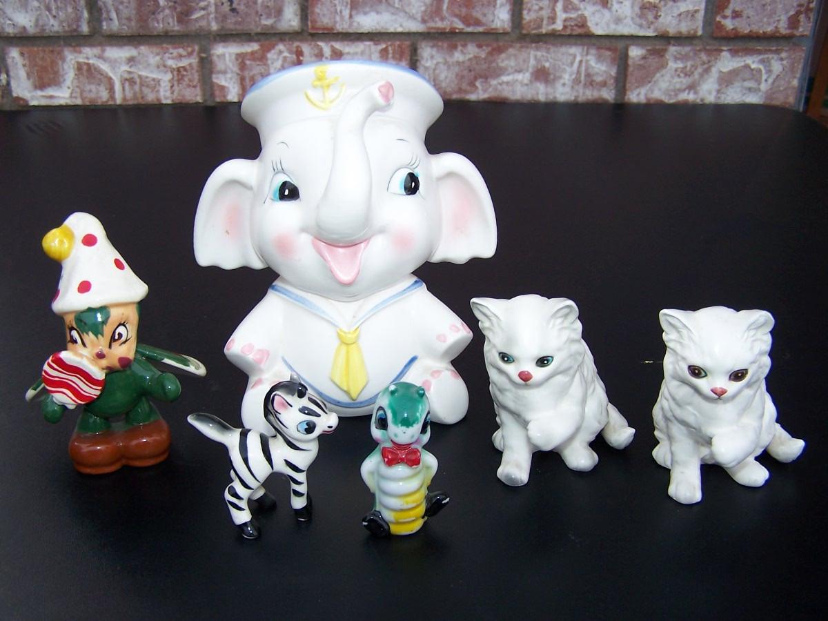 THESE ARE WONDERFUL VINTAGE CRITTERS!!! SOME ARE MARKED... THE IMARCO ELEPHANT VASE IS 6 3/8'' TALL... THE BUG HAS A GLUED WING, AND A CAT HAS A CHIPPED EAR, OTHERWISE, LIGHT WEAR...
