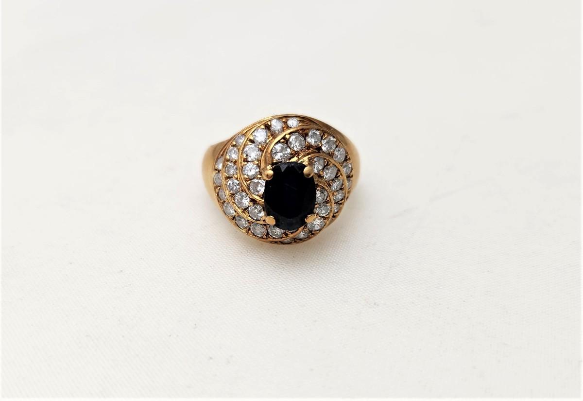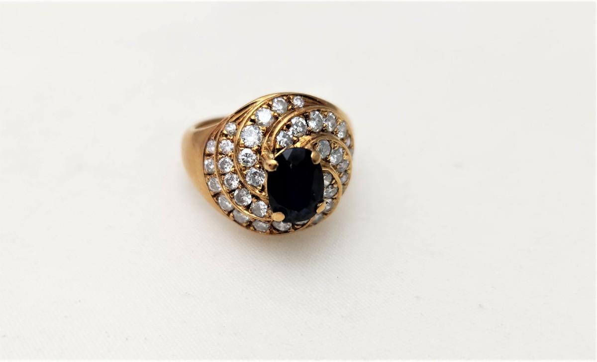 Handsome 18kt Yellow Gold Diamond & Sapphire Swirl Shape Dinner Ring - 1.5 ct total weight in diamonds, 1.63 weight blue sapphire. Size 5. Great condition. We have a copy of an older appraisal that will come with the ring. Note: opening bids reflect a price a little above scrap value for the ring - this bid will not be reduced.
