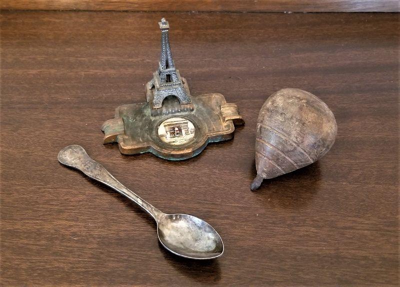 Little three piece lot here - you get a silver plate coronation spoon (Elizabeth II - 1953), an antique child's top, and a ca. 1920's Paris Souvenir. For scale, spoon is 5.5" long.