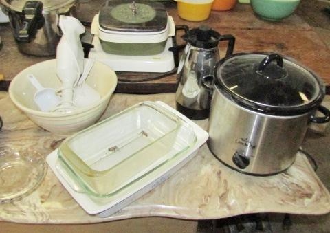 CROCKPOT, GLASS CASSEROLE DISHES, HAND MIXER, CARAFE AND MORE