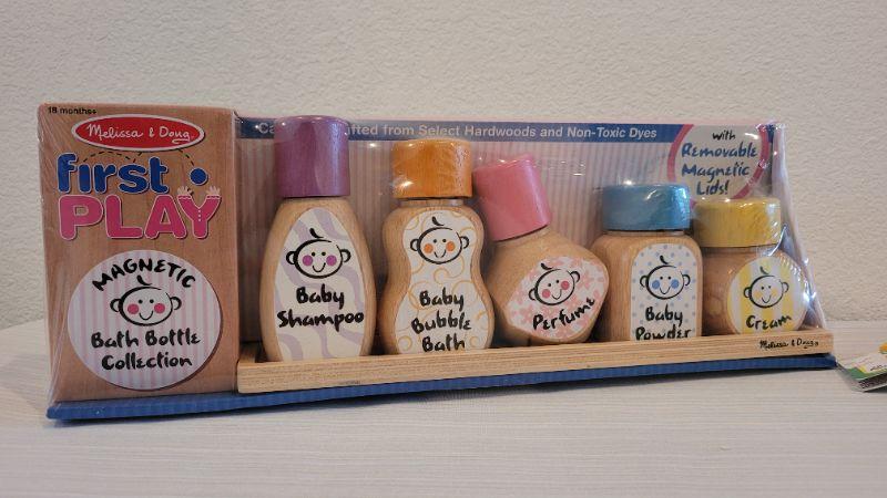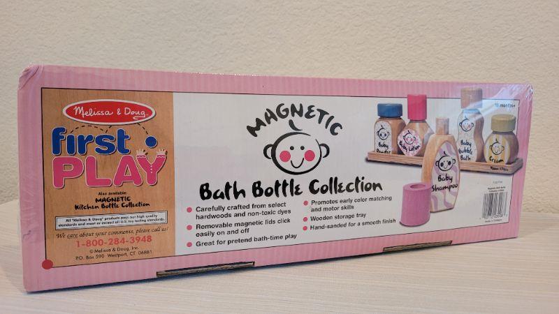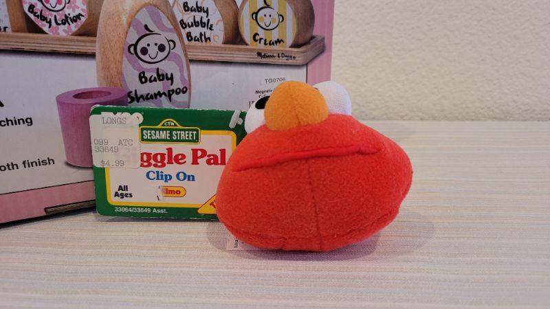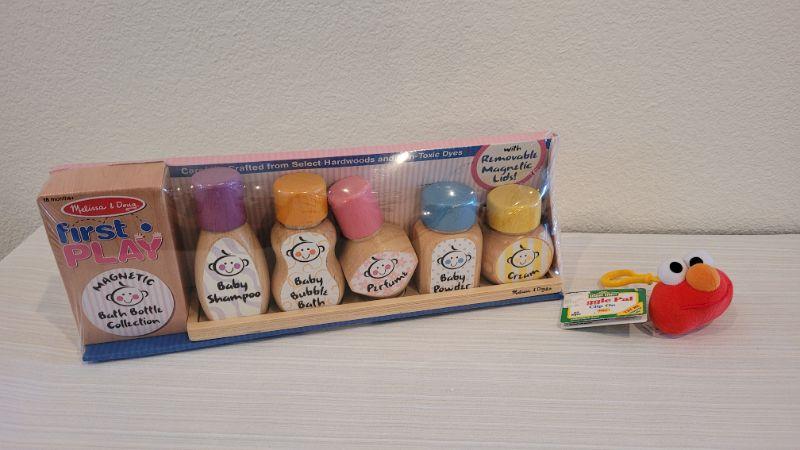 Lot 186: Melissa & Doug NEW Magnetic Bath Bottle Collection + New Elmo Clip On Giggle Toy