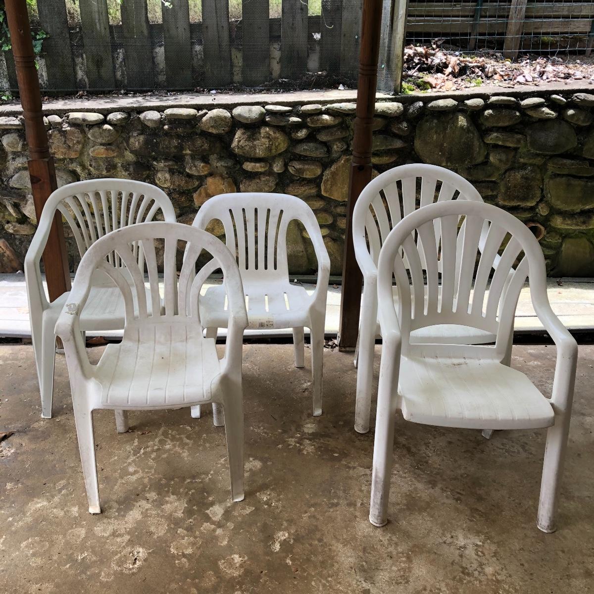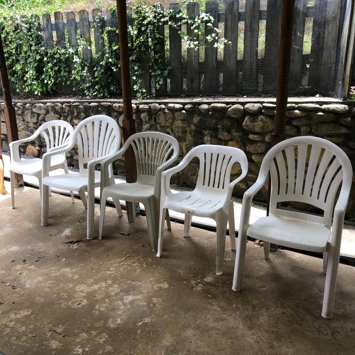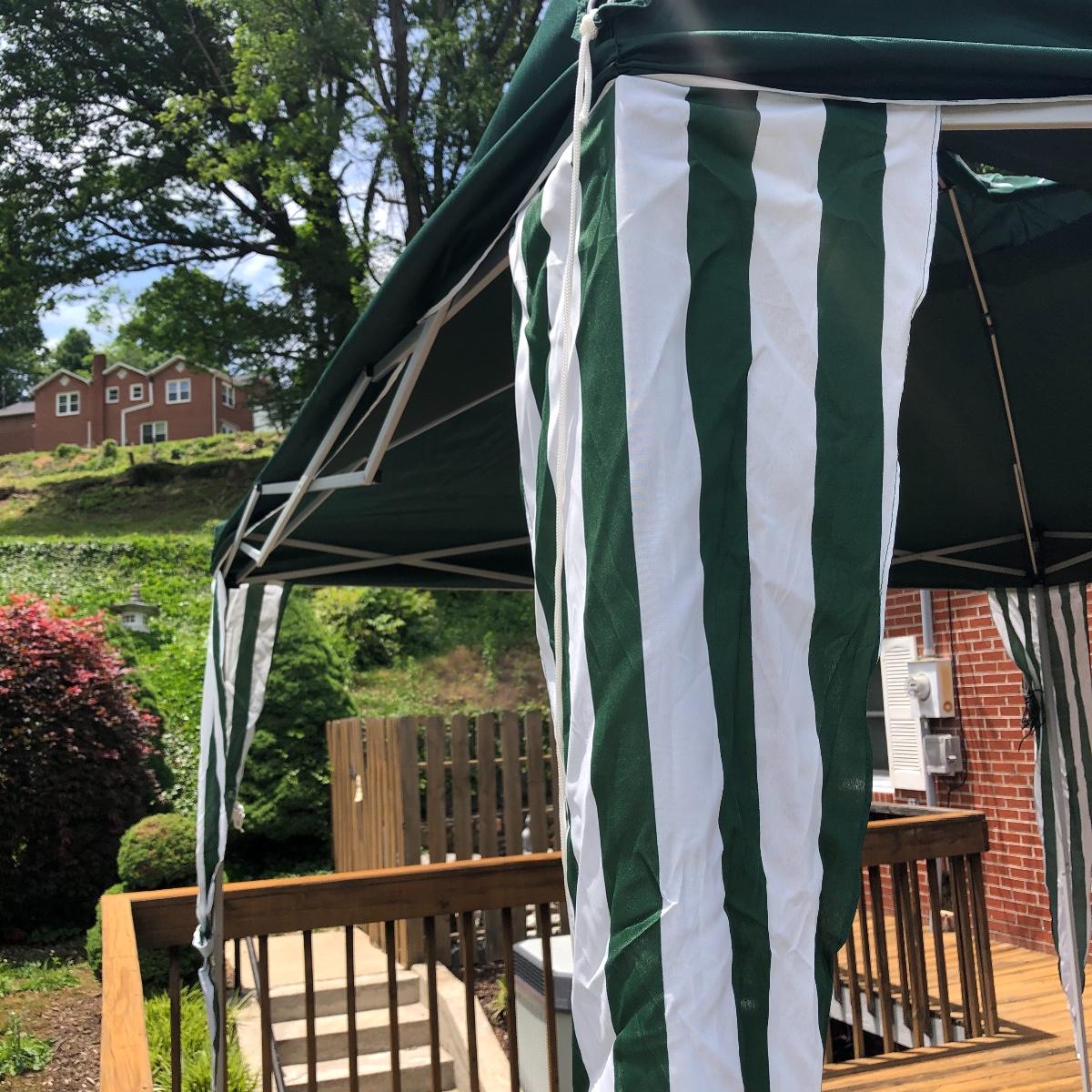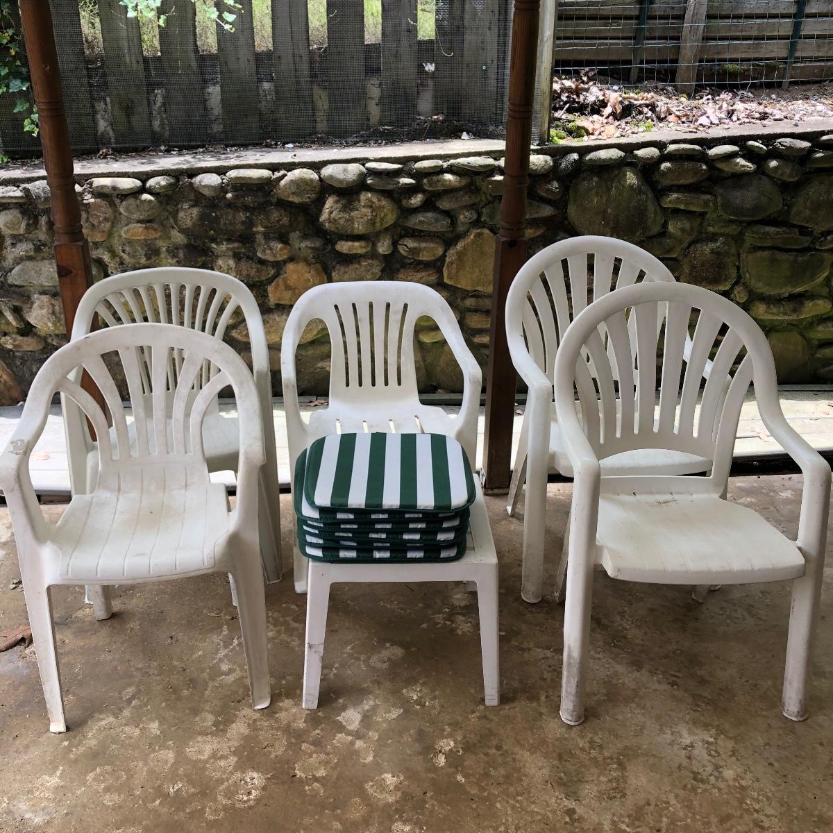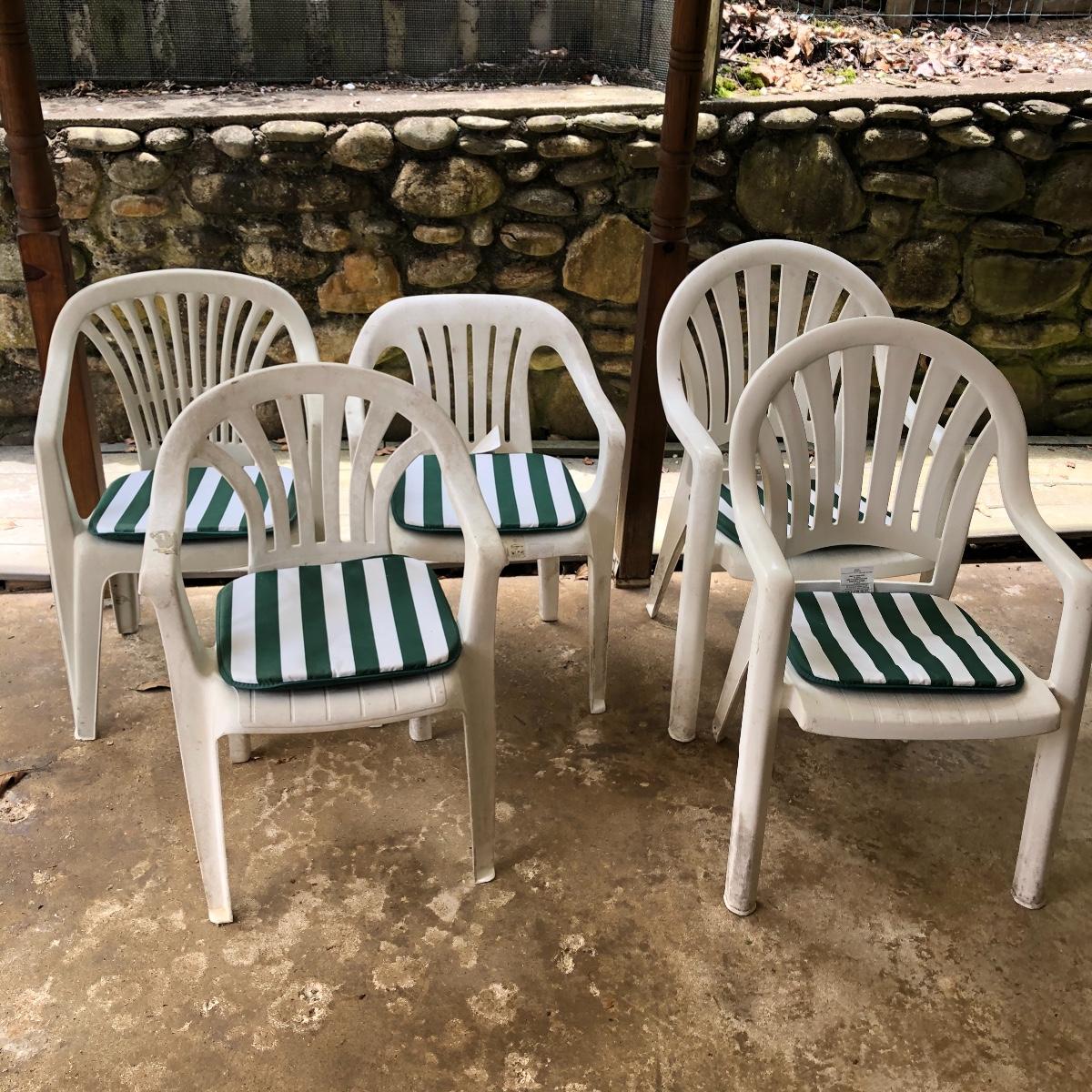 This lot has 5 white plastic chairs, a matching white plastic table, six green and white striped cushions, and a large green canopy tent. The canopy tent is 10ft x10ft and it does not include any stakes. It is easy to both put up and take down. Of the white plastic chairs, only two match.
