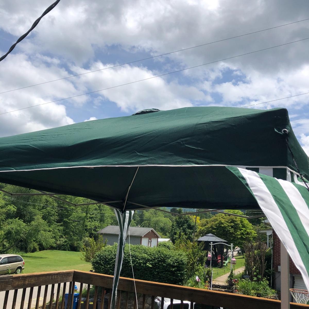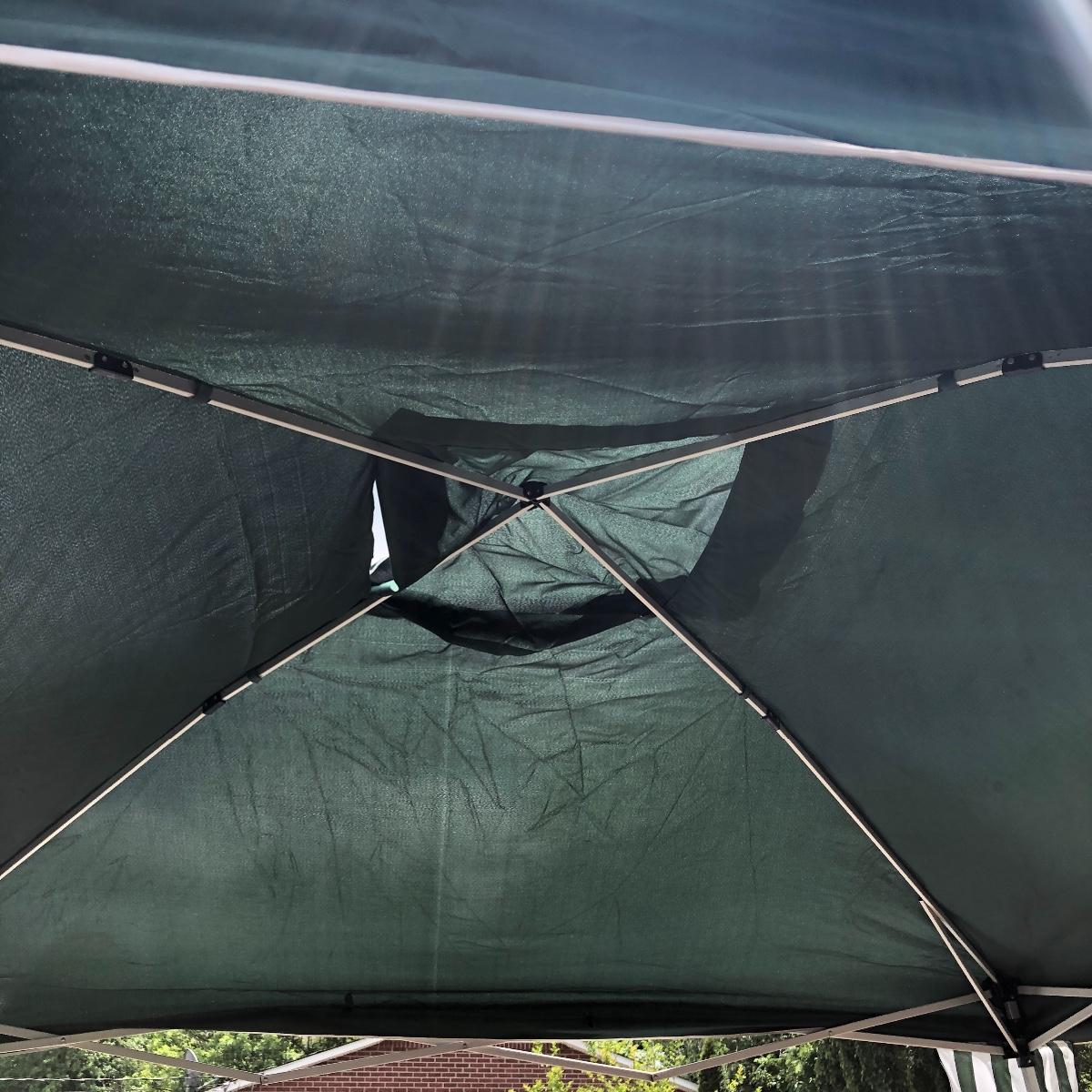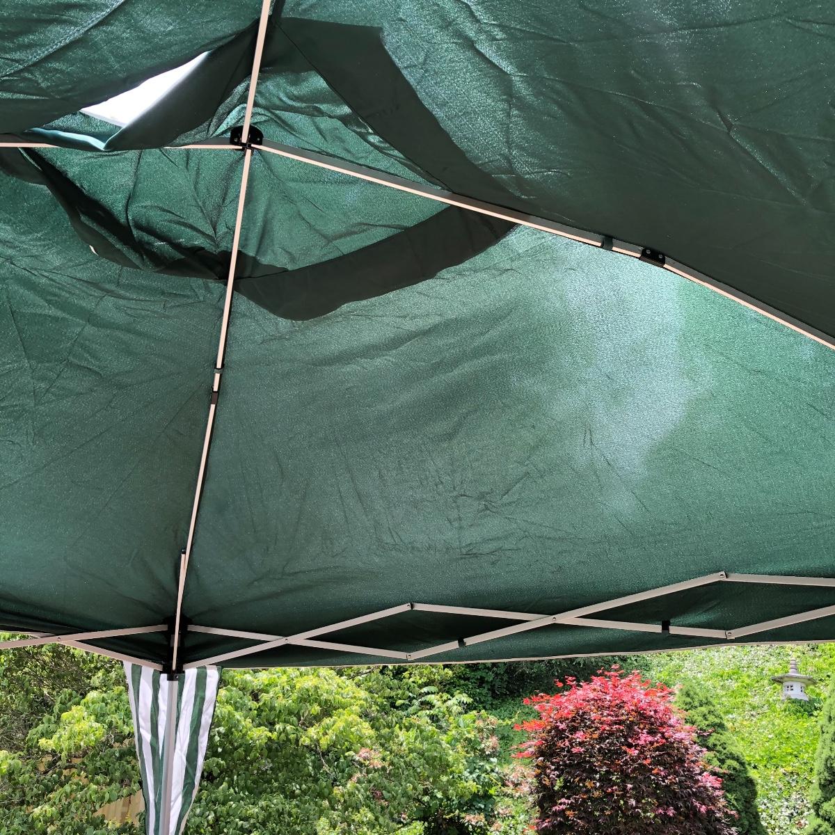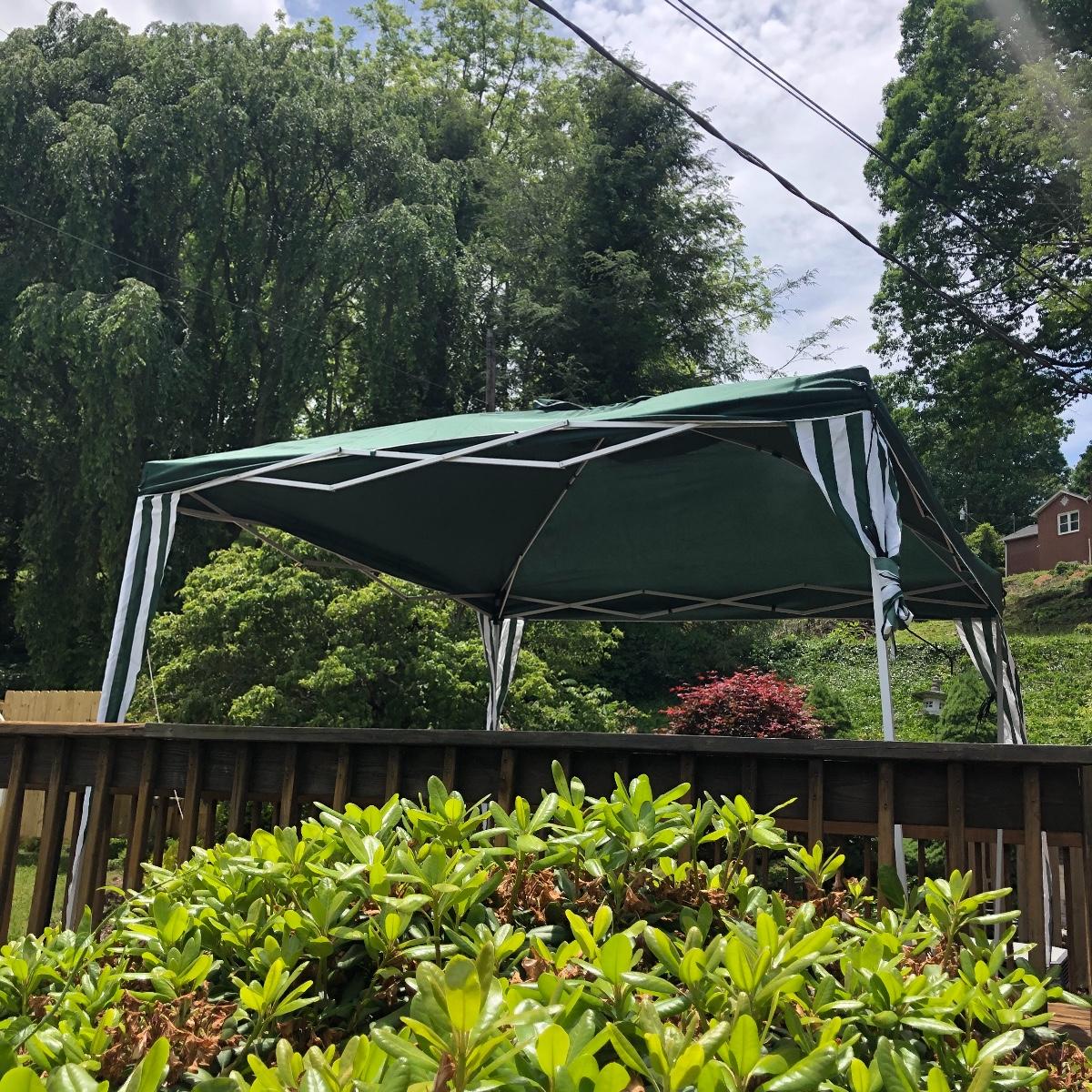 This lot has 5 white plastic chairs, a matching white plastic table, six green and white striped cushions, and a large green canopy tent. The canopy tent is 10ft x10ft and it does not include any stakes. It is easy to both put up and take down. Of the white plastic chairs, only two match.