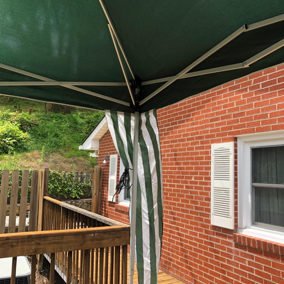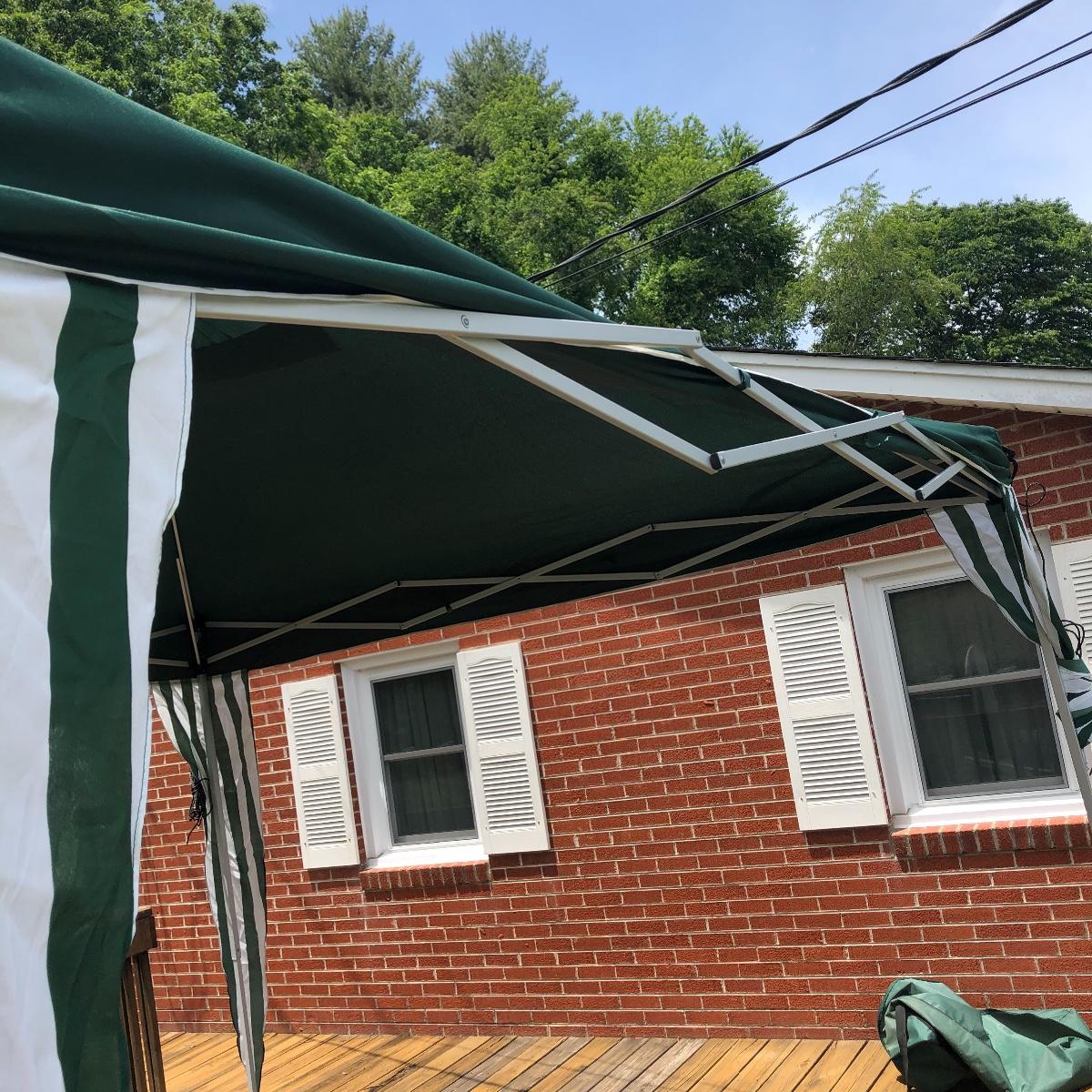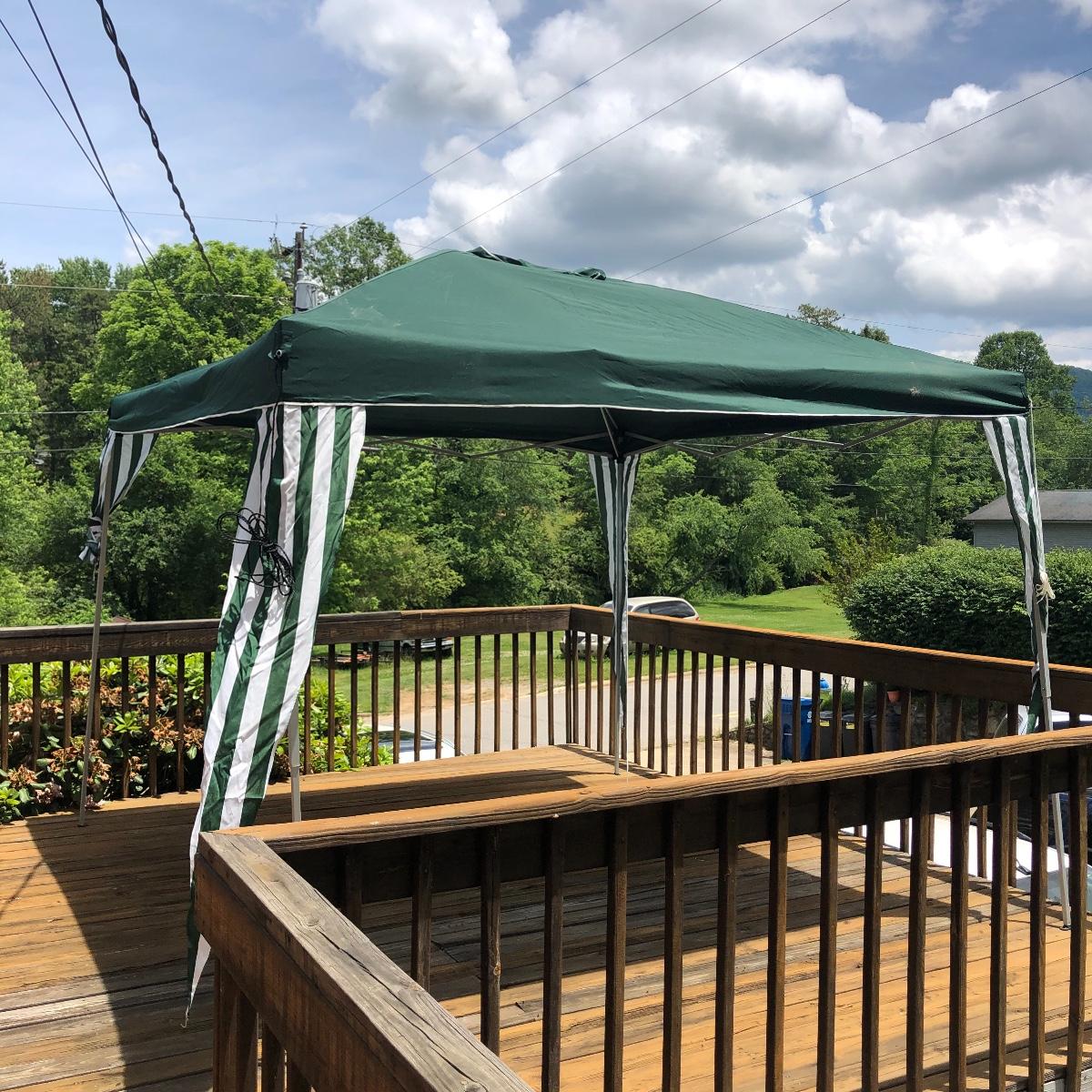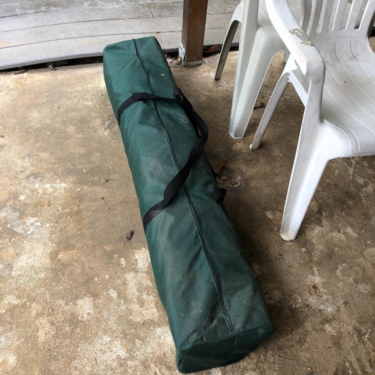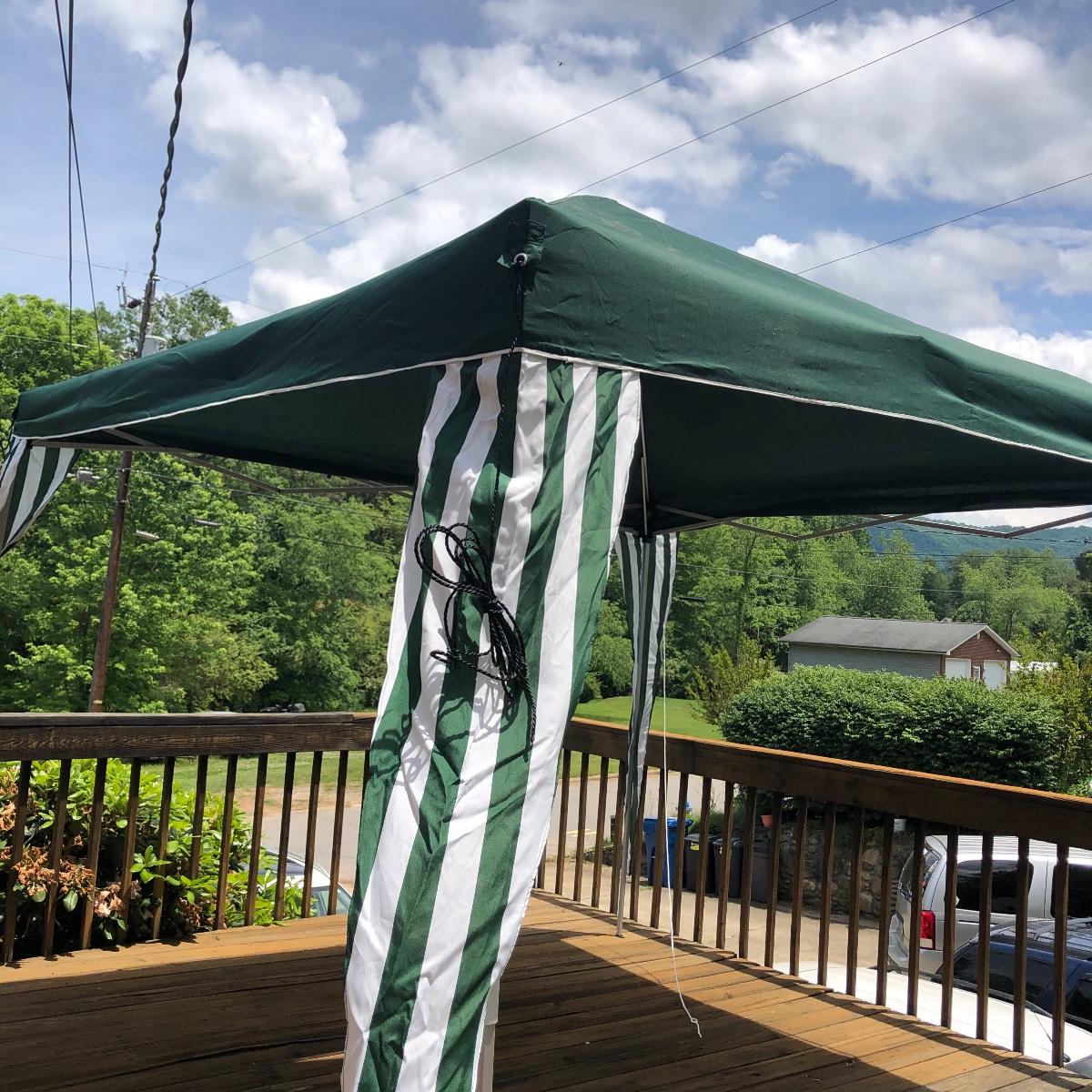 This lot has 5 white plastic chairs, a matching white plastic table, six green and white striped cushions, and a large green canopy tent. The canopy tent is 10ft x10ft and it does not include any stakes. It is easy to both put up and take down. Of the white plastic chairs, only two match.