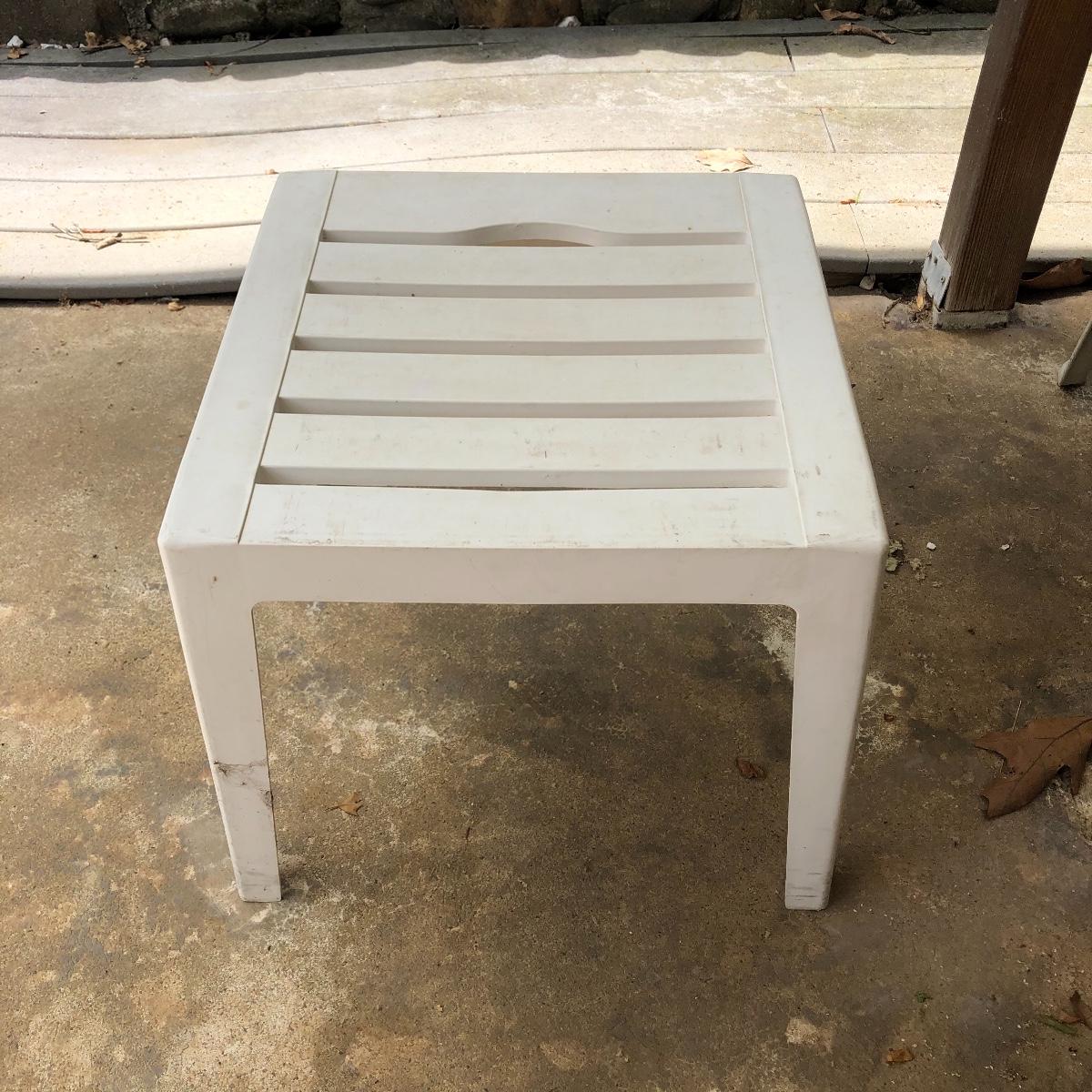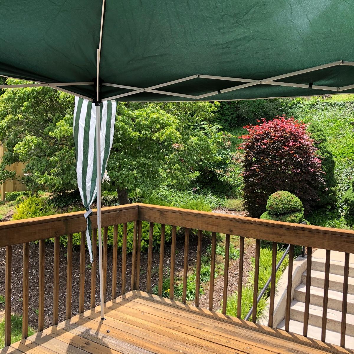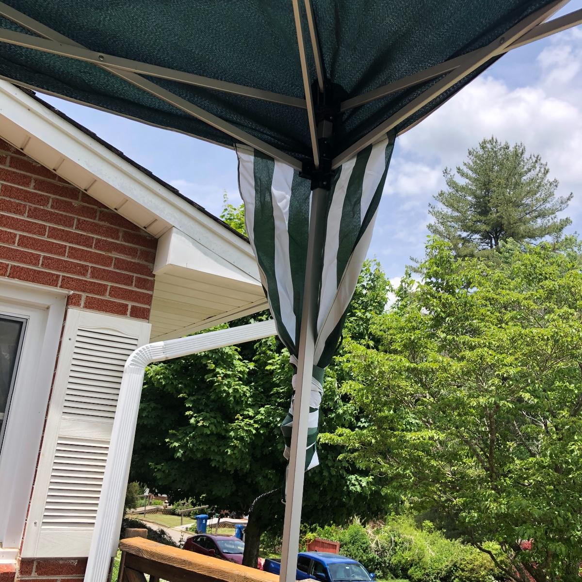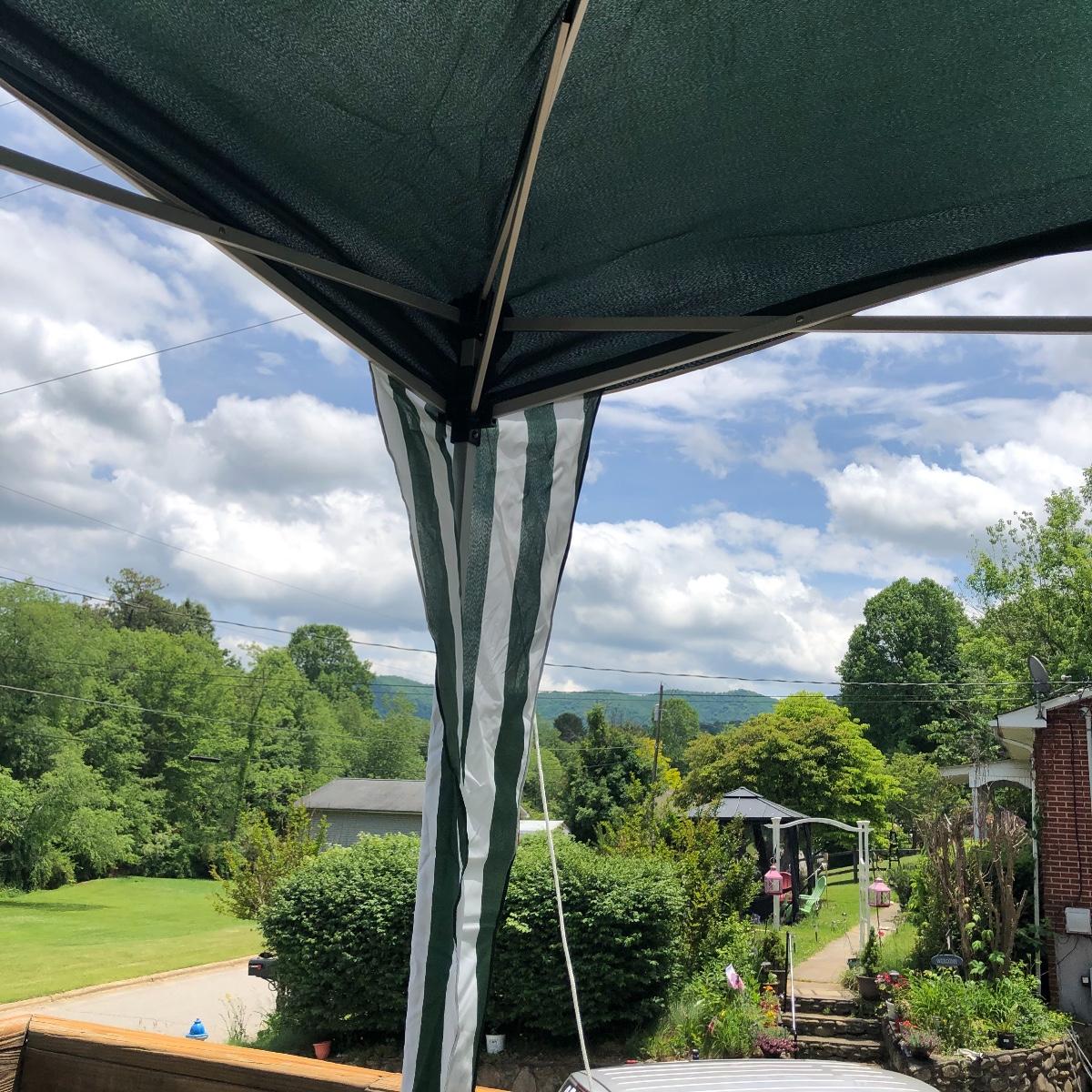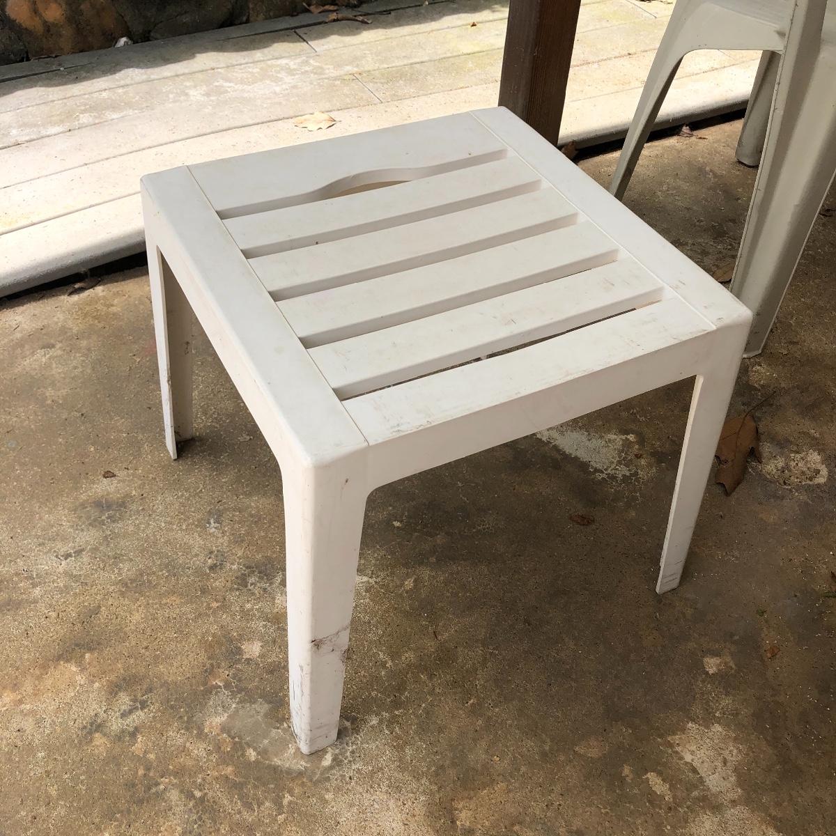This lot has 5 white plastic chairs, a matching white plastic table, six green and white striped cushions, and a large green canopy tent. The canopy tent is 10ft x10ft and it does not include any stakes. It is easy to both put up and take down. Of the white plastic chairs, only two match.