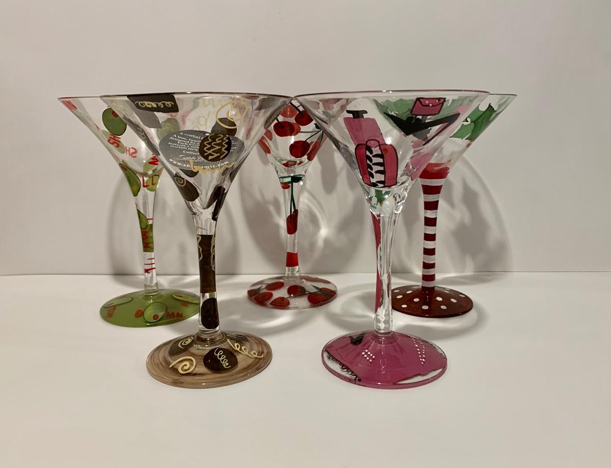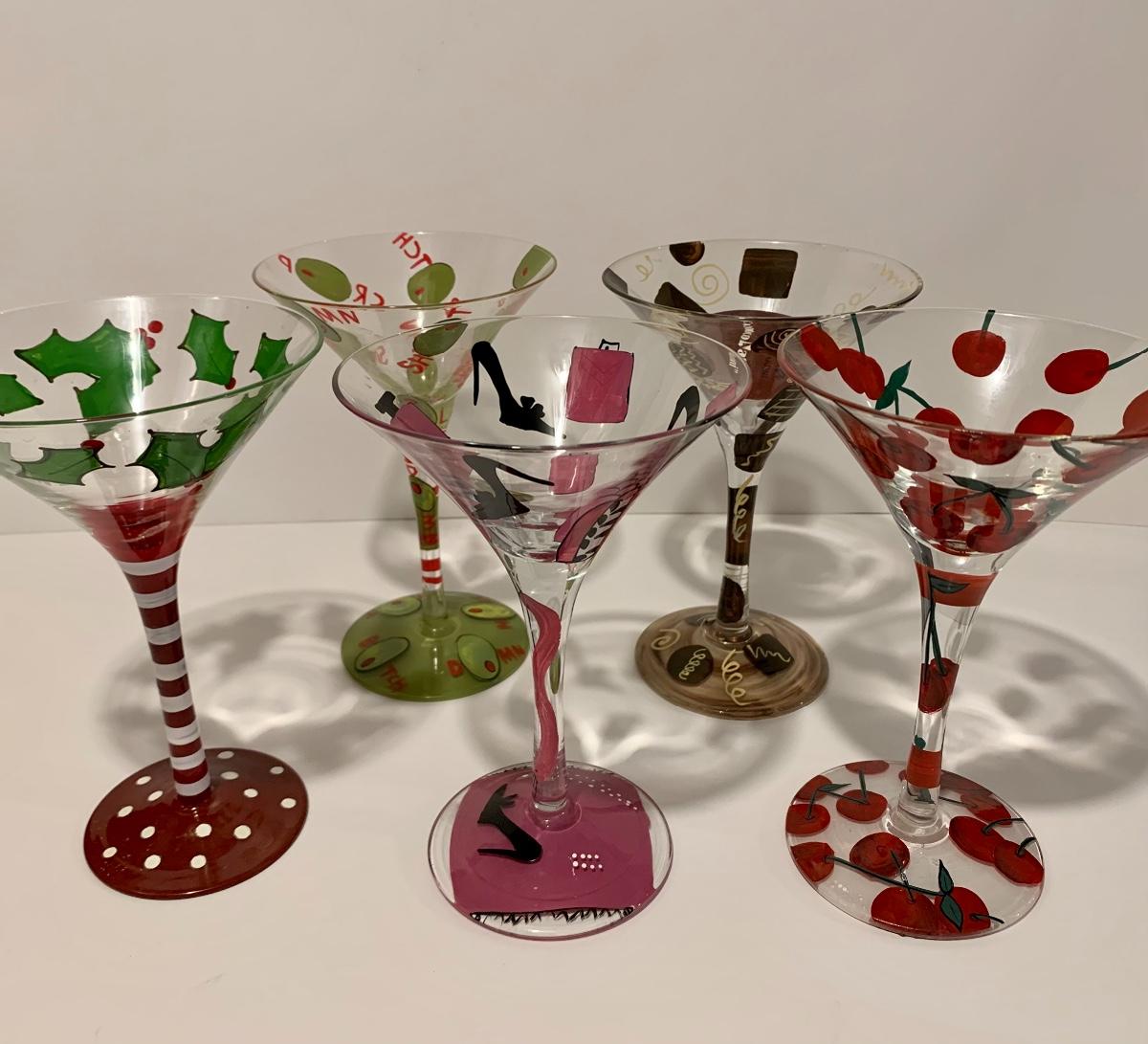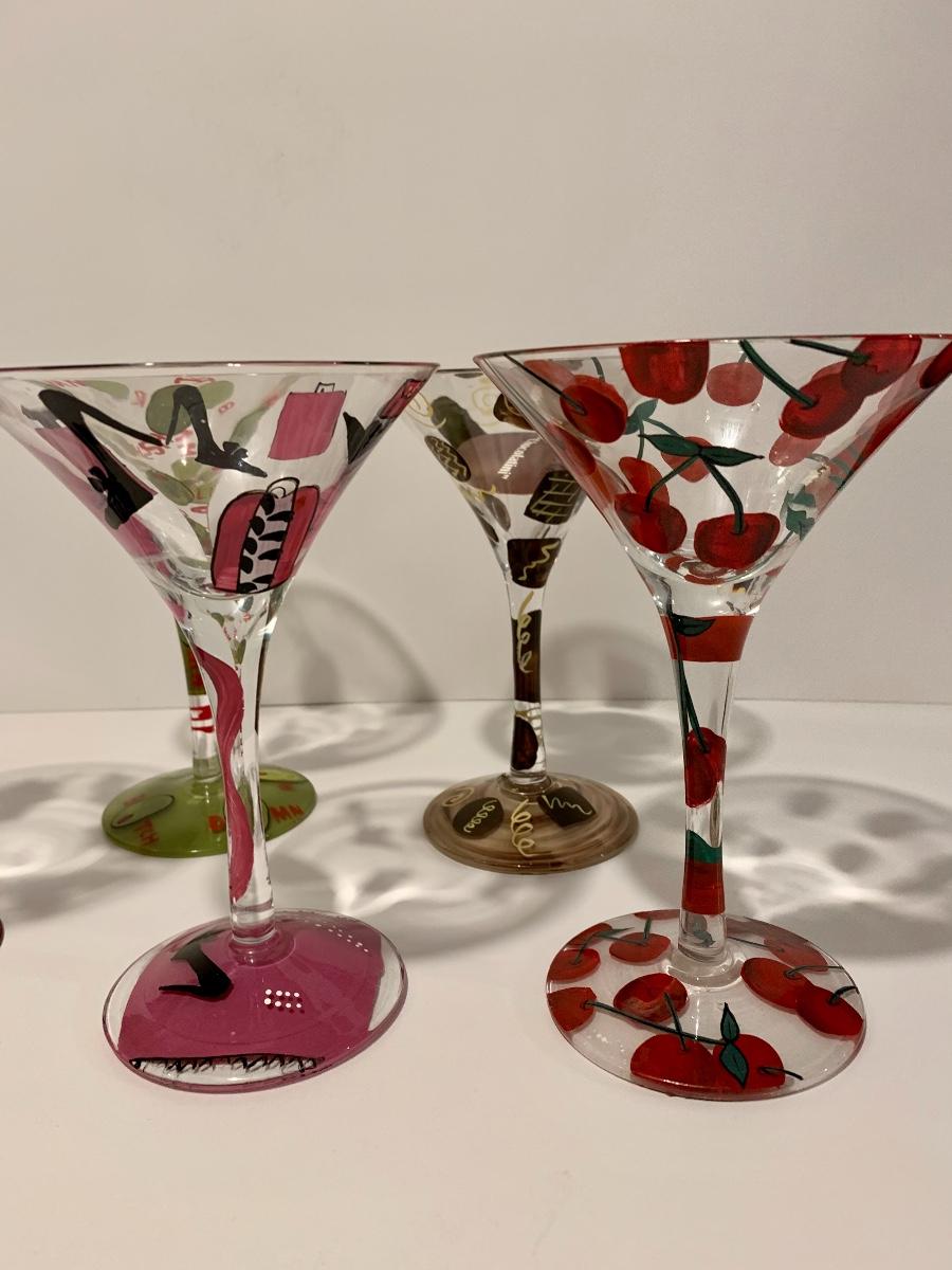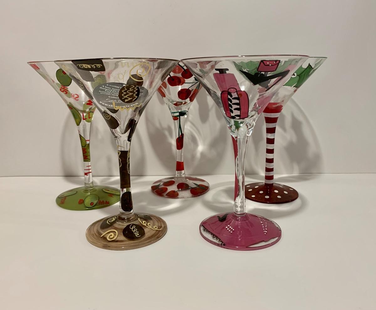 Set of 5 Lolita Stemware/Martini Glasses 4 with recipes on the bottom for the bartender in you.