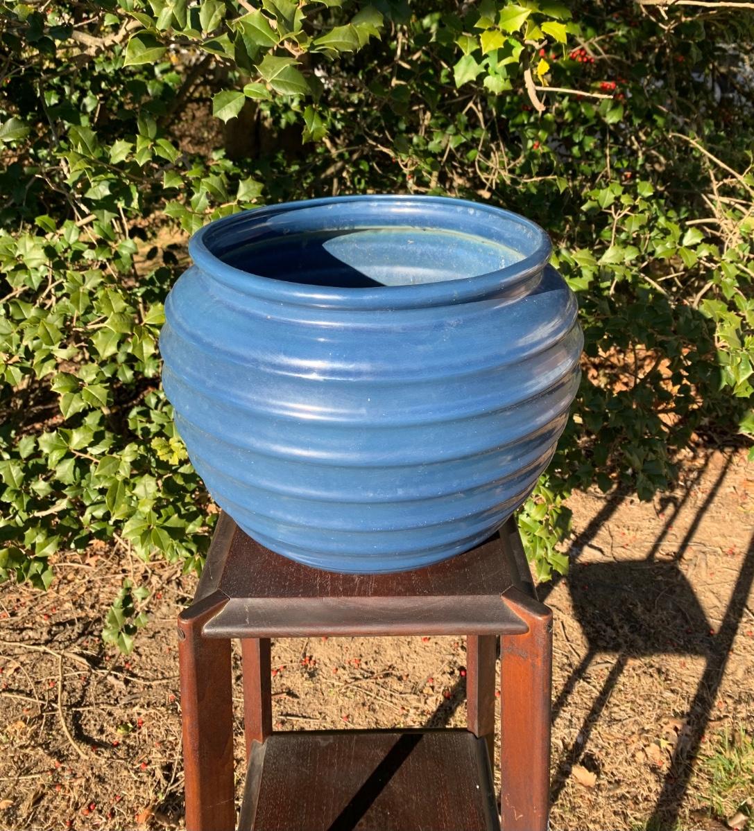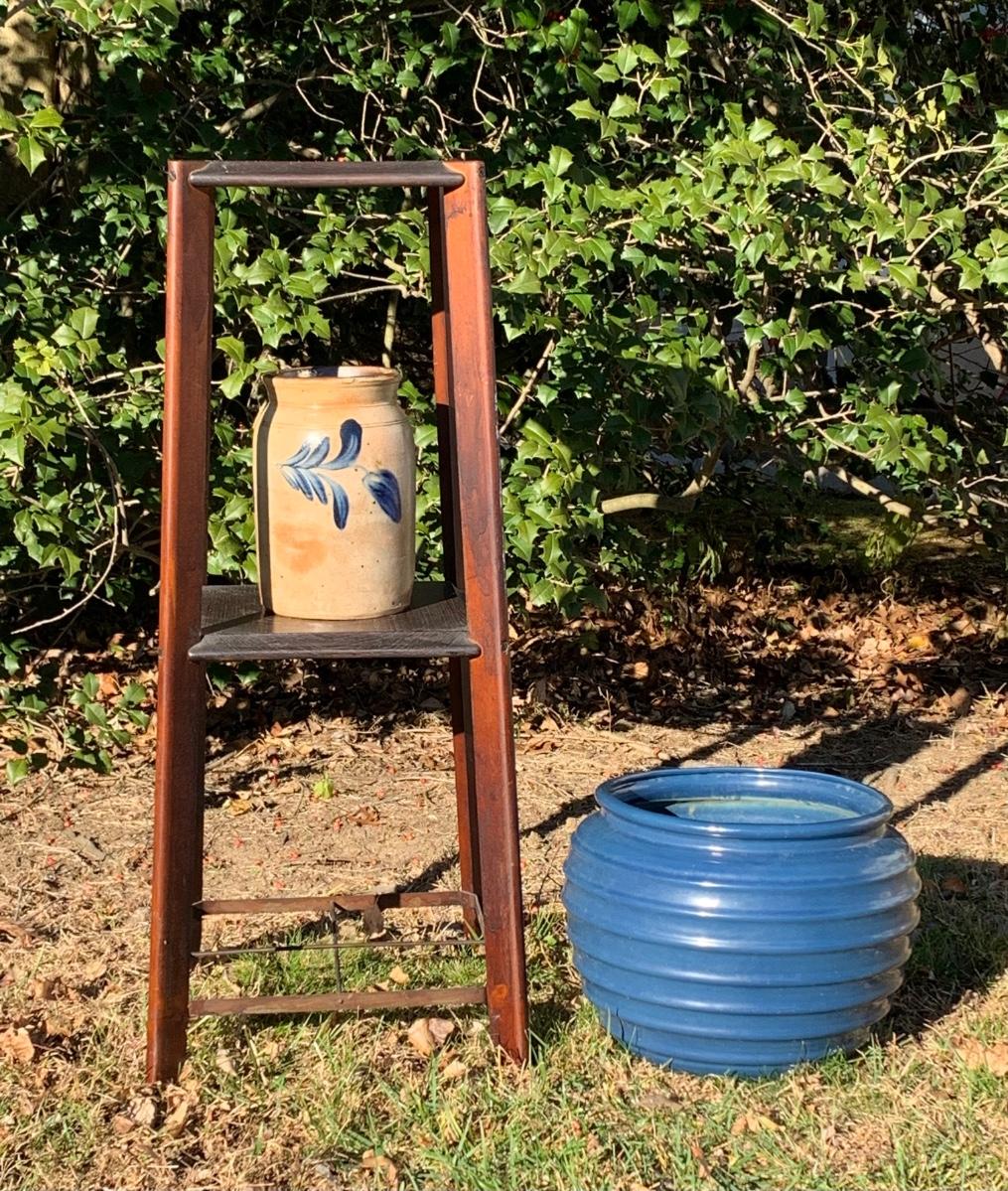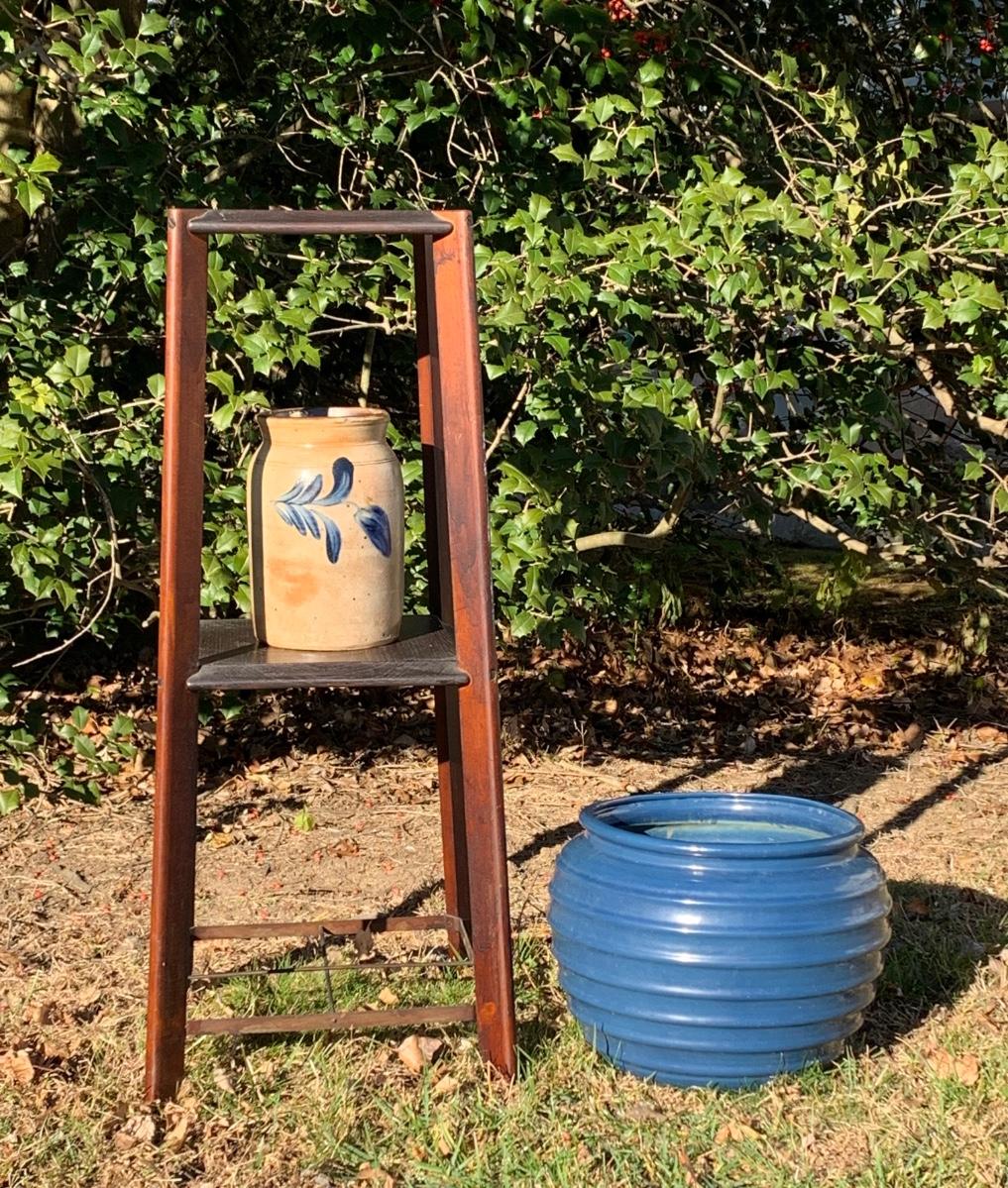 Vintage wood and metal plant side, unmarked pottery and a blue ribbed planter.