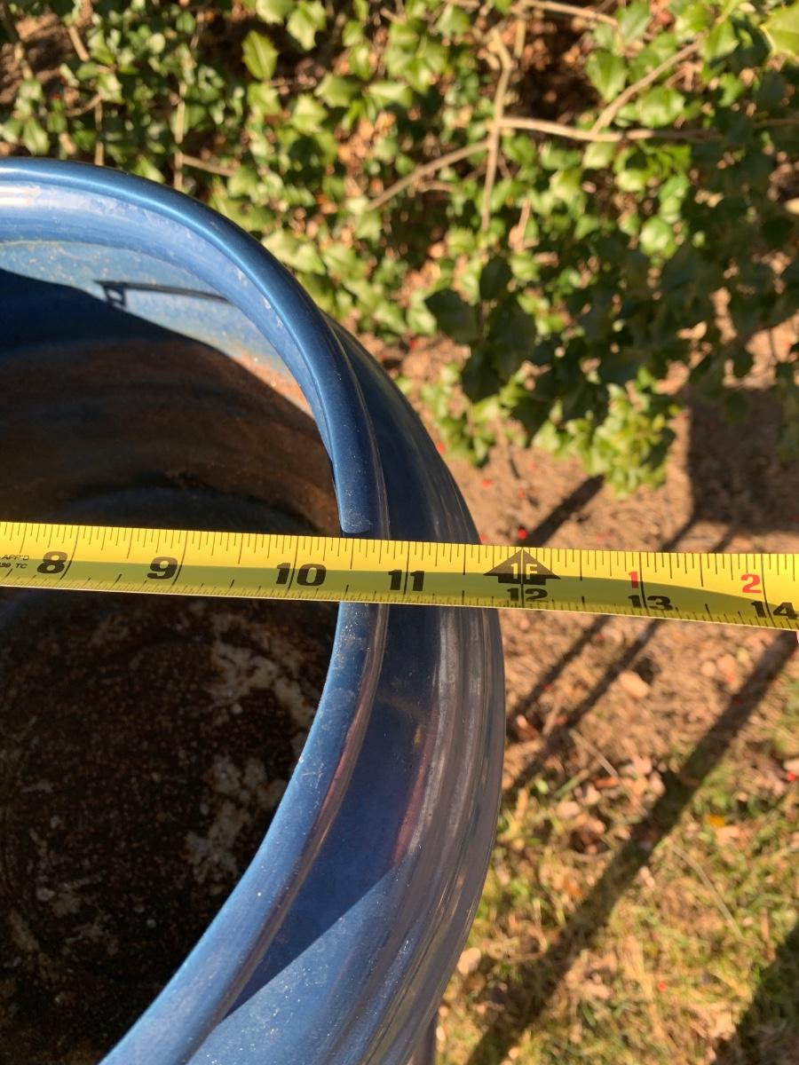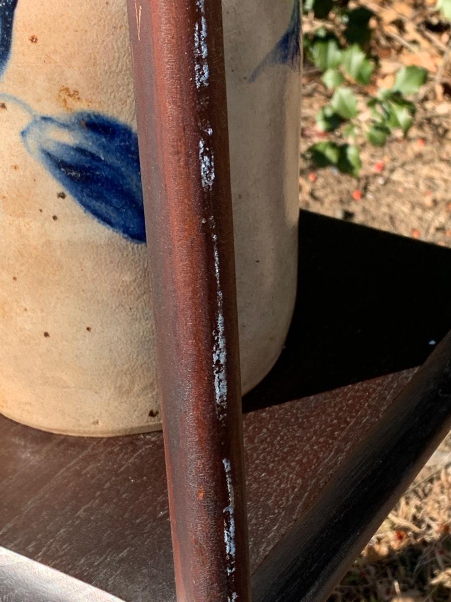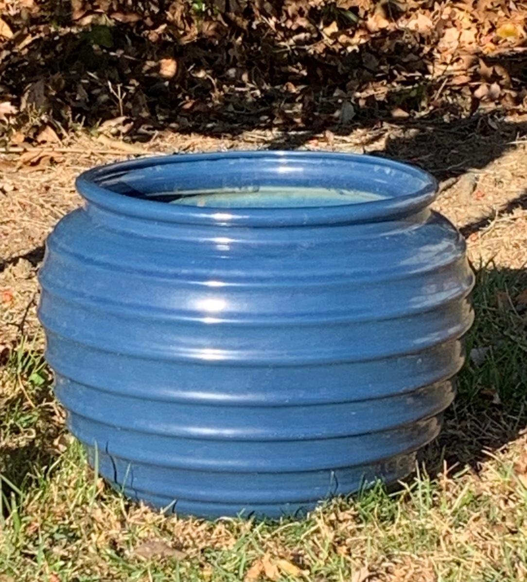 Vintage wood and metal plant side, unmarked pottery and a blue ribbed planter.