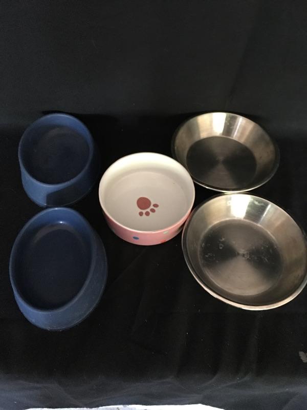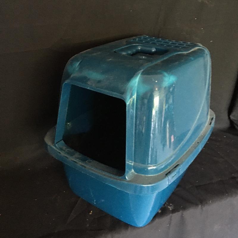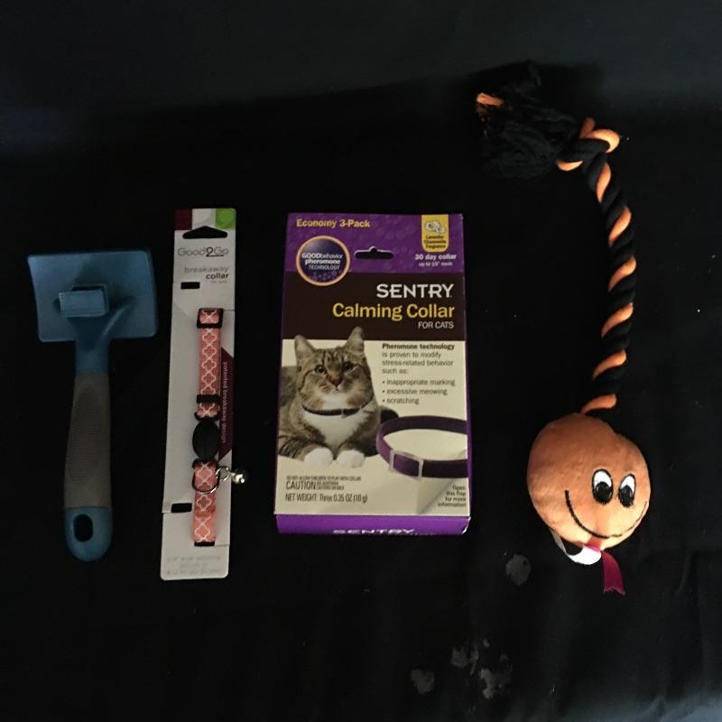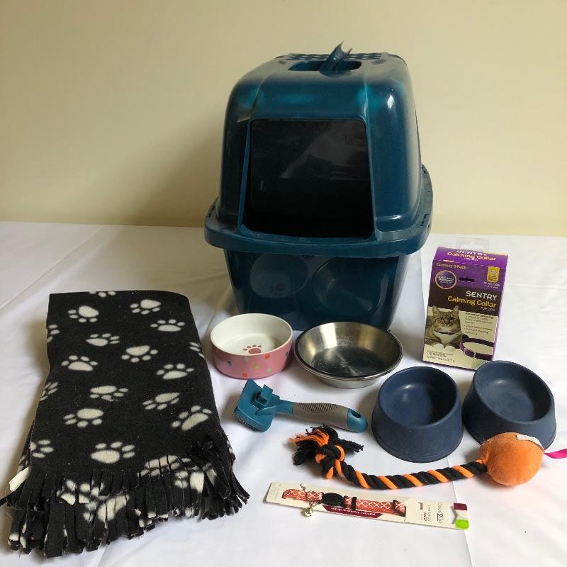 Cat essentials. Lot includes covered litter box, cat blanket, collars, bowls, brush and a toy. Spoil your feline with this essential lot. Box measures 14” x 19” x 17”.