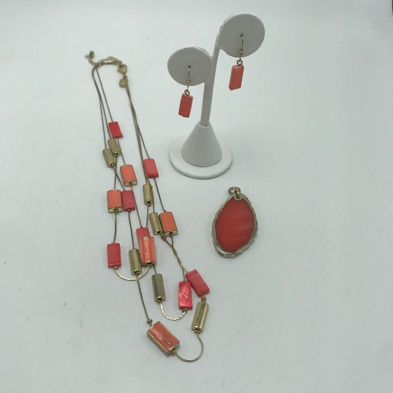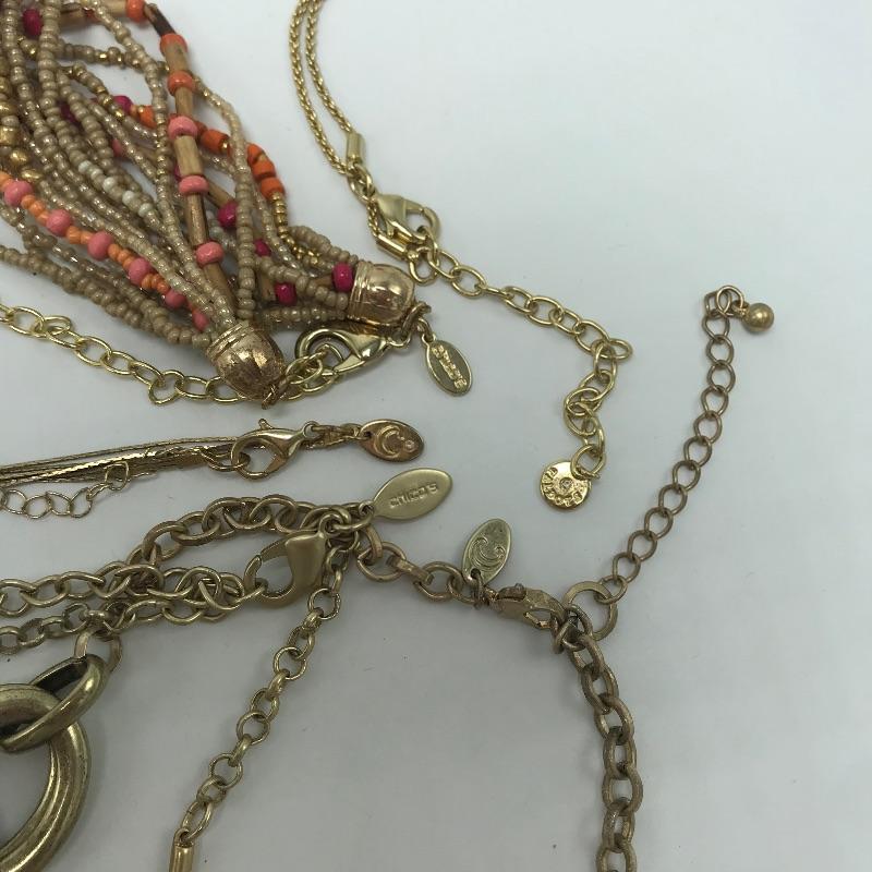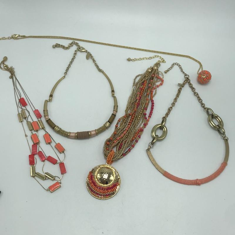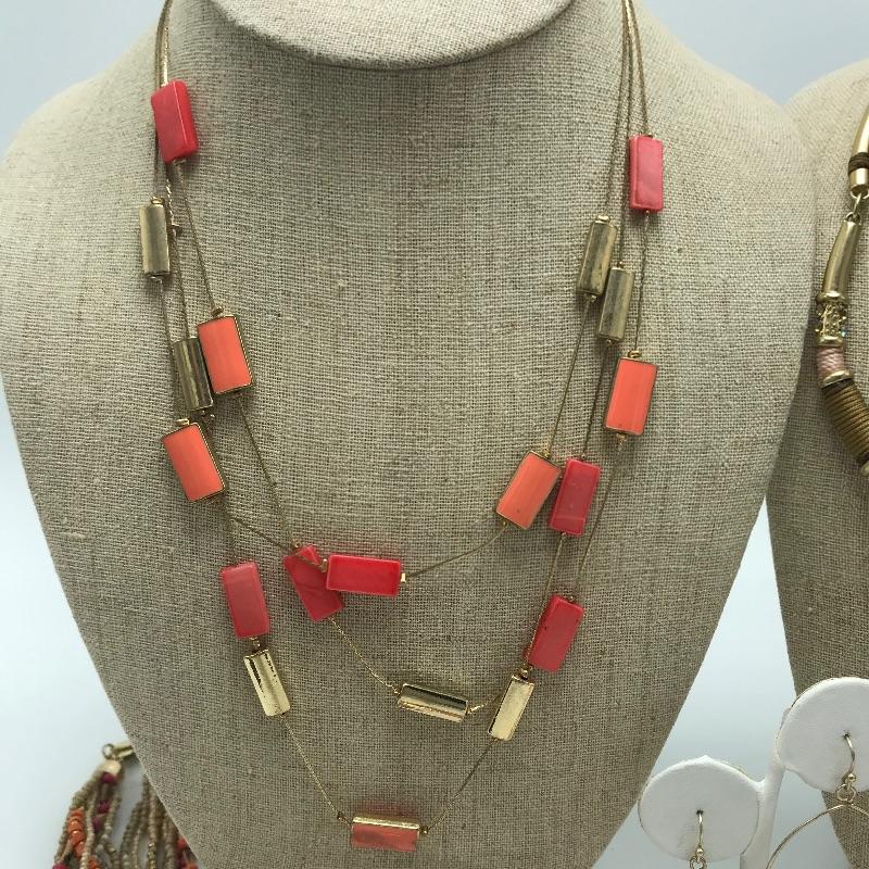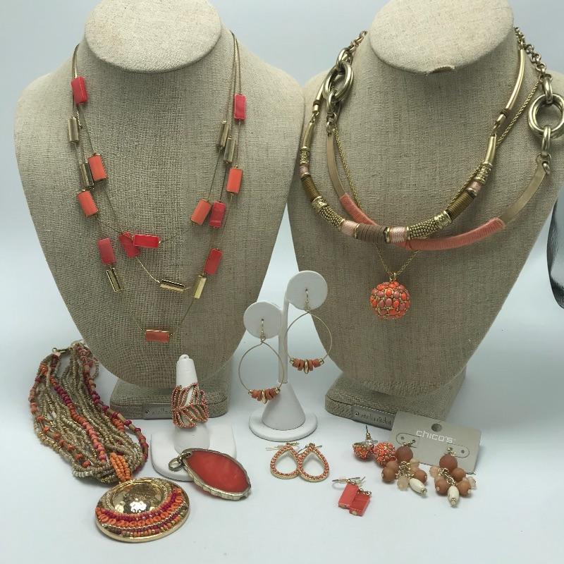 Lovely lot of coral accented golden colored fashion jewelry. A few sets are found among the lot and lots of opportunities to mix and match. Some brand names found are Chico’s, Talbots and Charming Charlie’s. See photos.