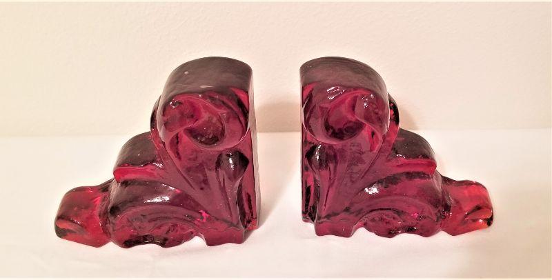 Pair of striking ruby red glass bookends - studio glass. Not signed. Nice condition. Measures 4.5" x 5.5".