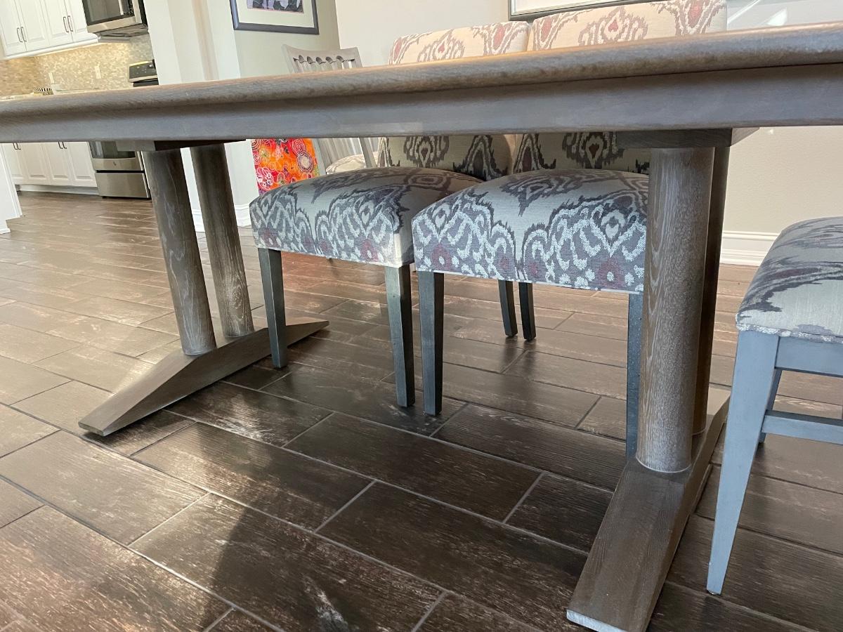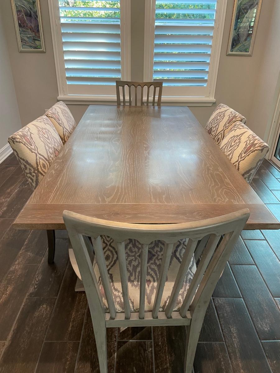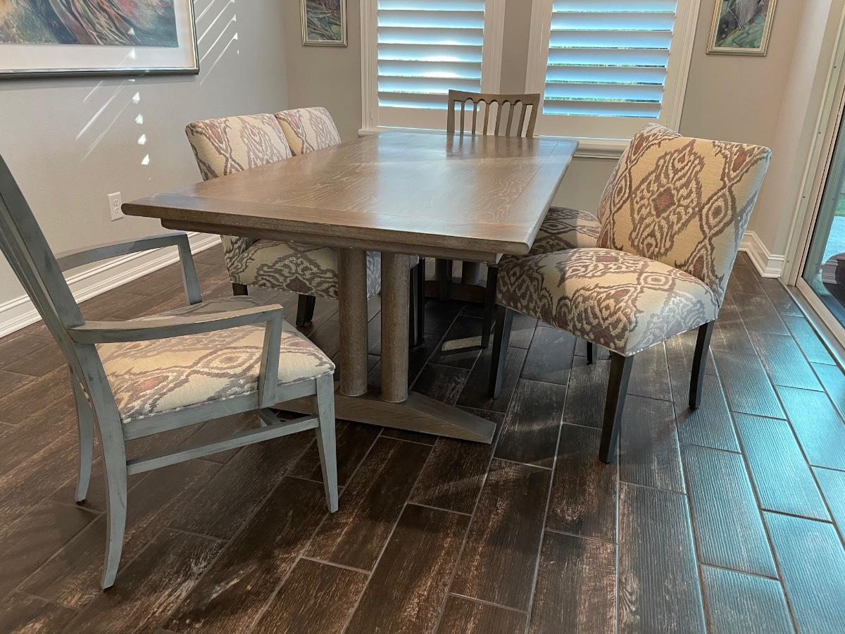 Like new--perfect condition. The set is 4 years old and it looks like it just came off the showroom floor. Plank-style top in oak, with double trestle base in a warm, gray-ish brown finish. Four side chairs with upholstered seat and back in an updated Ikat-inspired pattern in gray, cream and mauve. Two 'Benham' host chairs in a soft, gray finish with upholstered seat.