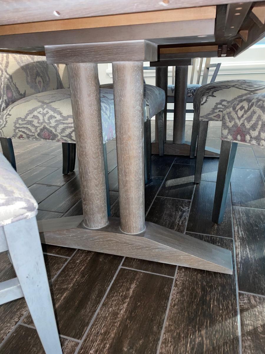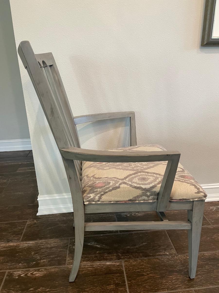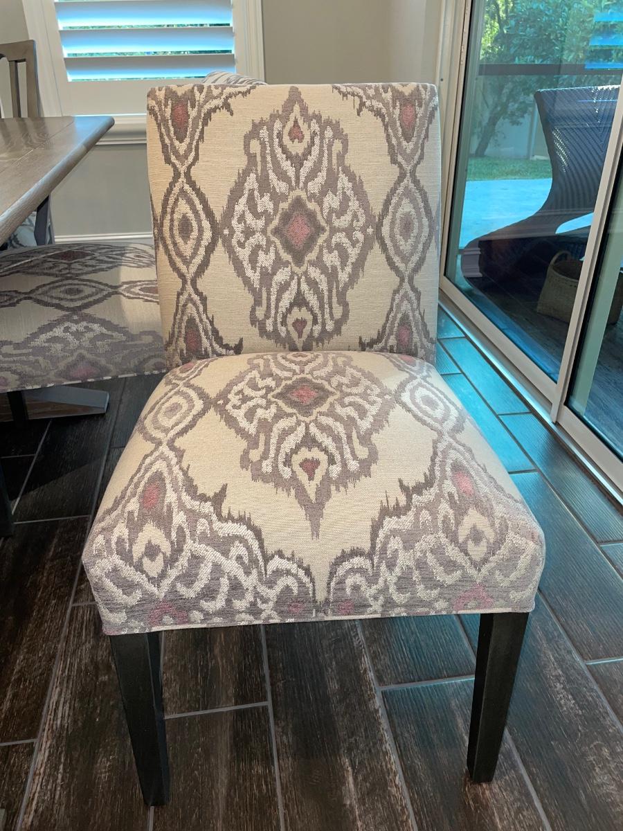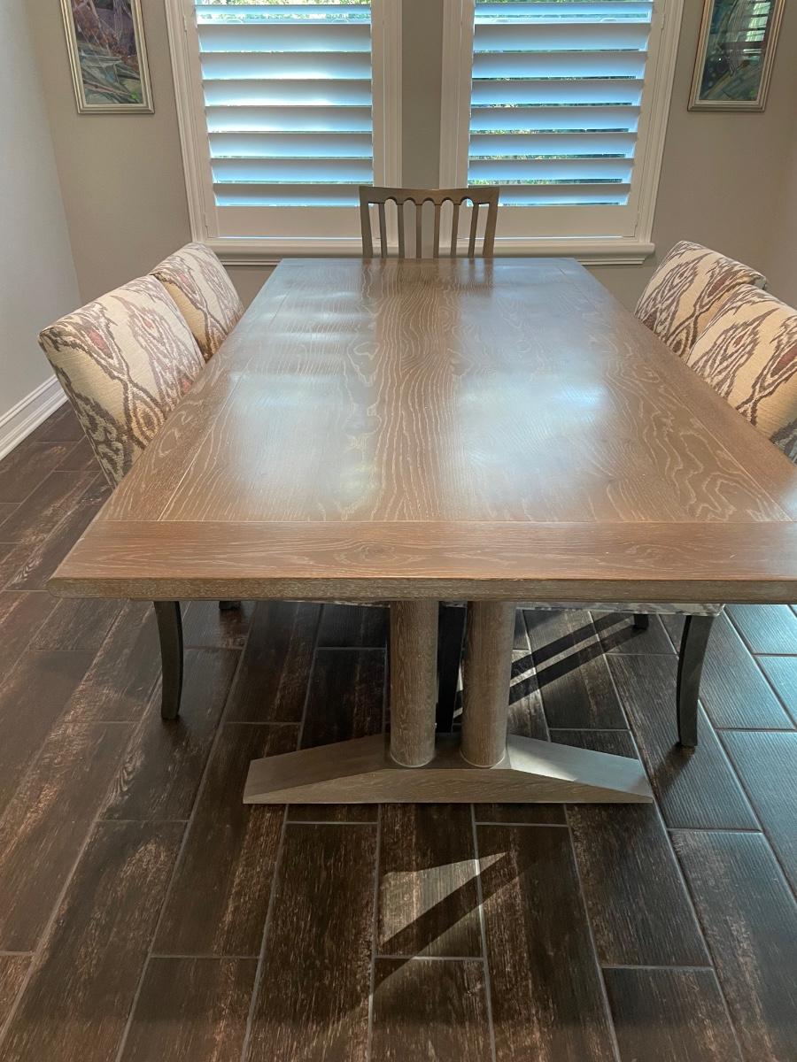 Like new--perfect condition. The set is 4 years old and it looks like it just came off the showroom floor. Plank-style top in oak, with double trestle base in a warm, gray-ish brown finish. Four side chairs with upholstered seat and back in an updated Ikat-inspired pattern in gray, cream and mauve. Two 'Benham' host chairs in a soft, gray finish with upholstered seat.