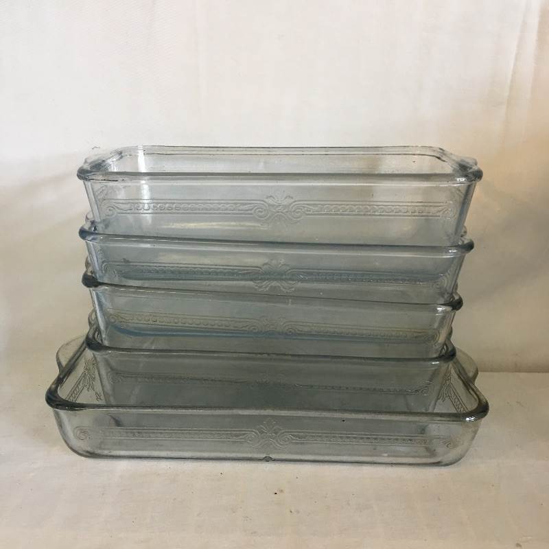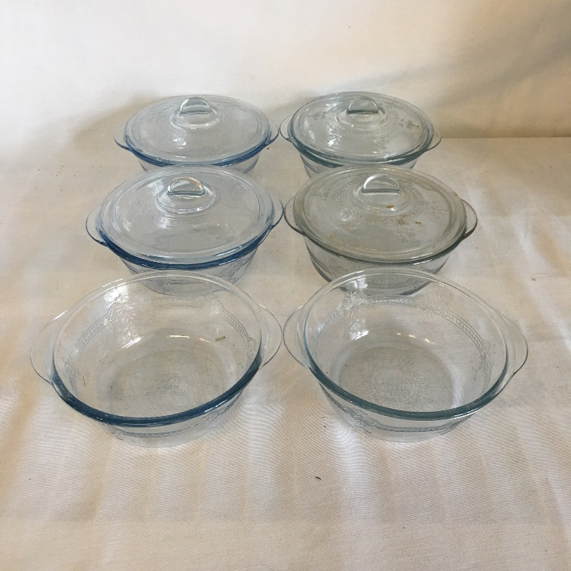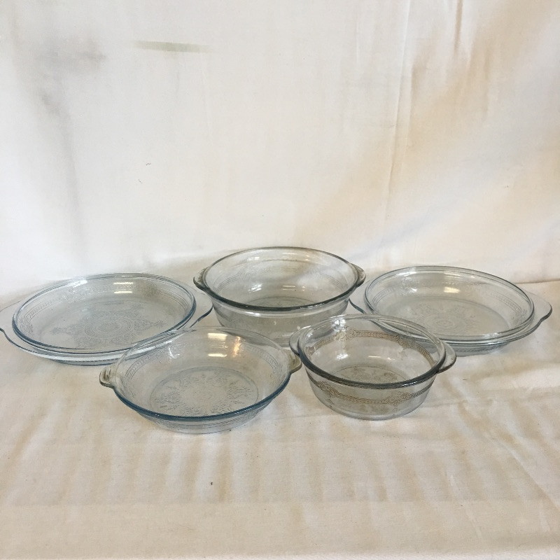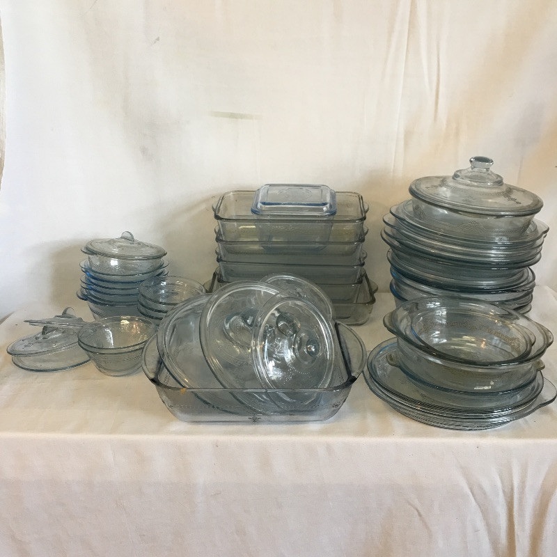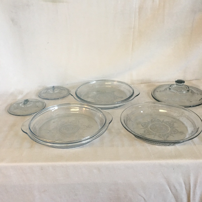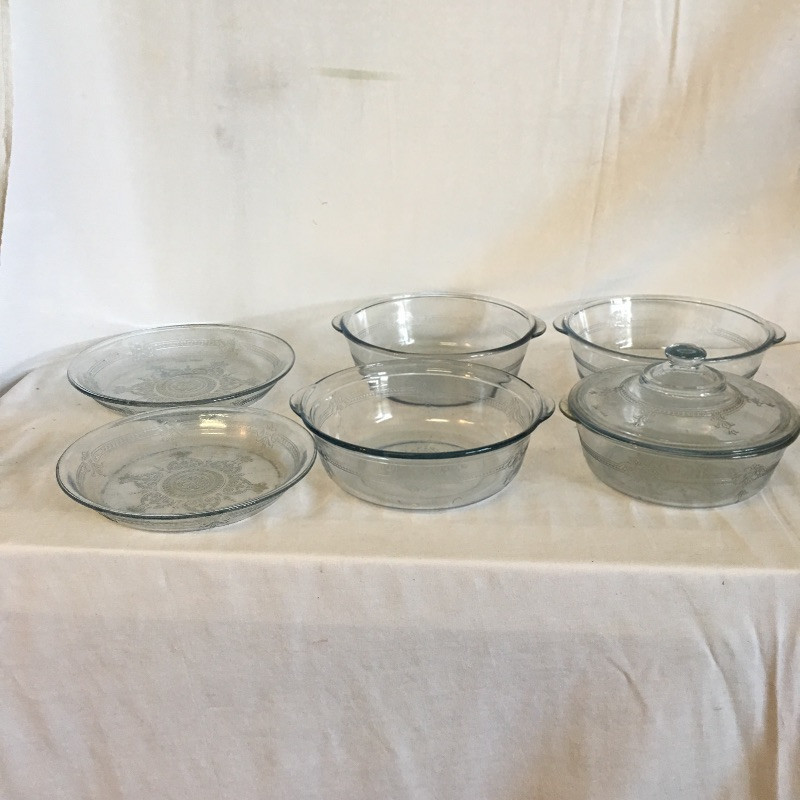 A lovely large selection of Fire - King dish ware in a variety of shapes and sizes with pretty etched designs, see images for all that is included. Largest square dish measures 9” x 9” x 2.5”.