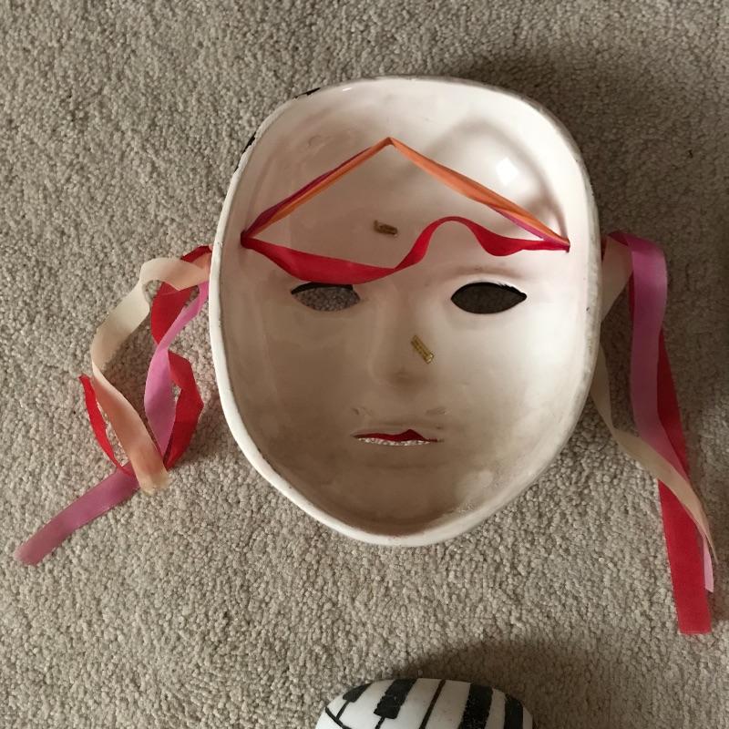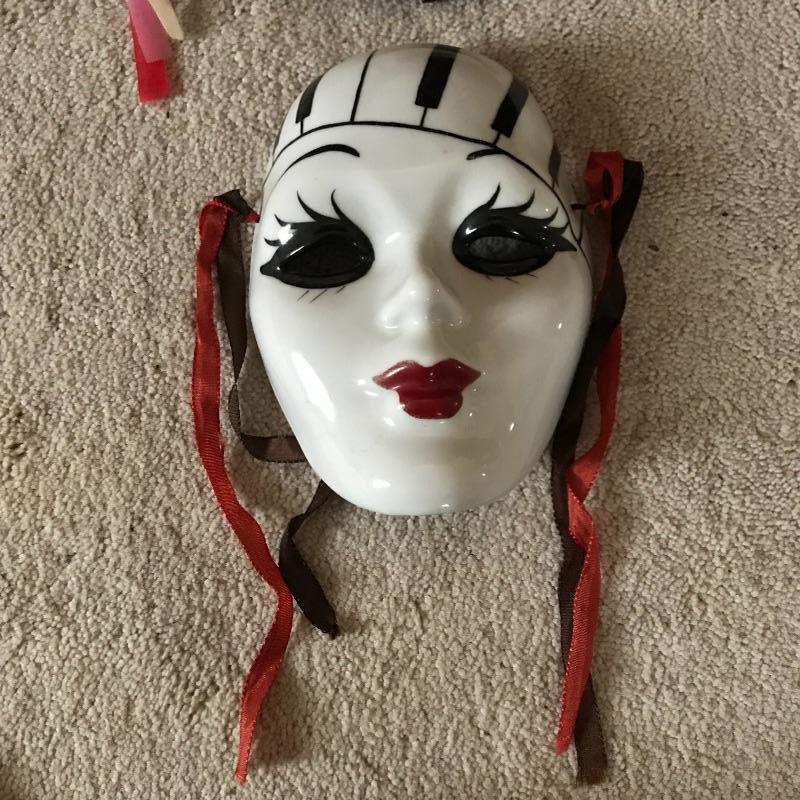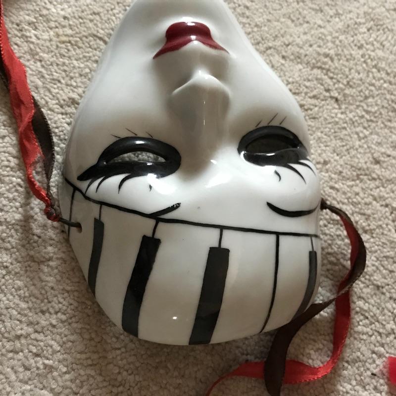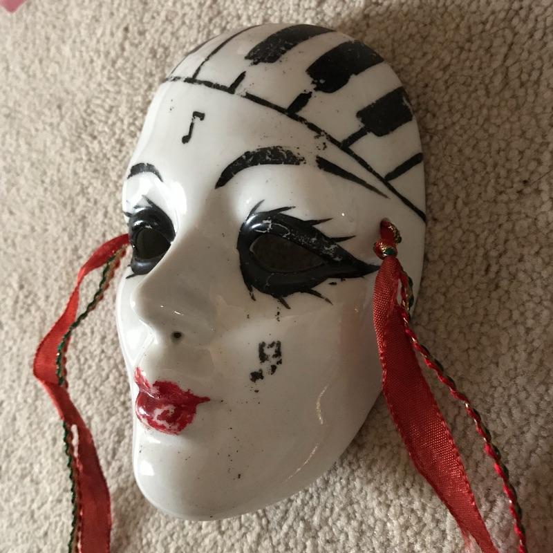 Four lovely porcelain colored Mardi Gras faces! Two are complementarily styled with dramatic red and black features and piano keys “head dress”. The other two appear to be more jester themed and vibrantly colored. All ribbons intact. See photos. The largest piano themed mask is approximately 5.25” x 7”. Shipping available.