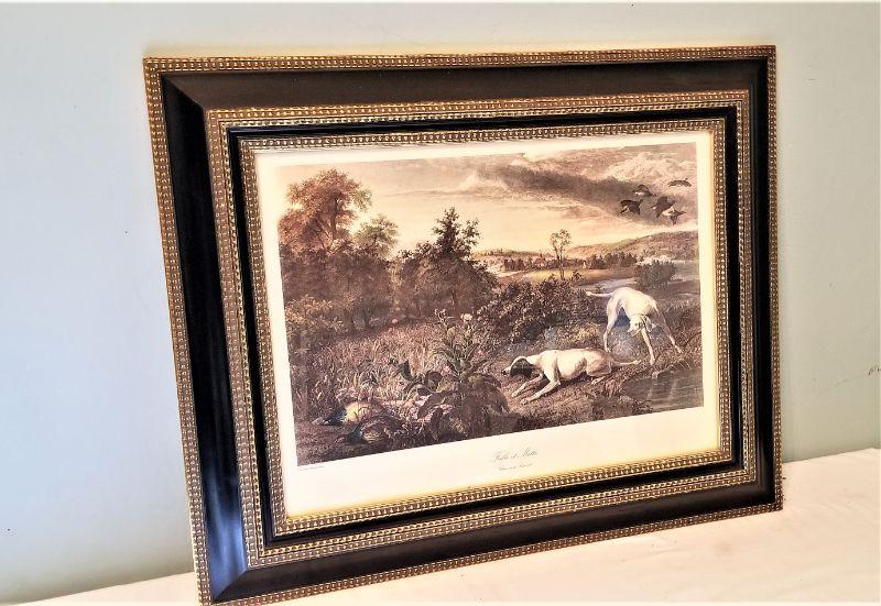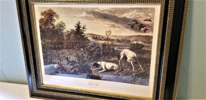 Contemporary copy of an old engraving "Chiens du Louis XIV" or The Dogs of Louis XIV. Typical hunting scene - note the pheasants flying away from the dogs. Framed - 26" x 21.6" Attractive piece.