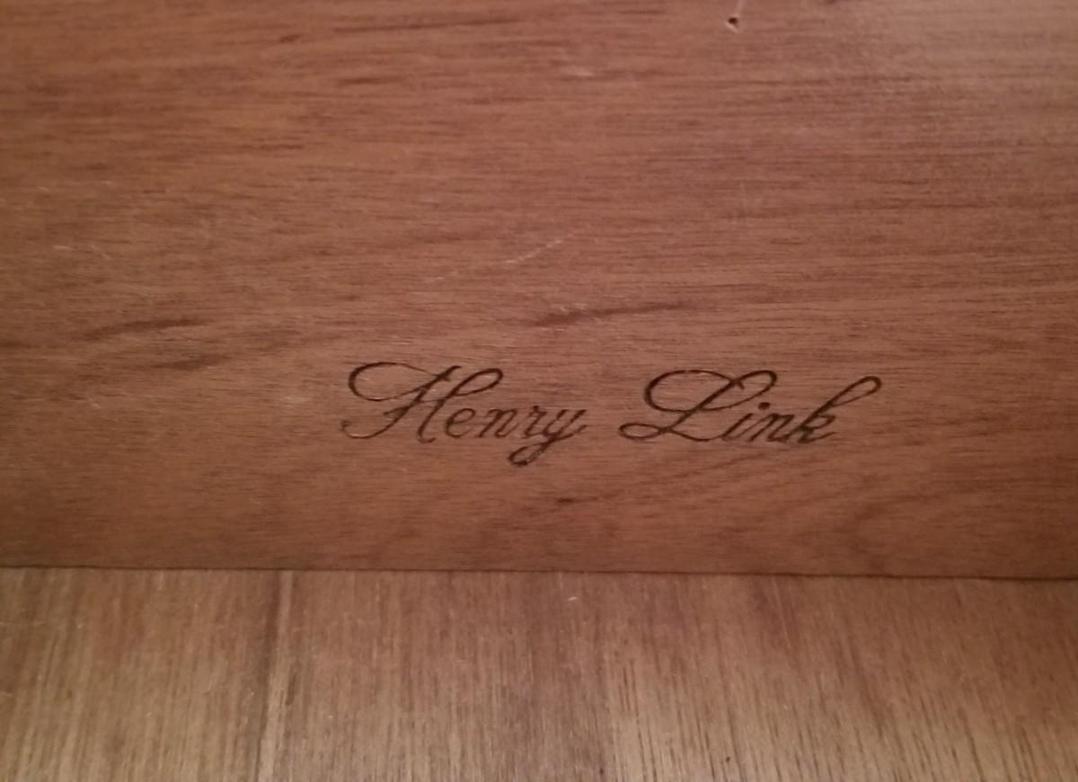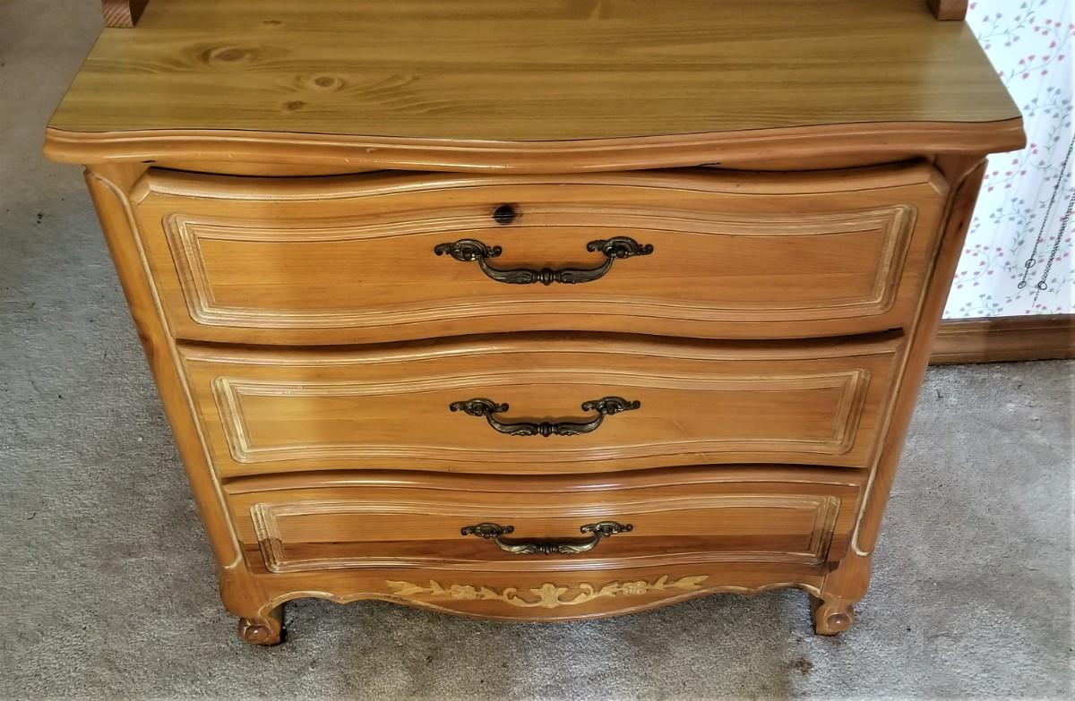 Vintage knotty pine bookcase/dresser combo - 2 pieces - made by the Henry Link Furniture Company - three drawers. 30" wide, 17.5" deep, 75" tall at tallest point. Gently used condition.