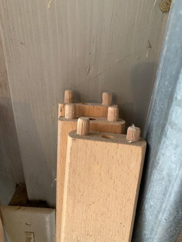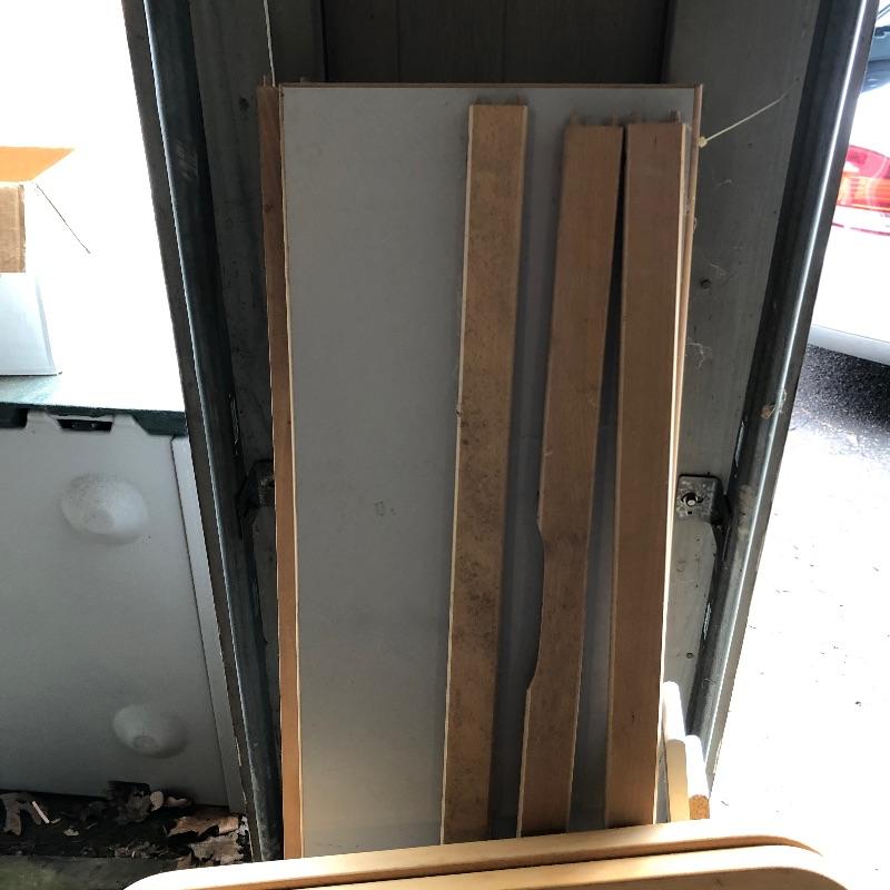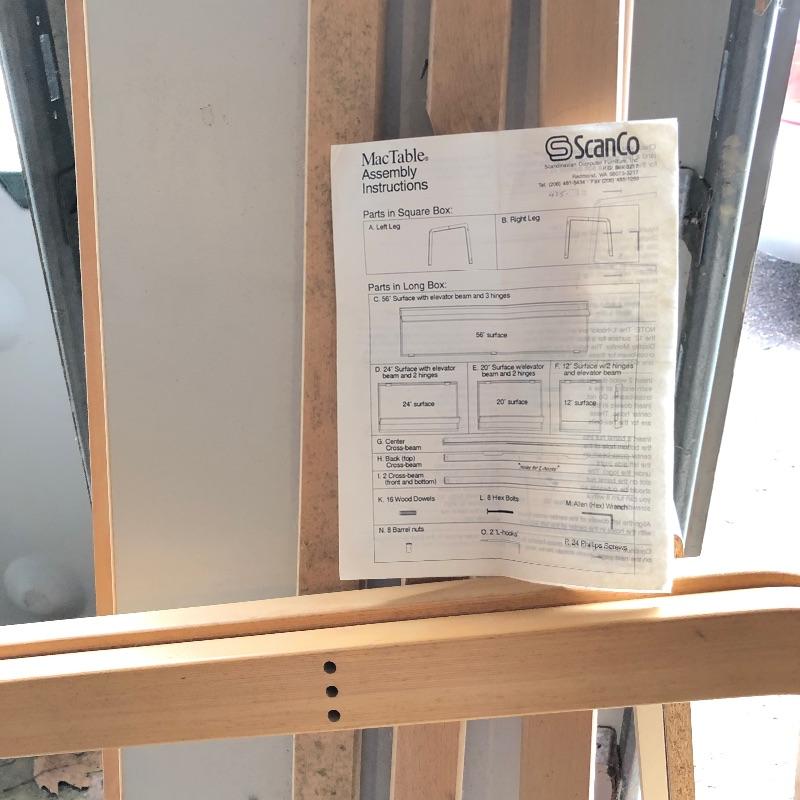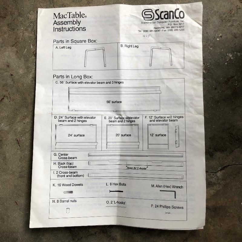 This Mac table is a combination of white and pinewood. It is only partially dismantled, so it should not take much effort to assemble. It comes with instructions and appears to have its components but we cannot guarantee that every single piece is accounted for as some of the smaller screws sin em to be missing but likely easy to find at a store. The height of the legs measures 31” at the highest point and the table measurements are shown on the photo of the manual. The table is very dirty as it was stored in an attic. It does not appear to have scratches but may have a few stains.