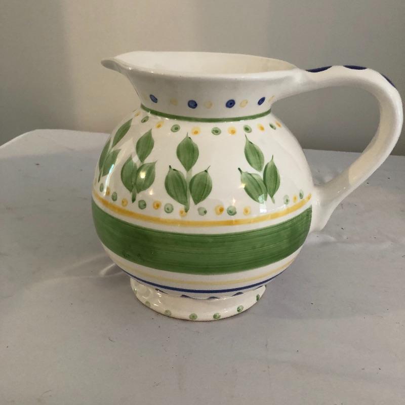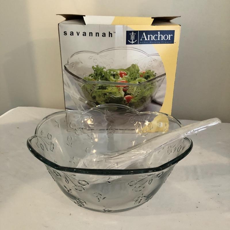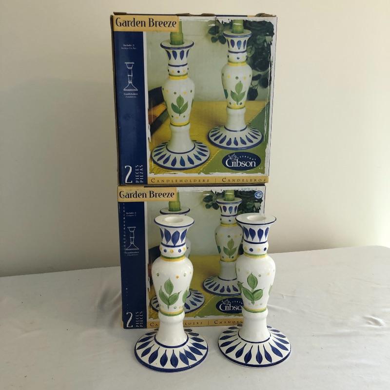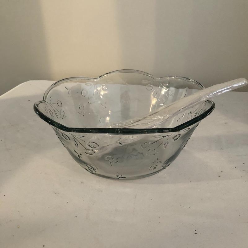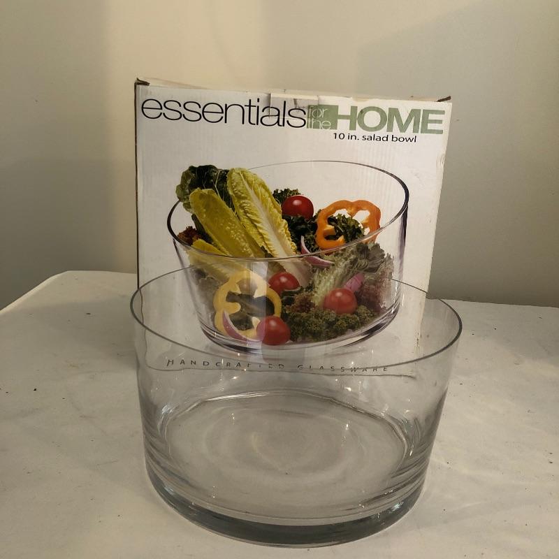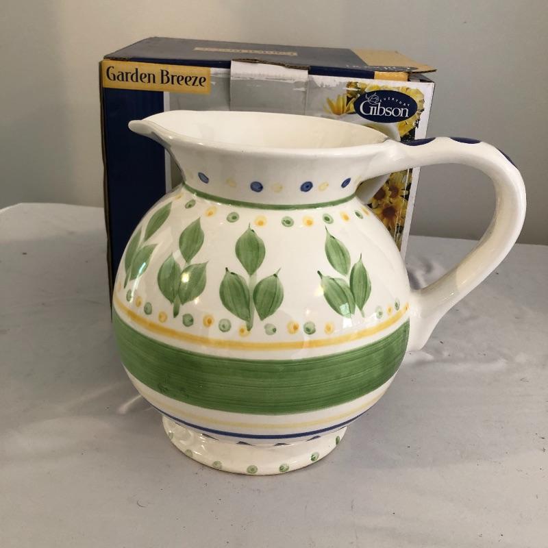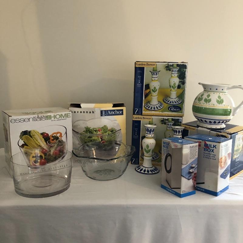 Get a great deal on this kitchen essentials. Lot includes Anchor Hocking glass bowl, Essential Homes glass bowl, Anchor Hocking bowl measures 11.5”D x 5” tall. two milk carton holders, Gibson pitcher with four matching candle holders.