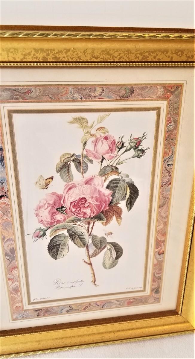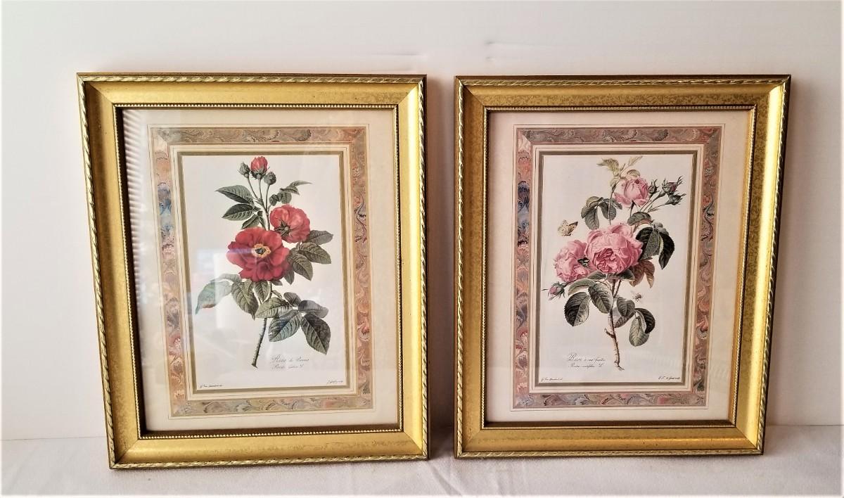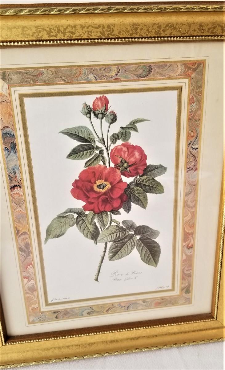 Nice pair of framed botanical prints - Roses - gold frames. Contemporary. 9.5" across and 12" tall (each).