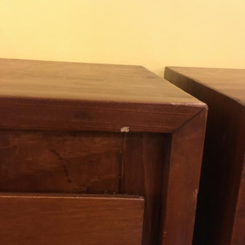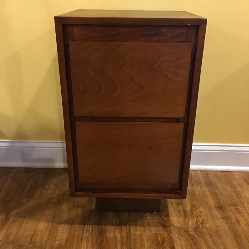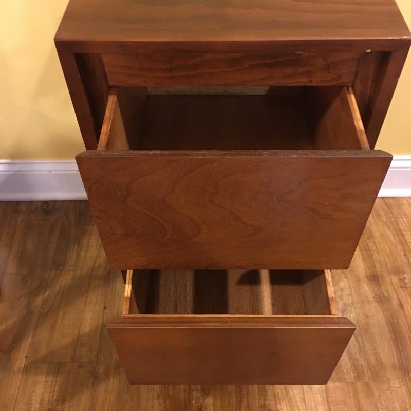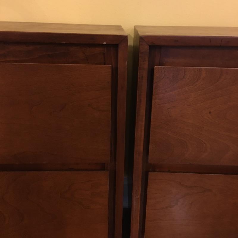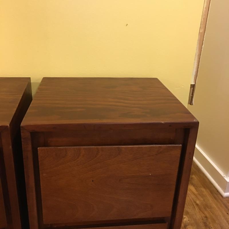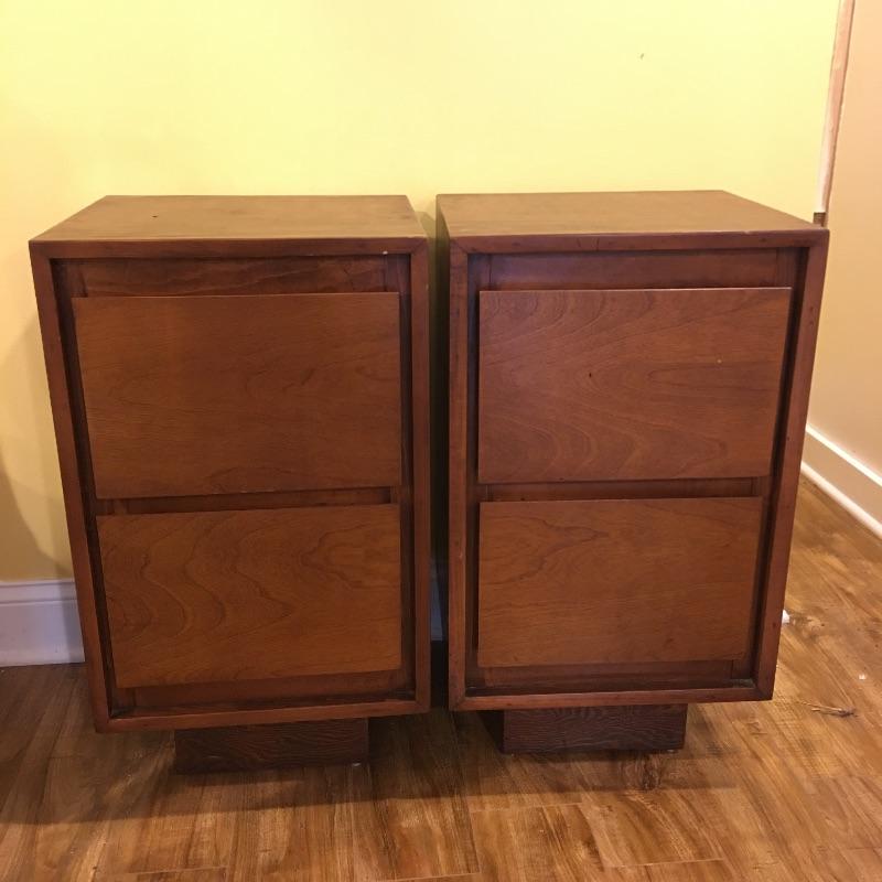 A nice pair of wooden end tables with two drawers. They have a MCM style to them. Tables have a few nicks, see pictures. Tables measure 15” x 16” x 28.5”.