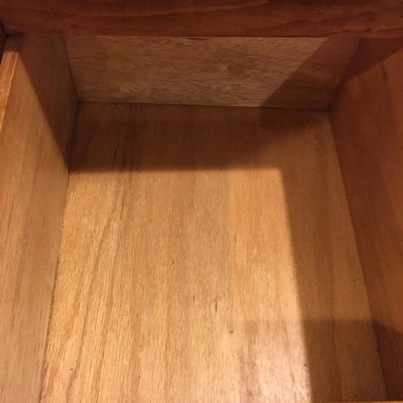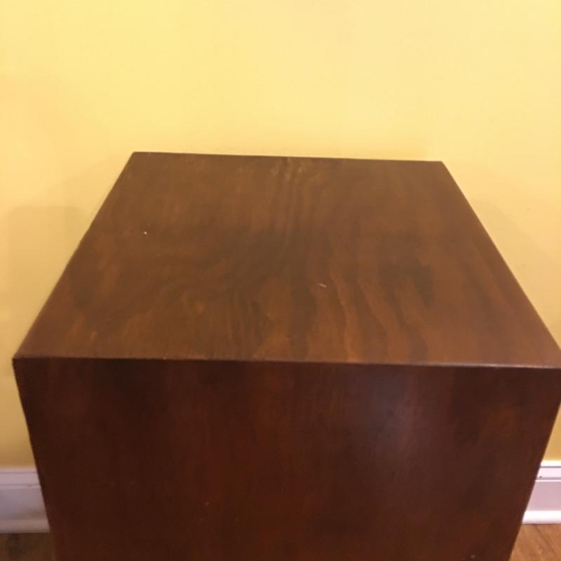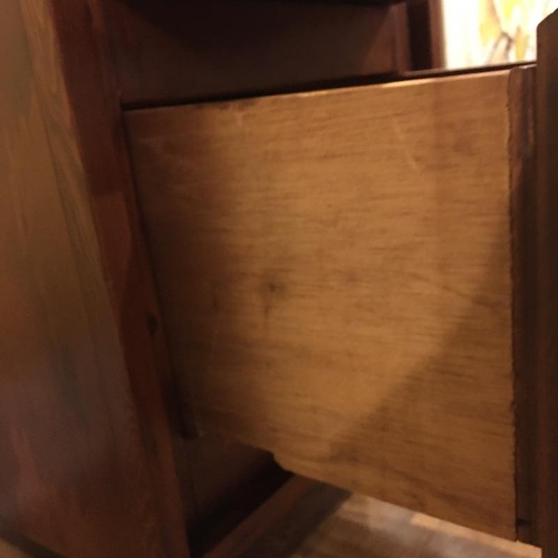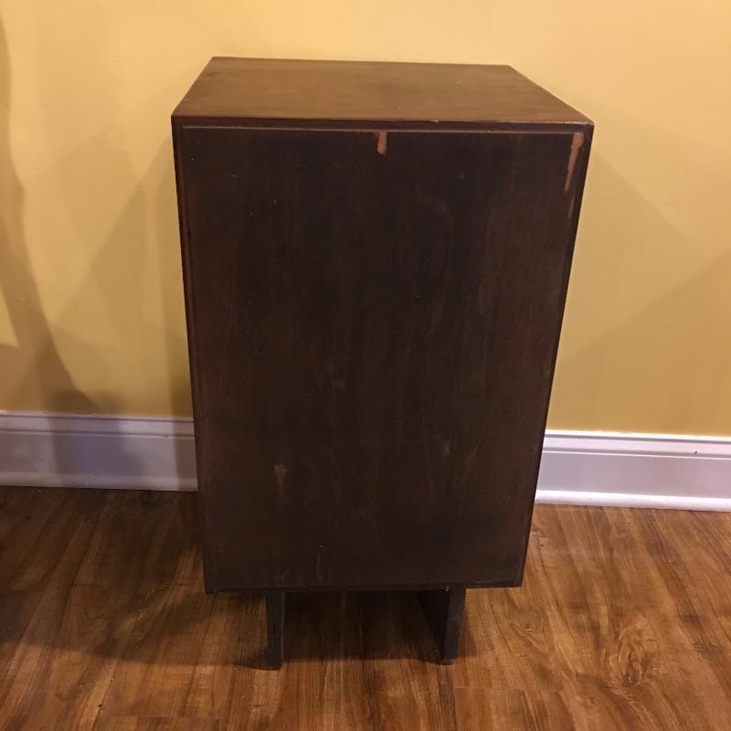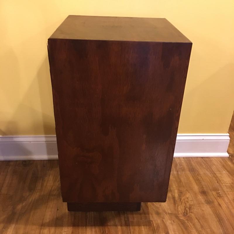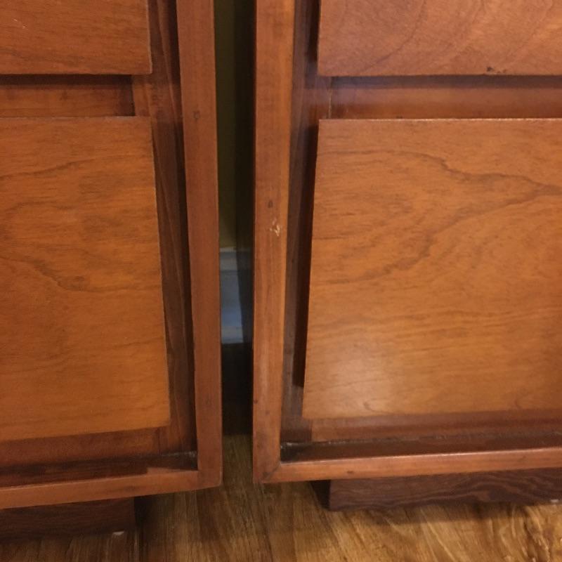 A nice pair of wooden end tables with two drawers. They have a MCM style to them. Tables have a few nicks, see pictures. Tables measure 15” x 16” x 28.5”.