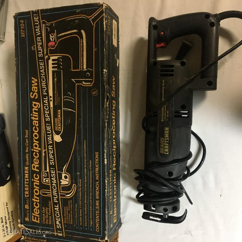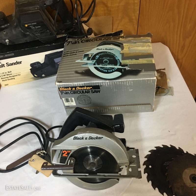 Electric Reciprocating saw, Ryobi Cordless drill, Craftsman 3/8 in. drill, B&D Belt Sander, B&D 1 1/4 in. Circular Saw. All ran when plugged in but are "as is where is" when picked up.