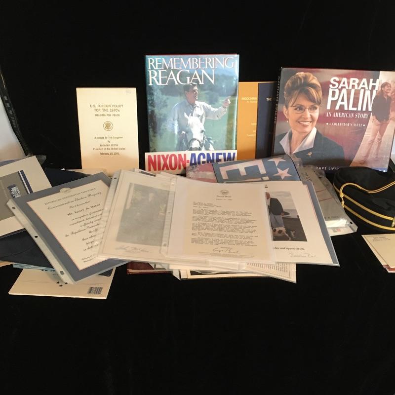 Presidential collection and more. Remembering Reagan is a limited edition book. Lot also includes Nixon campaign poster, pictures of Bush, Carter,Reagan, Dole with what appears to be auto signatures and more. Also includes copies of Nixon’s state of the address, Sarah Palin Story, The Torch is Passed and many more items, see pictures. A must have for political fan in your home.