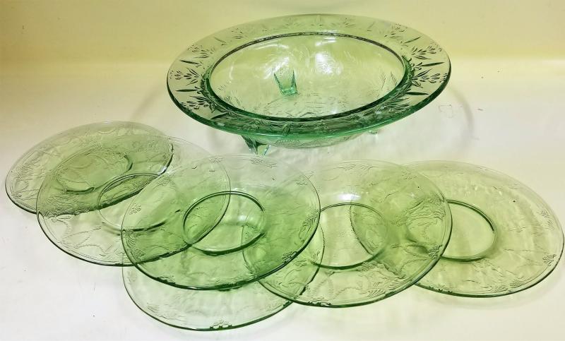 Green decorative glassware six small plates and one serving bowl