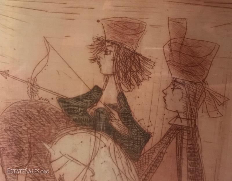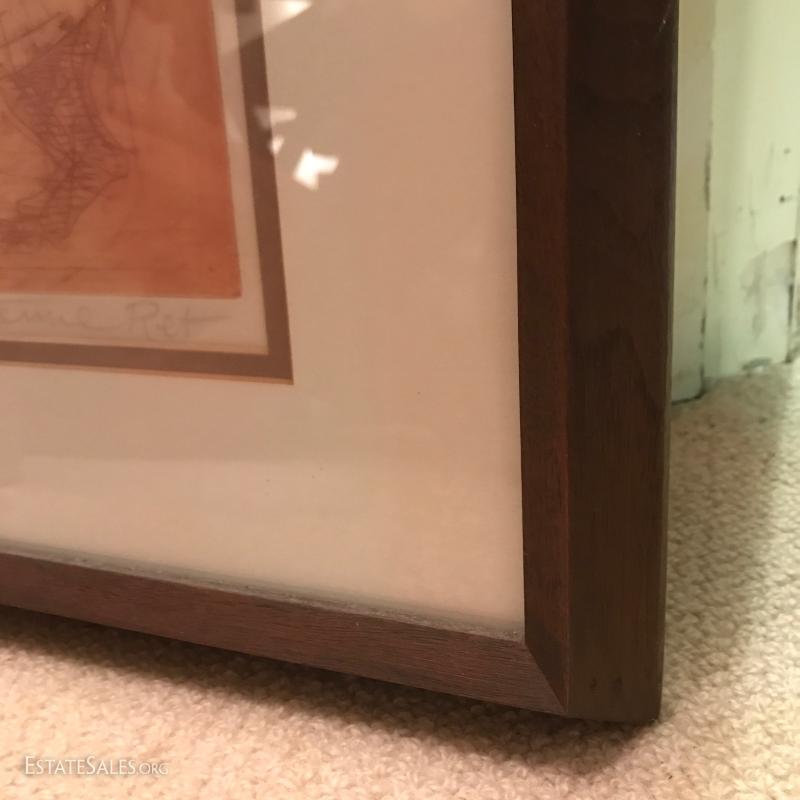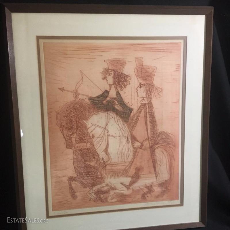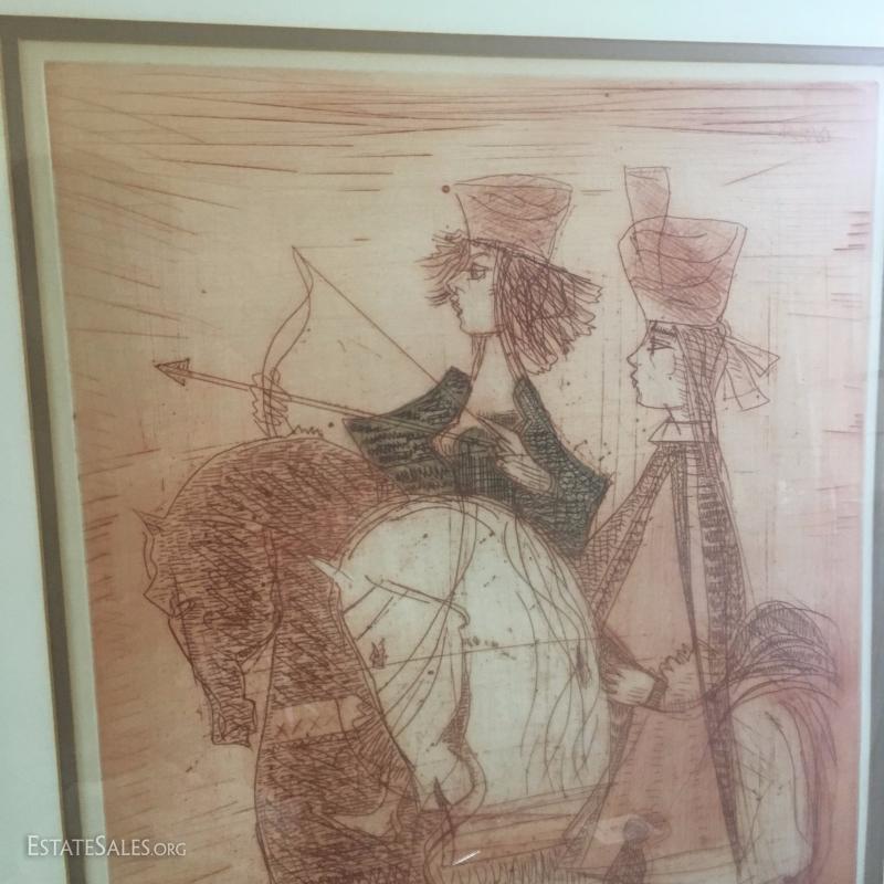 Horses and riders shooting an arrow in this red toned Eitienne Ret signed limited edition art. Number 87 of 100. Double matted and framed in nice dark wood. Colors may not convey in photos.