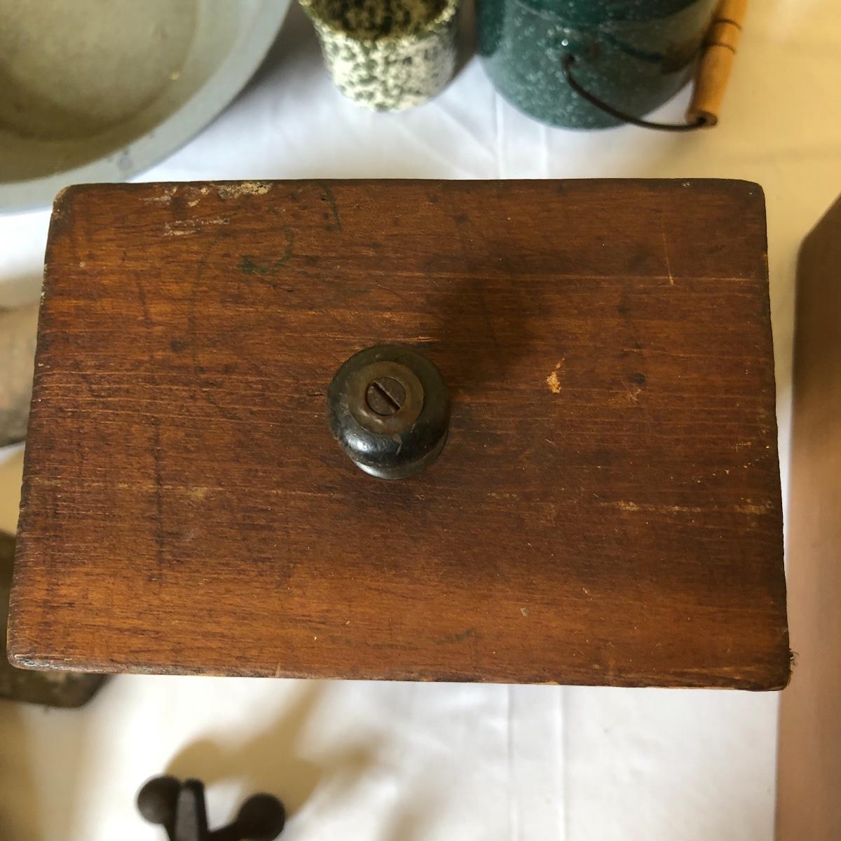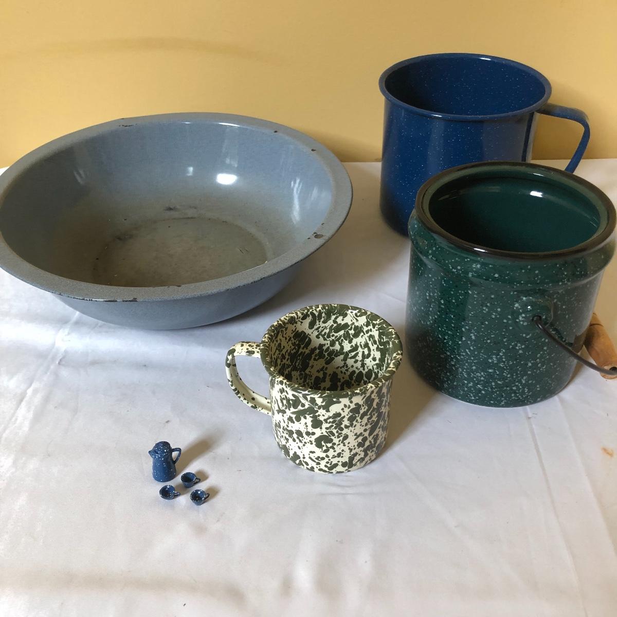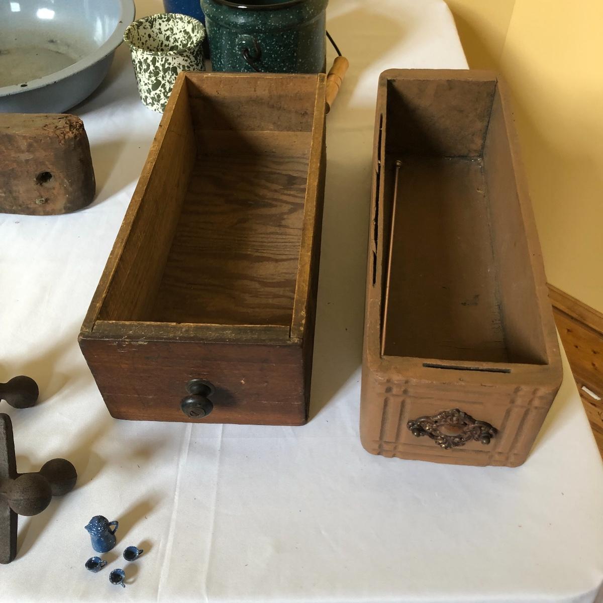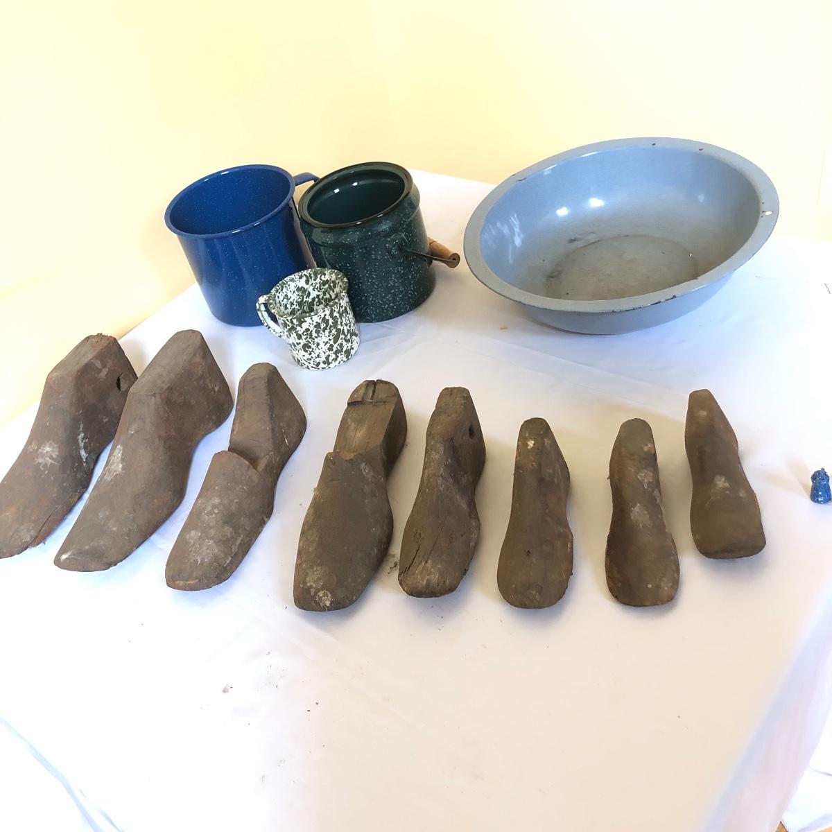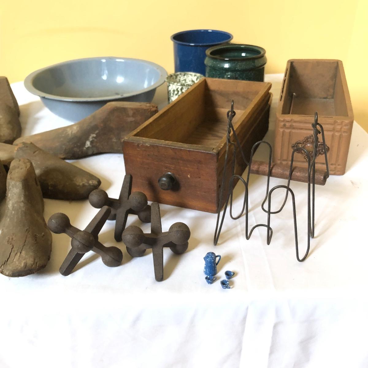 Mostly antique items in this lot with a few newer (made to look vintage) thrown in. The most unique of these items has to be the shoe-maker's wooden forms in various foot sizes and a primitive ball jar holder/carrier that is metal with a wooden handle. Two random antique drawers are included along with a large metal bowl that is pretty scratched from use. As for the newer items, there is a mini camping kettle that’s one inch high with mini cups and saucers, three rustic metal Jacks, two metal mugs (large one filled with marbles), a handled canister and a maroon speckled jug (this was added to the lot later and is not in the main image).